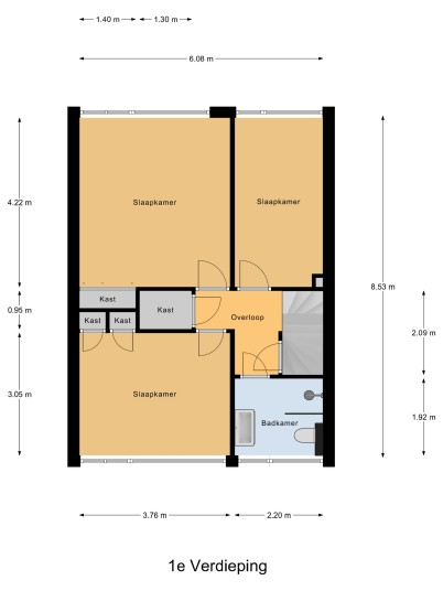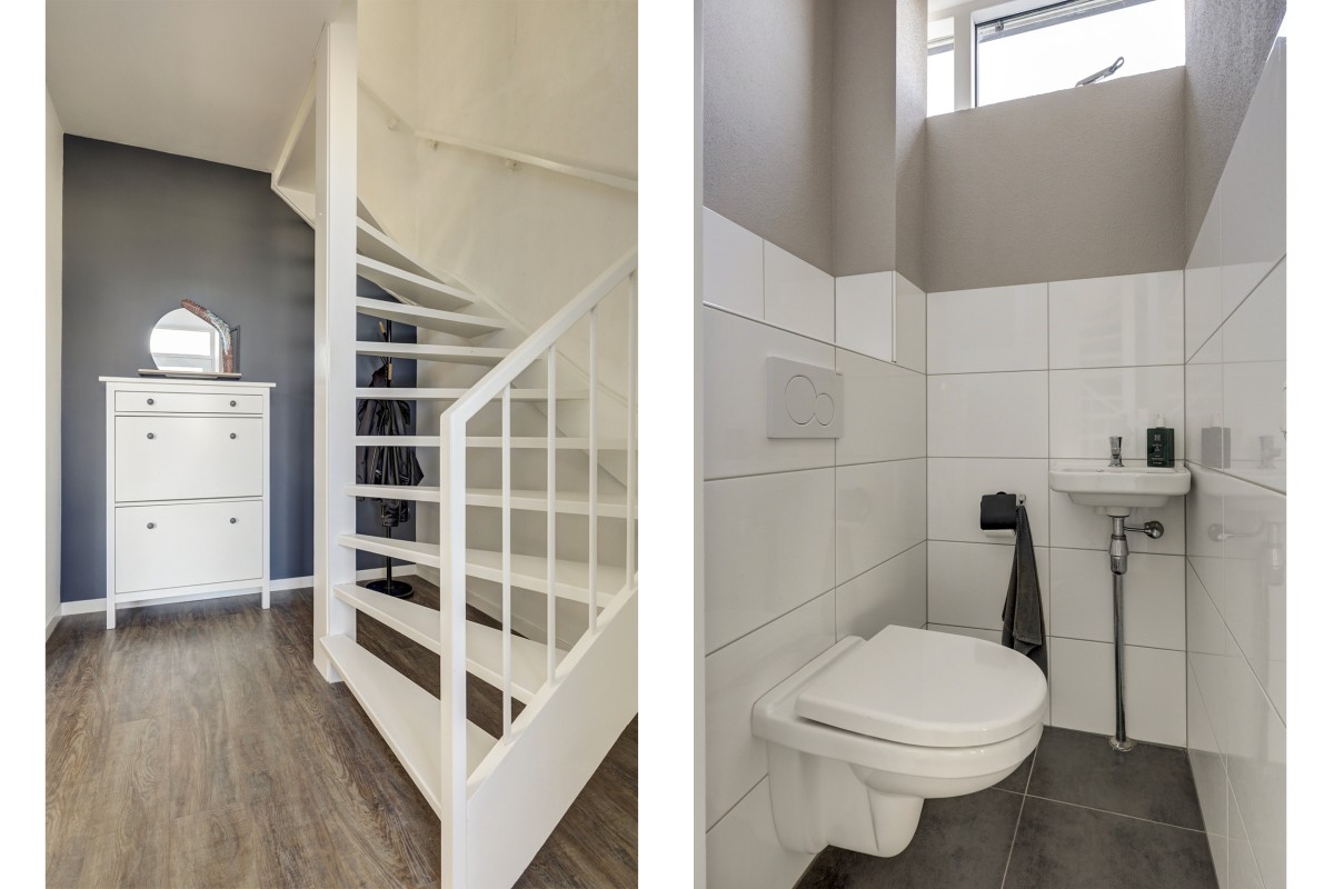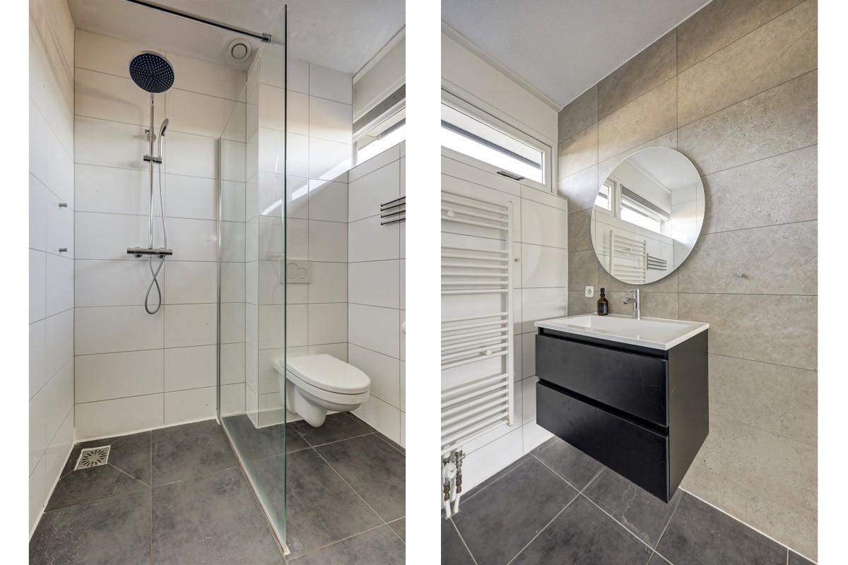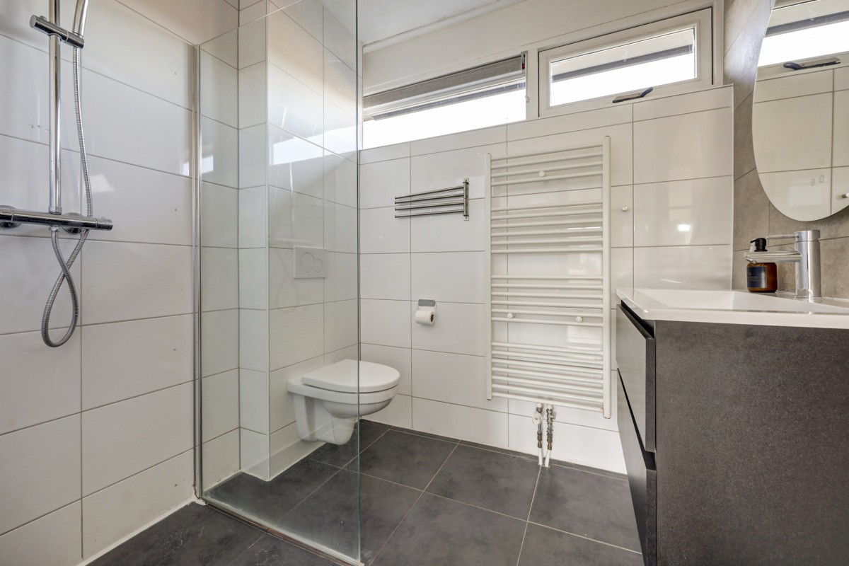Eerste verdieping: overloop, moderne badkamer met inloopdouche, hangend toilet, wastafelmeubel, designradiator en te openen raam. Drie slaapkamers, waarvan twee ruime kamers met inbouwkast. Extra bergkast op de overloop.
