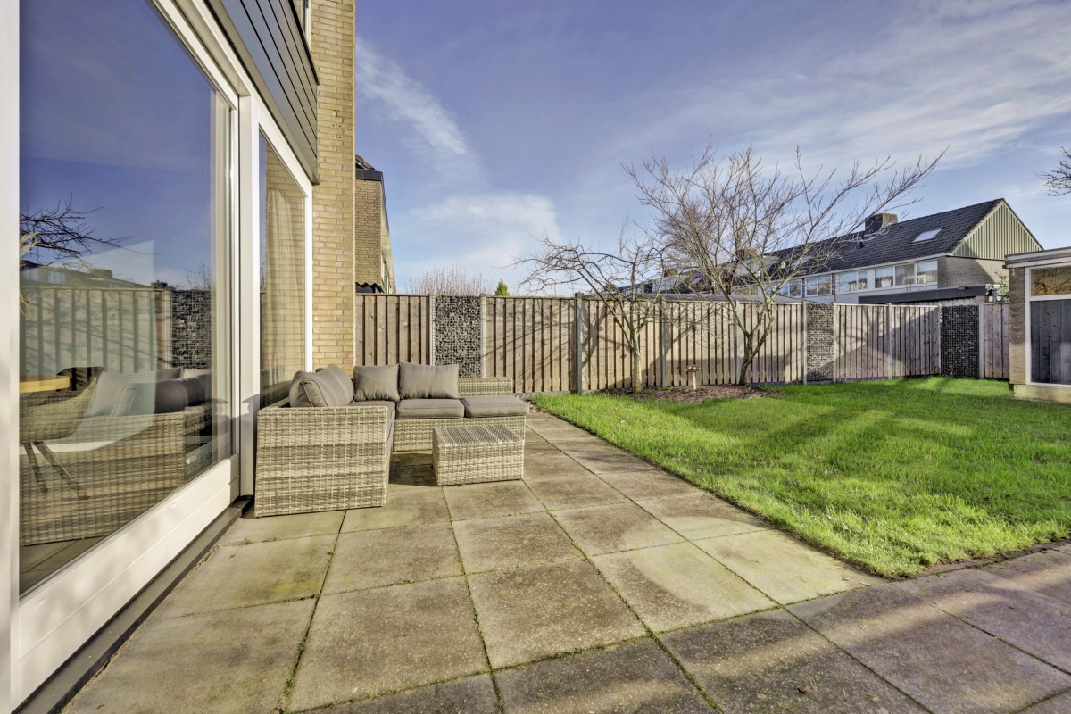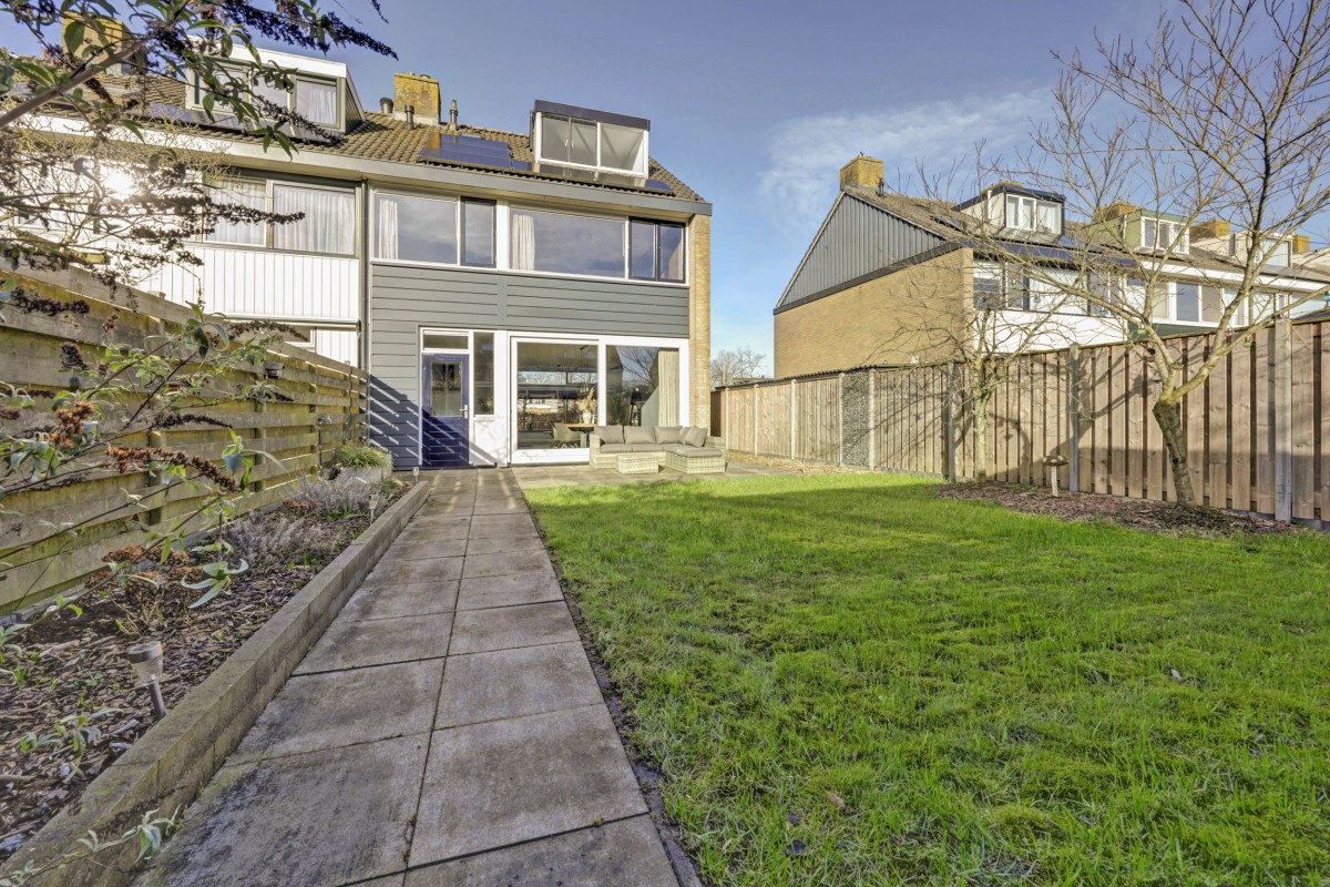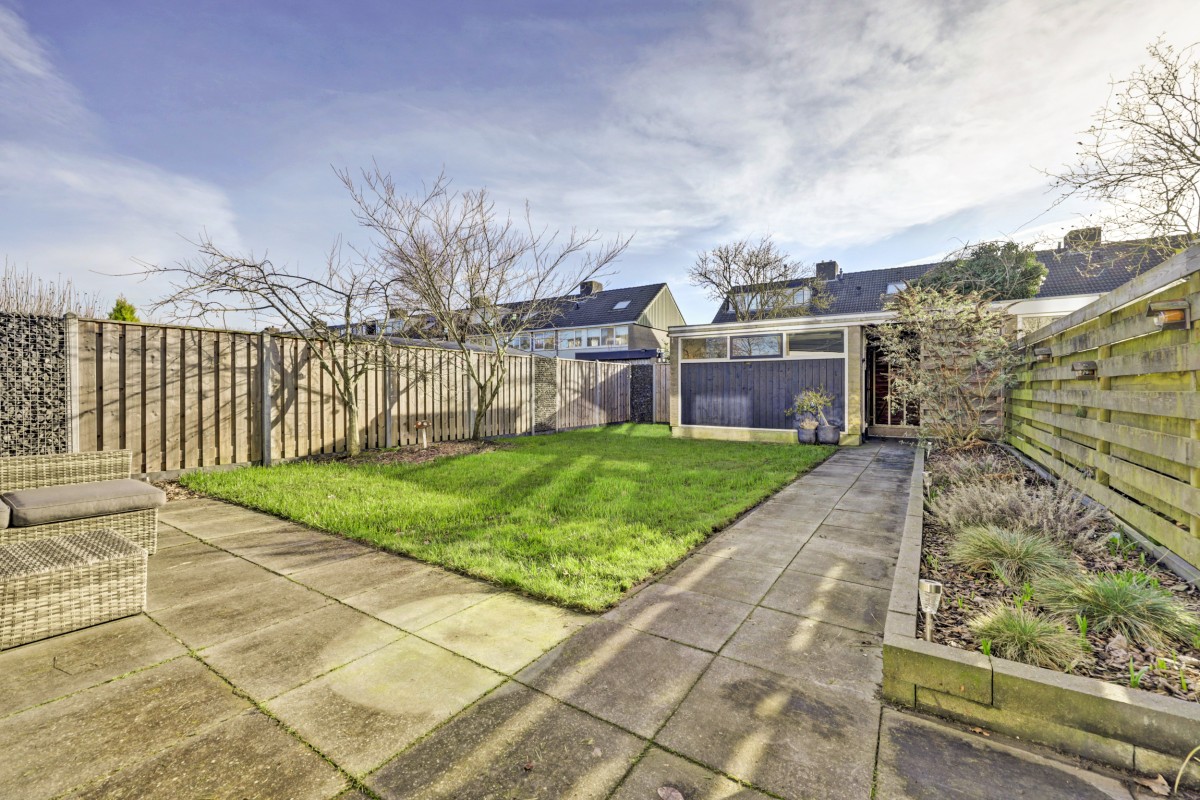 Tuin: de tuin is aangelegd met gazon, bestrating en beplanting. Naast de woning bevindt zich een brede strook met mogelijkheden voor het realiseren van een garage of berging. De achtertuin beschikt over een berging, overkapping en een achterom en is voorzien van een degelijke schutting met betonpalen.