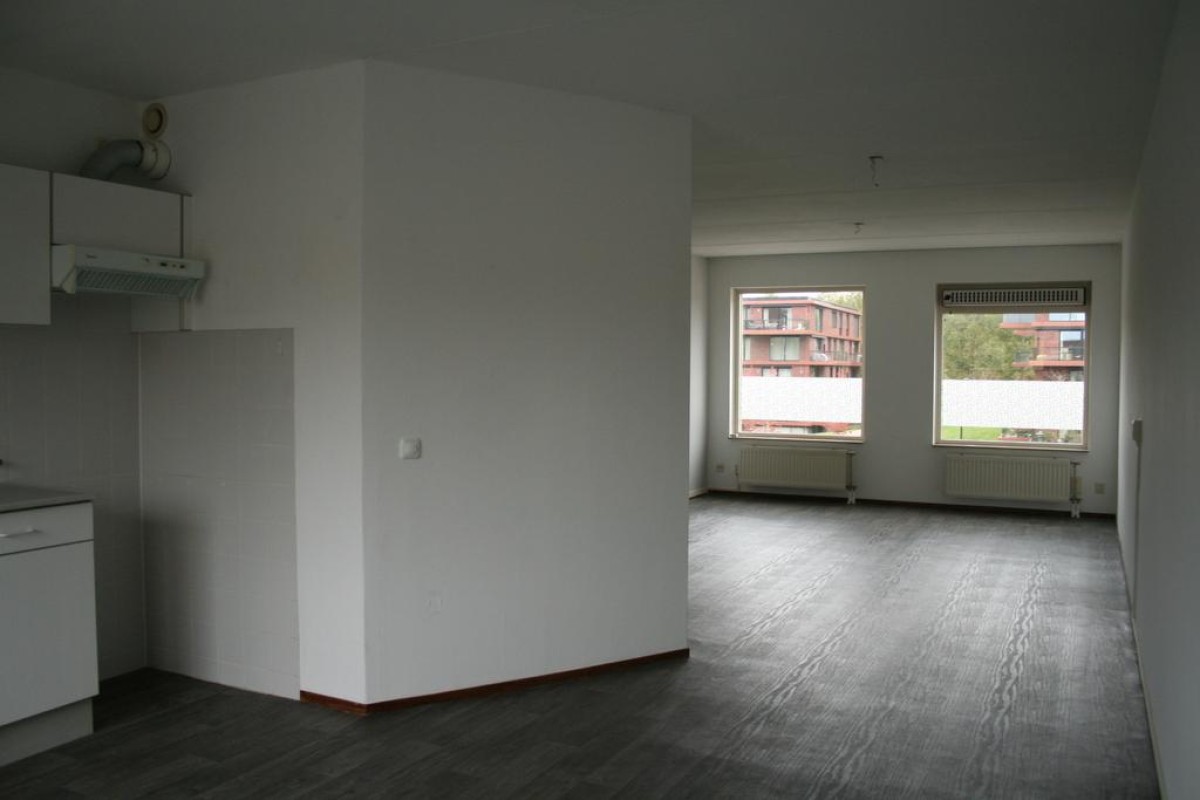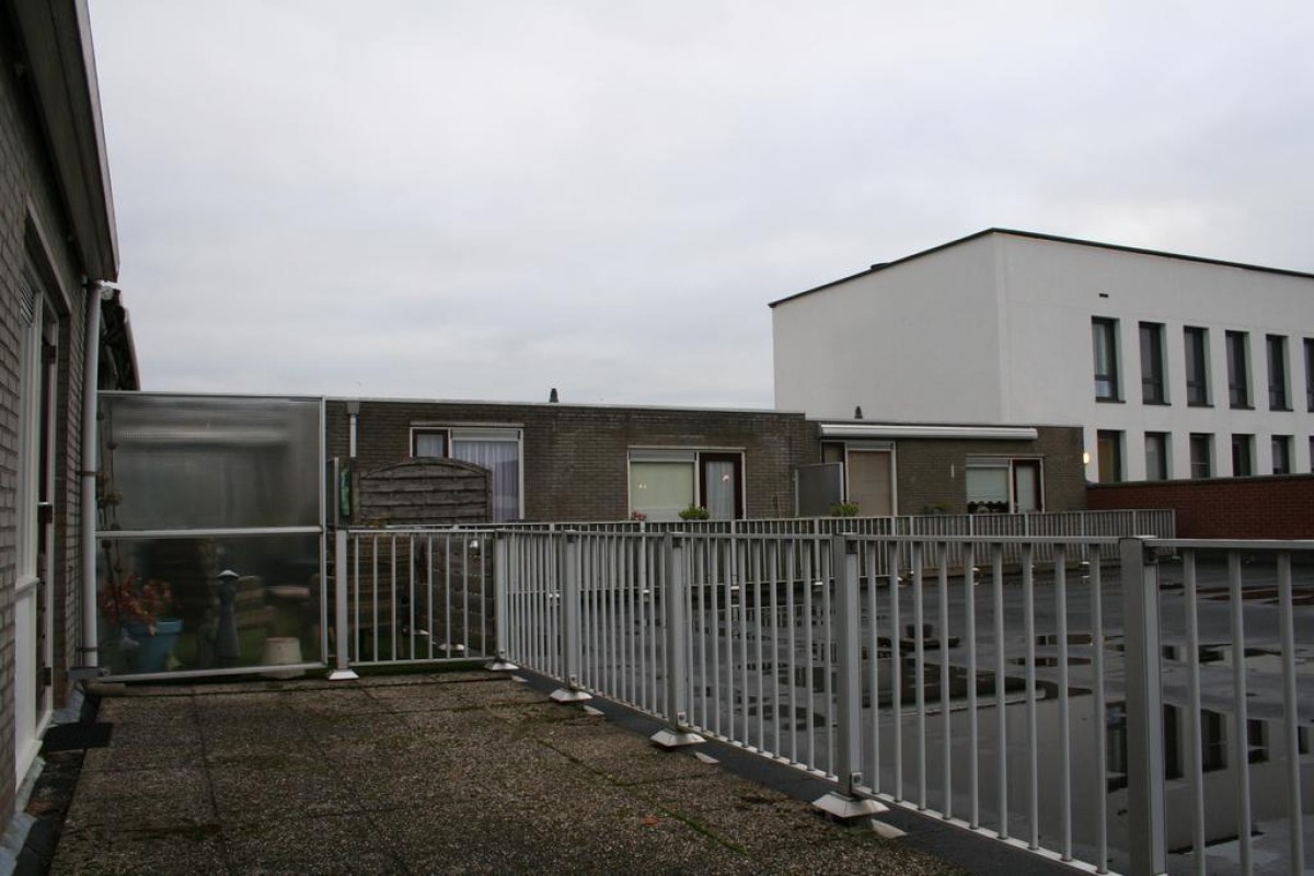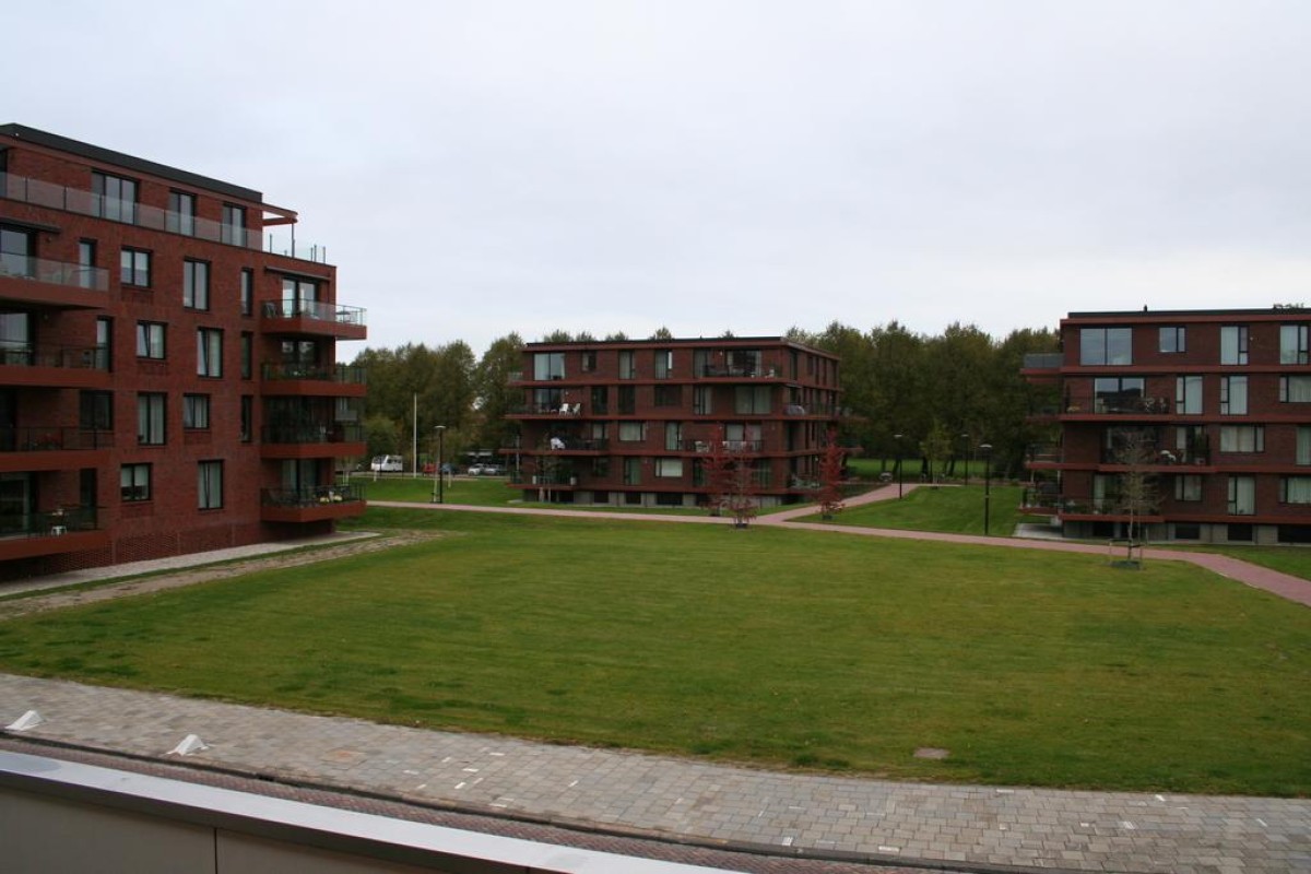 Eerste verdieping: Galerij met overdekt entree naar het appartement, hal met garderobe, meterkast, inpandige berging met cv-ketel, badkamer met wastafel, wasmachineaansluiting en douche, 2 ruime slaapkamers, woonkamer met vrij uitzicht en aansluitend de keuken met keukenblok en doorgang naar het riante zonneterras op het zuiden.