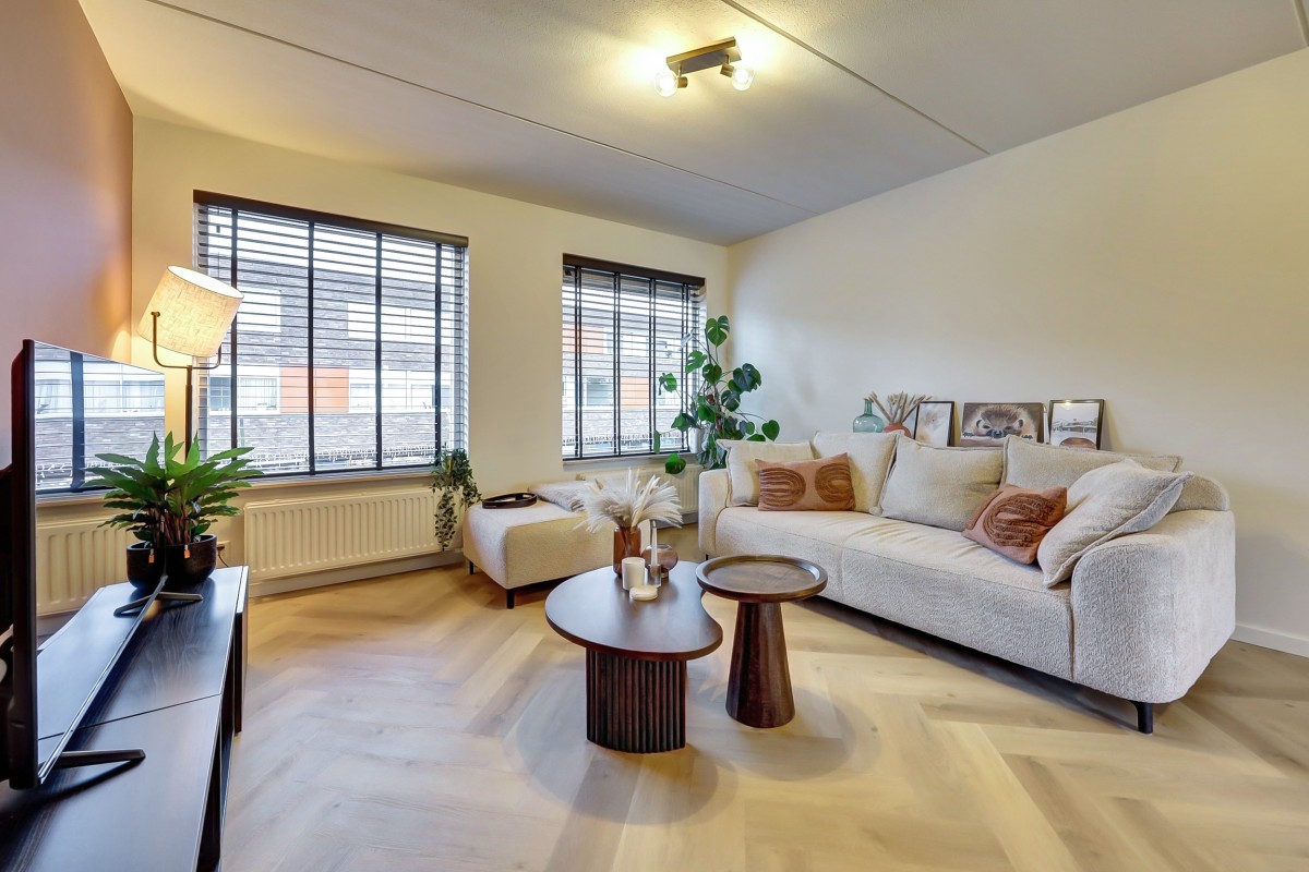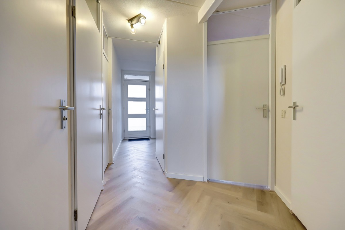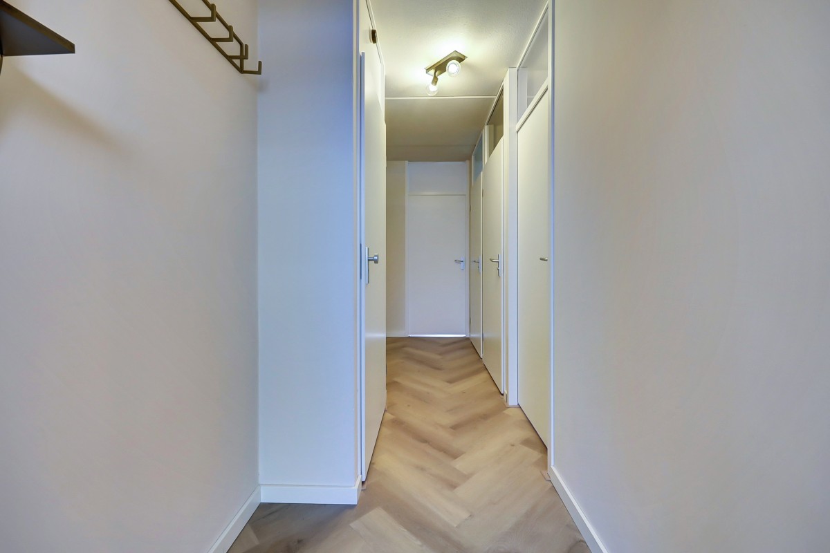 Eerste verdieping: galerij met overdekt entree naar het appartement, verhoogde entree, hal met garderobe, meterkast met vernieuwde groepenkast (2024), toilet ruimte met fonteintje, een inpandige berging met de opstelplaats voor de cv-ketel, vernieuwde mechanische ventilatie (2025) en opstelplaats voor de wasapparatuur. Moderne badkamer (2025) uitgevoerd in witte marmer betegeling en voorzien van een wastafel met meubel, een spiegel met verlichting en verwarming, een designradiator en een ruime inloopdouche. Aan de hal bevinden zicht tevens twee ruime slaapkamers en toegang tot de lichte woonkamer met grote raampartijen en vrij uitzicht op de winkelstraat met aansluitend de eethoek met moderne open keuken (2024).