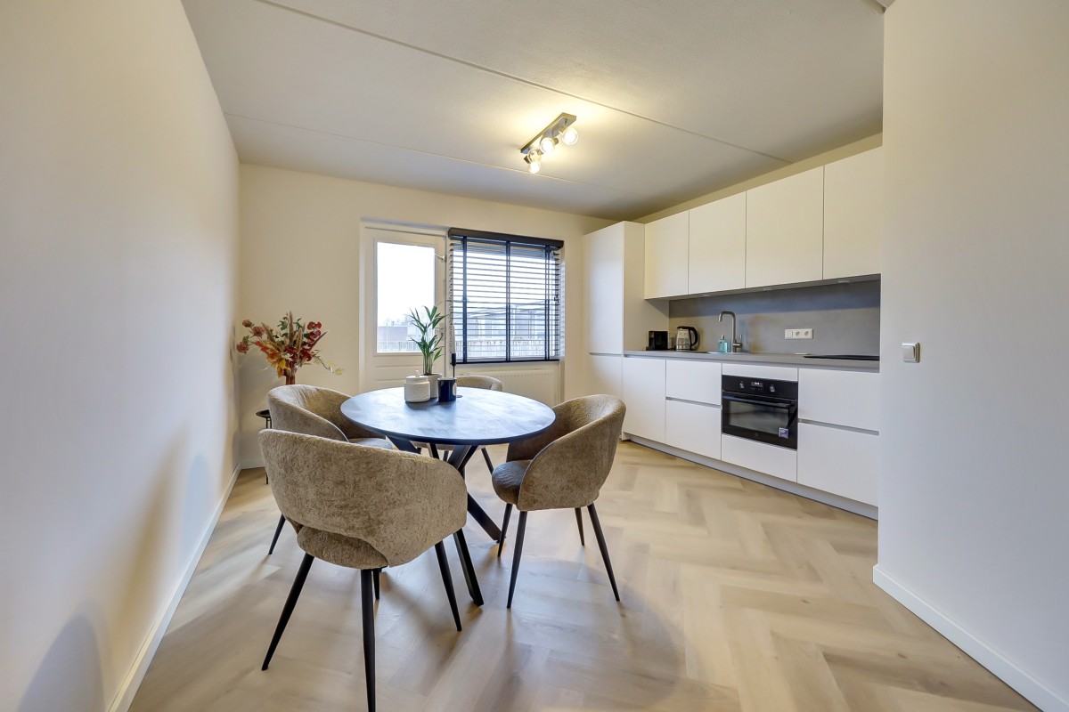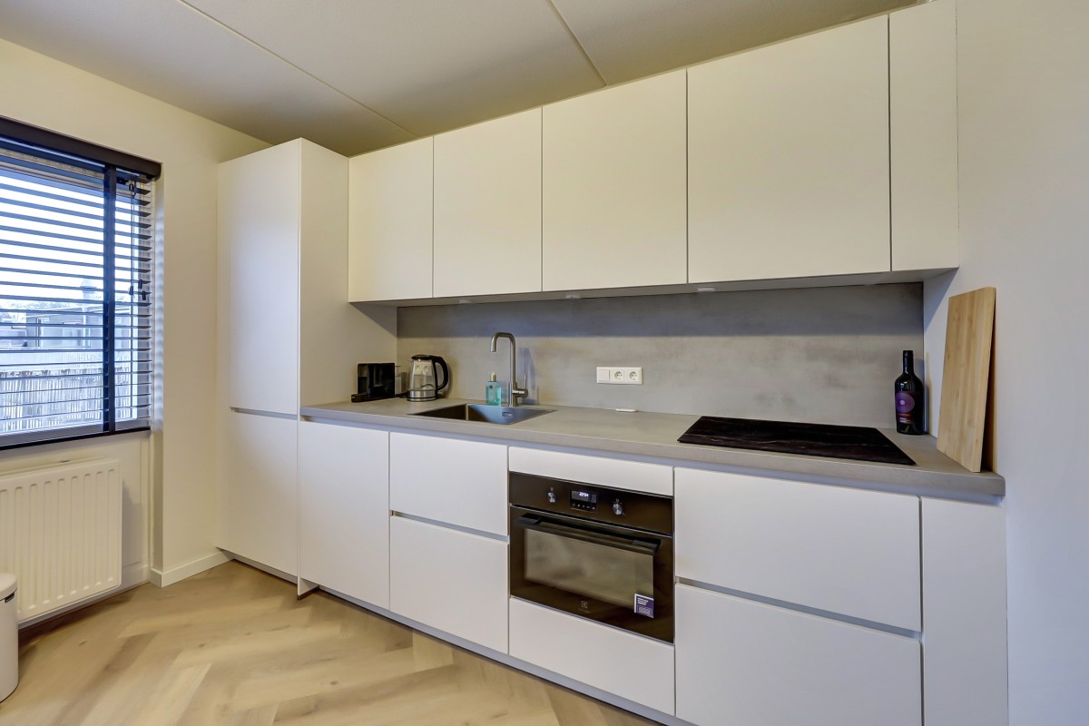 De moderne keuken is in een rechte opstelling geplaatst en voorzien van strakke witte fronten met een lichtgrijs werkblad. De keuken is voorzien van een ingebouwd koel-/vriescombinatie, een oven, een vaatwasser, een Bora inductie kookplaat met down-draft afzuiging. Vanuit de keuken is middels een loopdeur de doorgang naar het riante zonneterras op het westen. Het gehele appartement is voorzien van een fraaie pvc visgraatvloer. (2024)