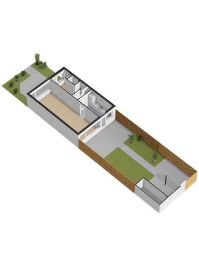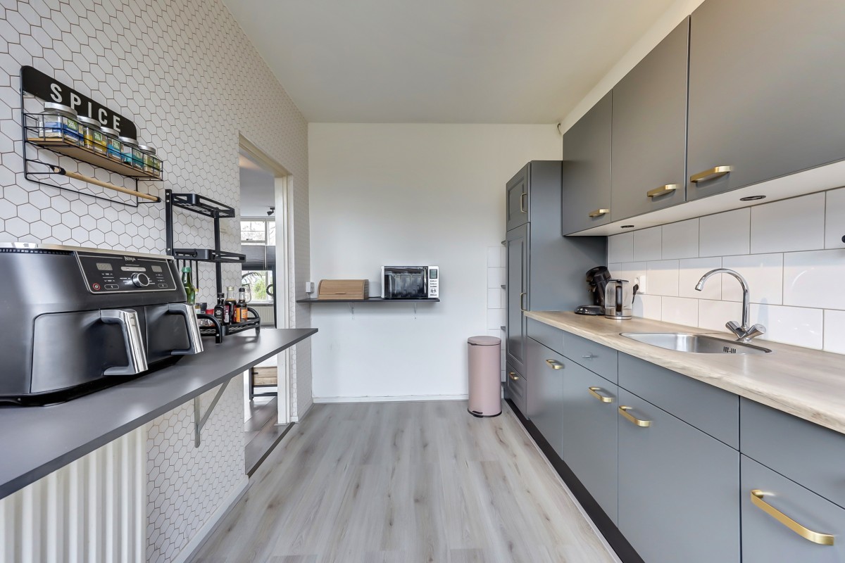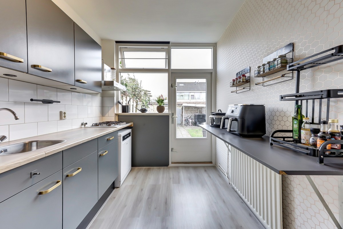 Lees verderDe keuken, uitgevoerd in een donkere kleurstelling, sluit direct aan op de woonkamer. Deze is voorzien van een inbouwkoelkast, 5-pits gaskookplaat, afzuigschouw en losse vaatwasser. Via de deur in de keuken loop je zo de achtertuin in. De tuin ligt op het oosten en beschikt over een achterom en een houten berging.