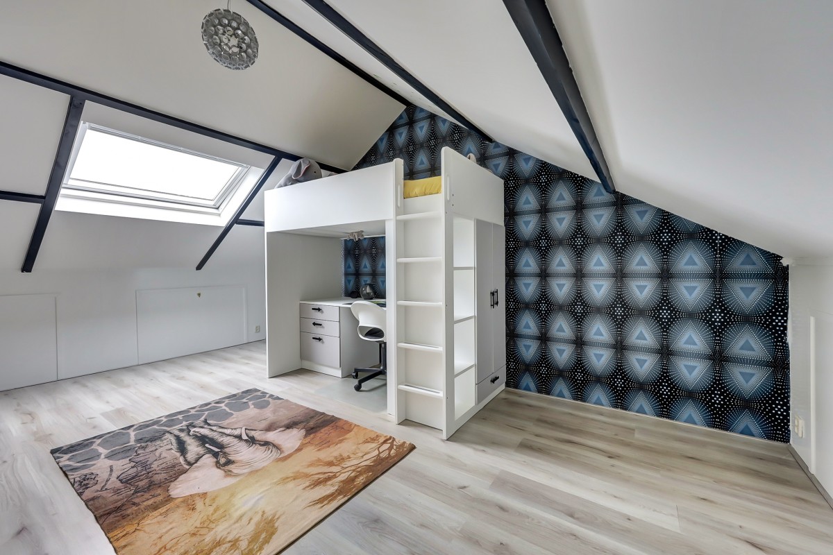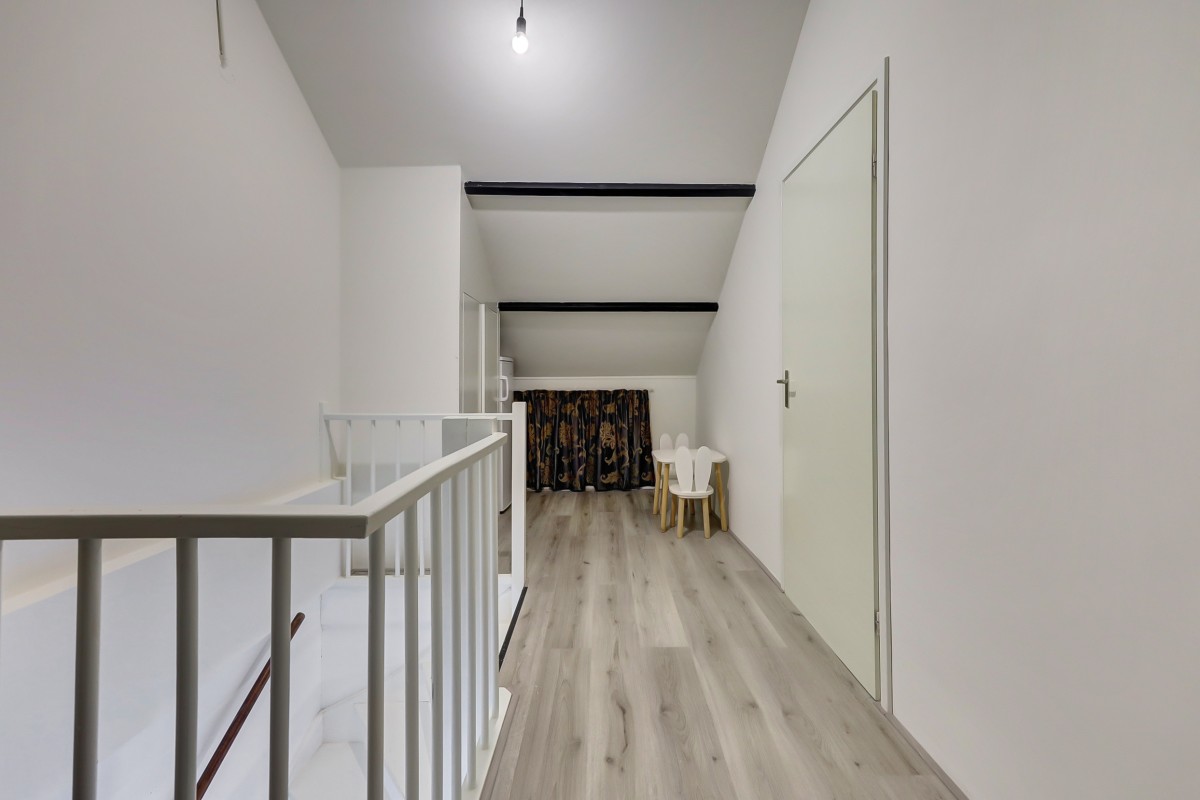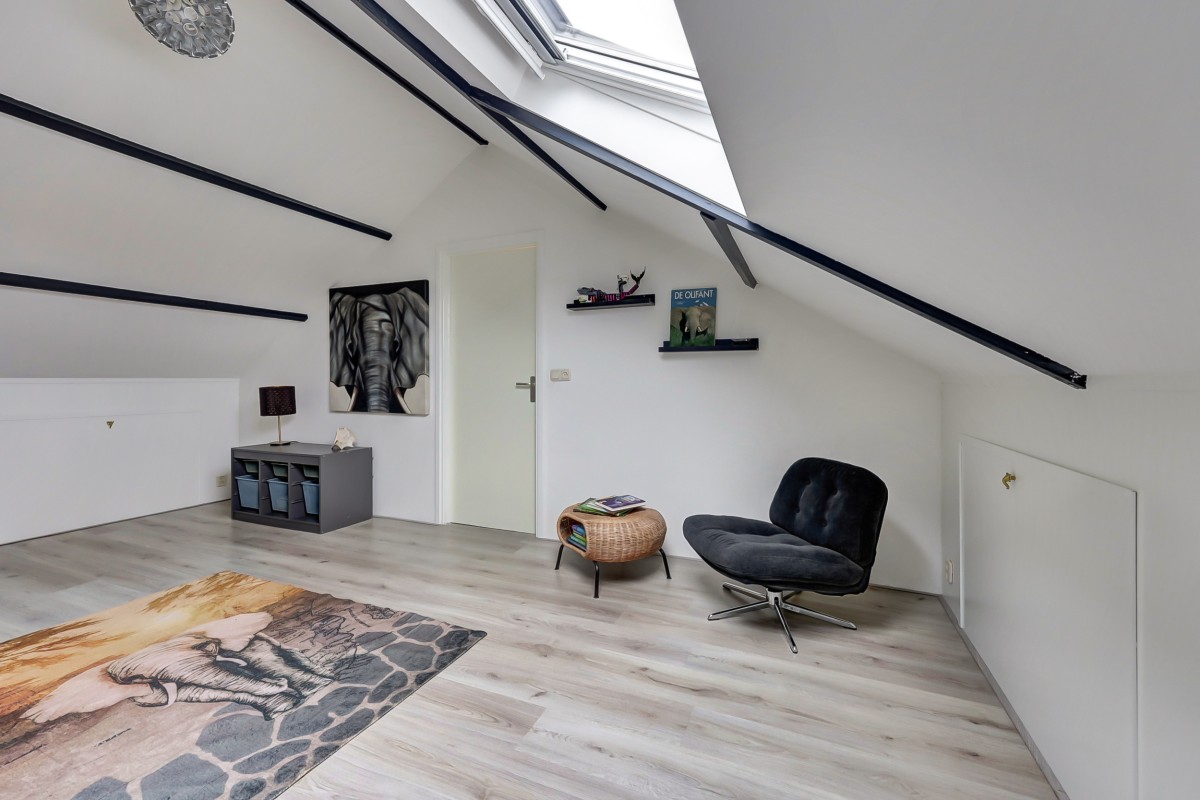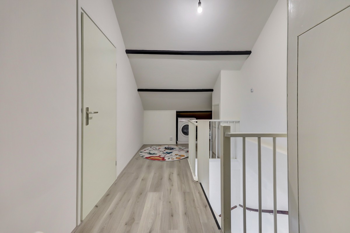 De vaste trap brengt je naar de tweede verdieping. Op de voorzolder vind je de aansluitingen voor de wasmachine, de mechanische ventilatie en de cv-ketel, die netjes is weggewerkt in een kast. Daarnaast is er een royale vierde slaapkamer met dakraam.