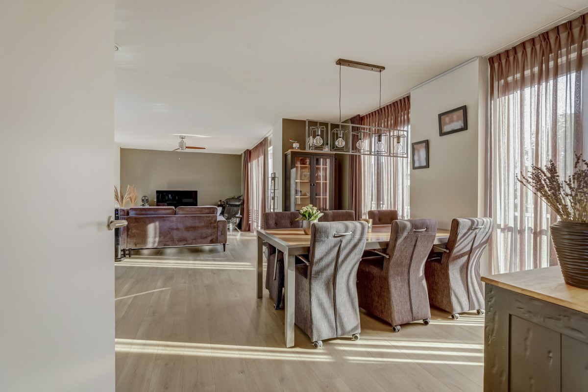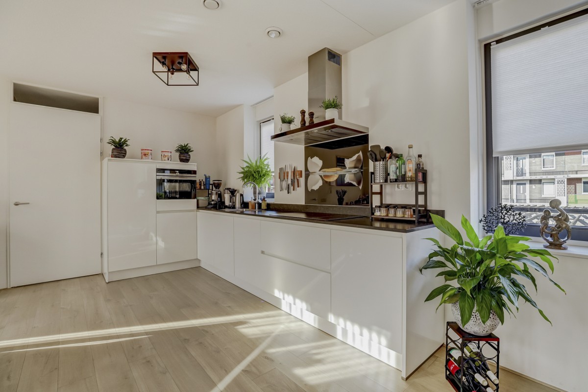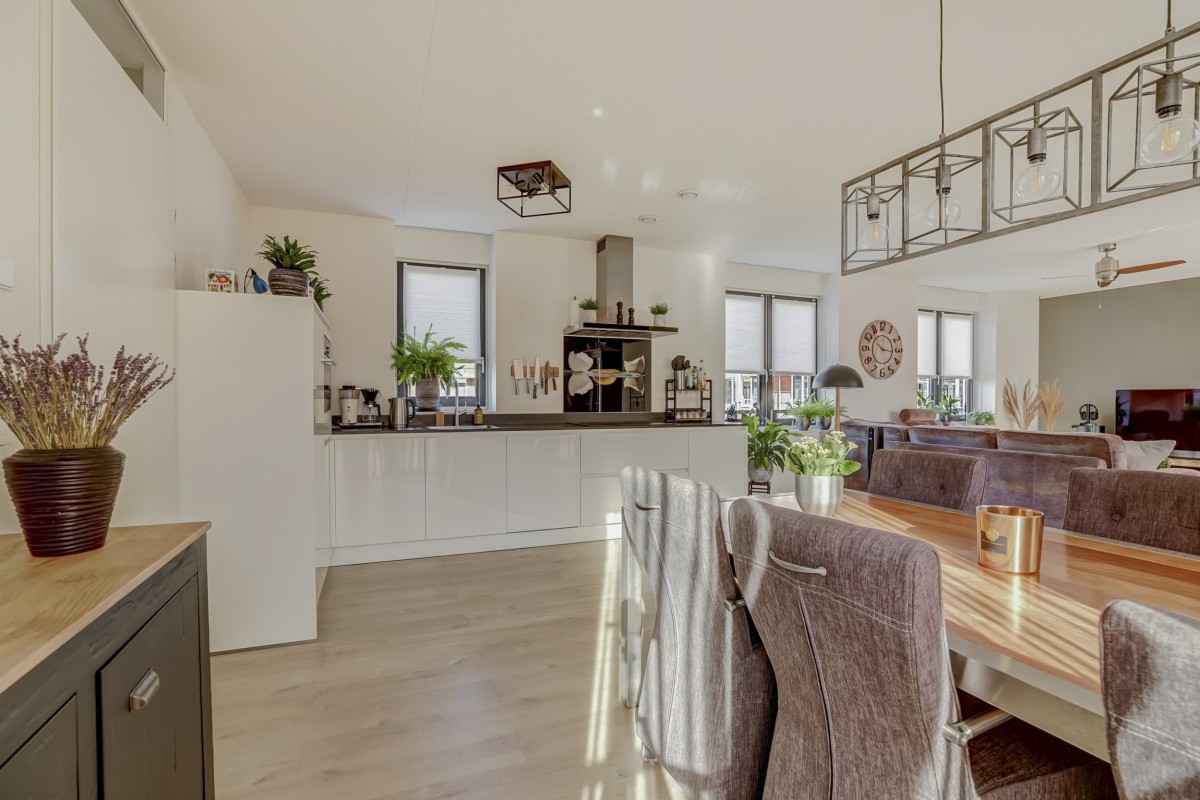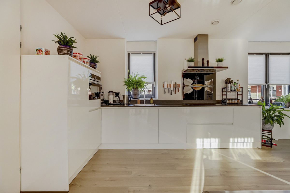 Lees verderDe woonkeuken is ruim en licht, biedt plaats aan een royale eettafel en is uitgevoerd in een hoekopstelling. Deze is voorzien van diverse Bosch-inbouwapparaten, waaronder een vaatwasser, inductiekookplaat, koelkast en afzuigkap.