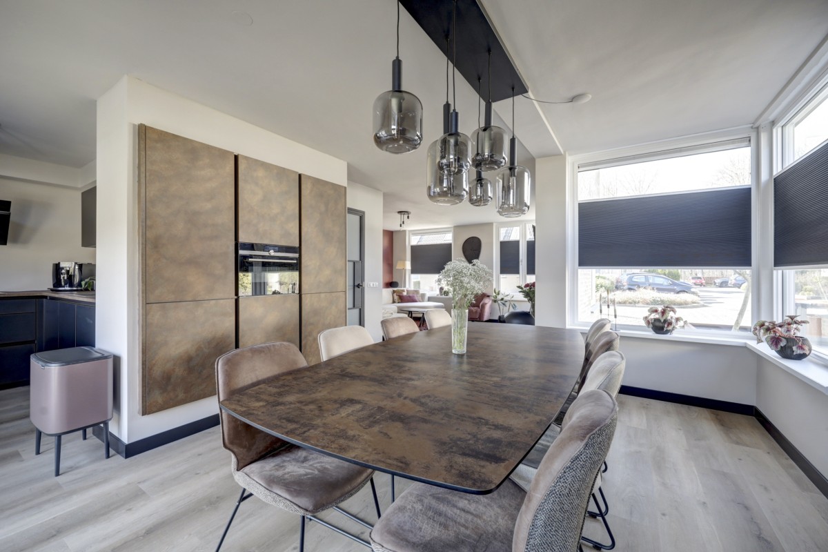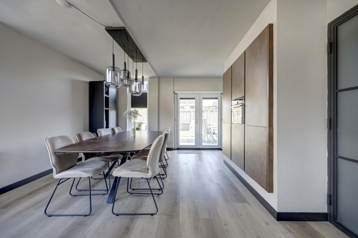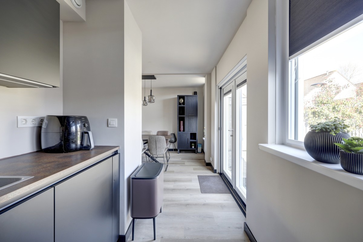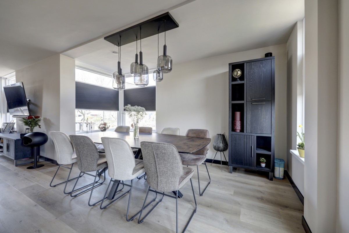 Ground floor: covered entrance, hall with wardrobe, meter cupboard with fiber optic connection, stairs to the upper floors, modern toilet room with wall-mounted toilet and washbasin (2026), steel-frame glass door to the spacious street-facing living room, which features underfloor heating with a PVC floor and an additional side extension with a corner window where the spacious dining area is situated, adjacent to the modern open kitchen featuring a corner kitchen unit and a wall element in the dining area. The kitchen is equipped with various built-in appliances, namely a refrigerator, boiling water tap, dishwasher, steam oven, 5-burner induction hob, and an extractor hood. French doors provide access to the lovely garden, which is secluded and features various terraces with decorative paving, a lawn, an attractive concrete post fence, a back entrance, and a wooden shed. From the garden, there is a pedestrian door to the attached garage, which has double wooden doors opening onto the driveway with parking space on the property for several cars.