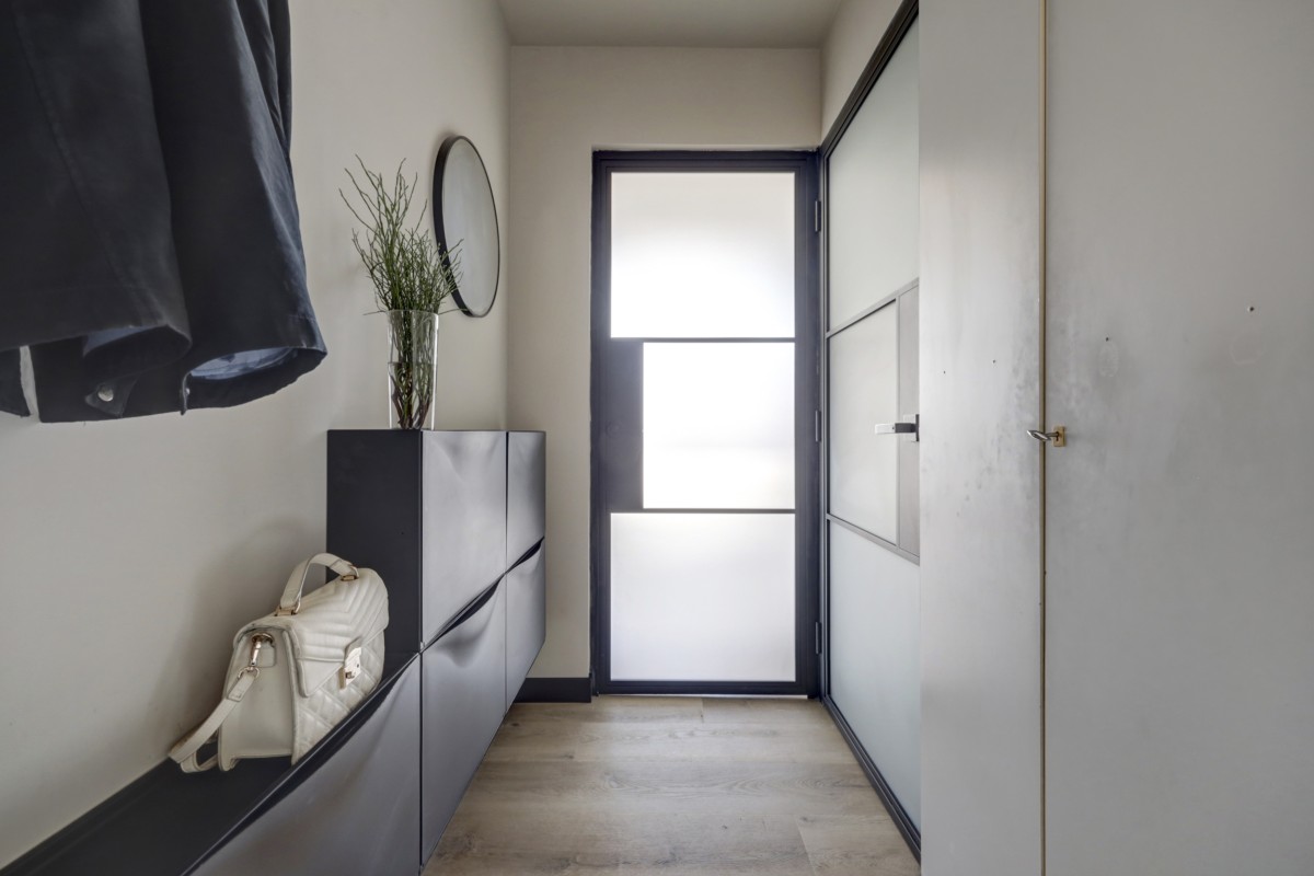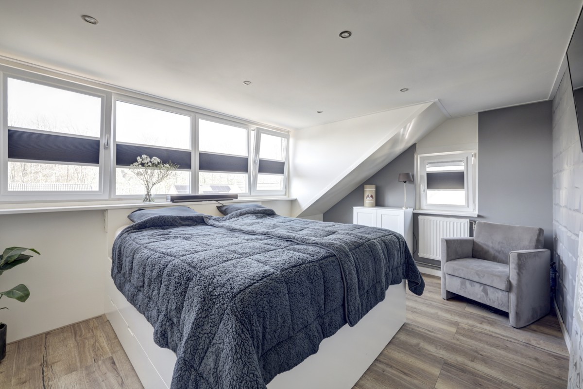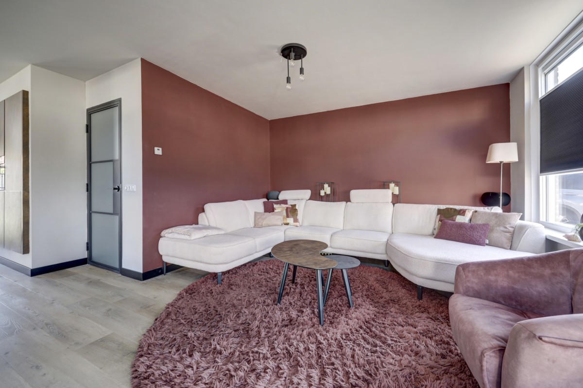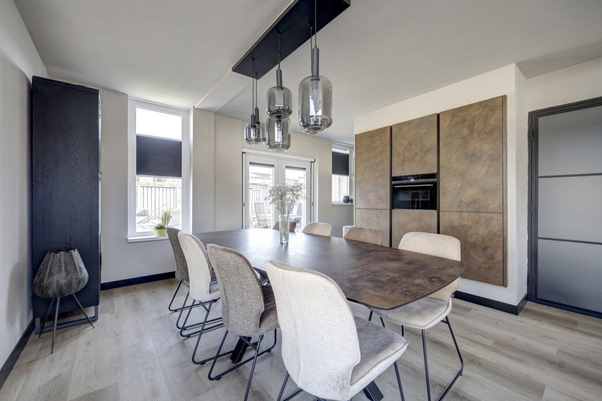 Ground floor: covered entrance, hall with wardrobe, meter cupboard with fiber optic connection, stairs to the upper floors, modern toilet room with wall-mounted toilet and washbasin (2026), steel-frame glass door to the spacious street-facing living room, which features underfloor heating with a PVC floor and an additional side extension with a corner window where the spacious dining area is situated, adjacent to the modern open kitchen featuring a corner kitchen unit and a wall element in the dining area. The kitchen is equipped with various built-in appliances, namely a refrigerator, boiling water tap, dishwasher, steam oven, 5-burner induction hob, and an extractor hood. French doors provide access to the lovely garden, which is secluded and features various terraces with decorative paving, a lawn, an attractive concrete post fence, a back entrance, and a wooden shed. From the garden, there is a pedestrian door to the attached garage, which has double wooden doors opening onto the driveway with parking space on the property for several cars.