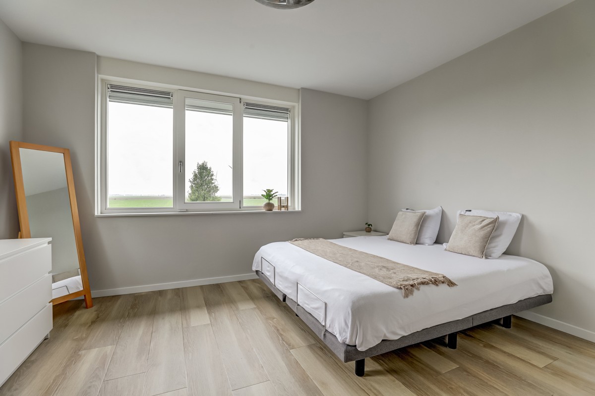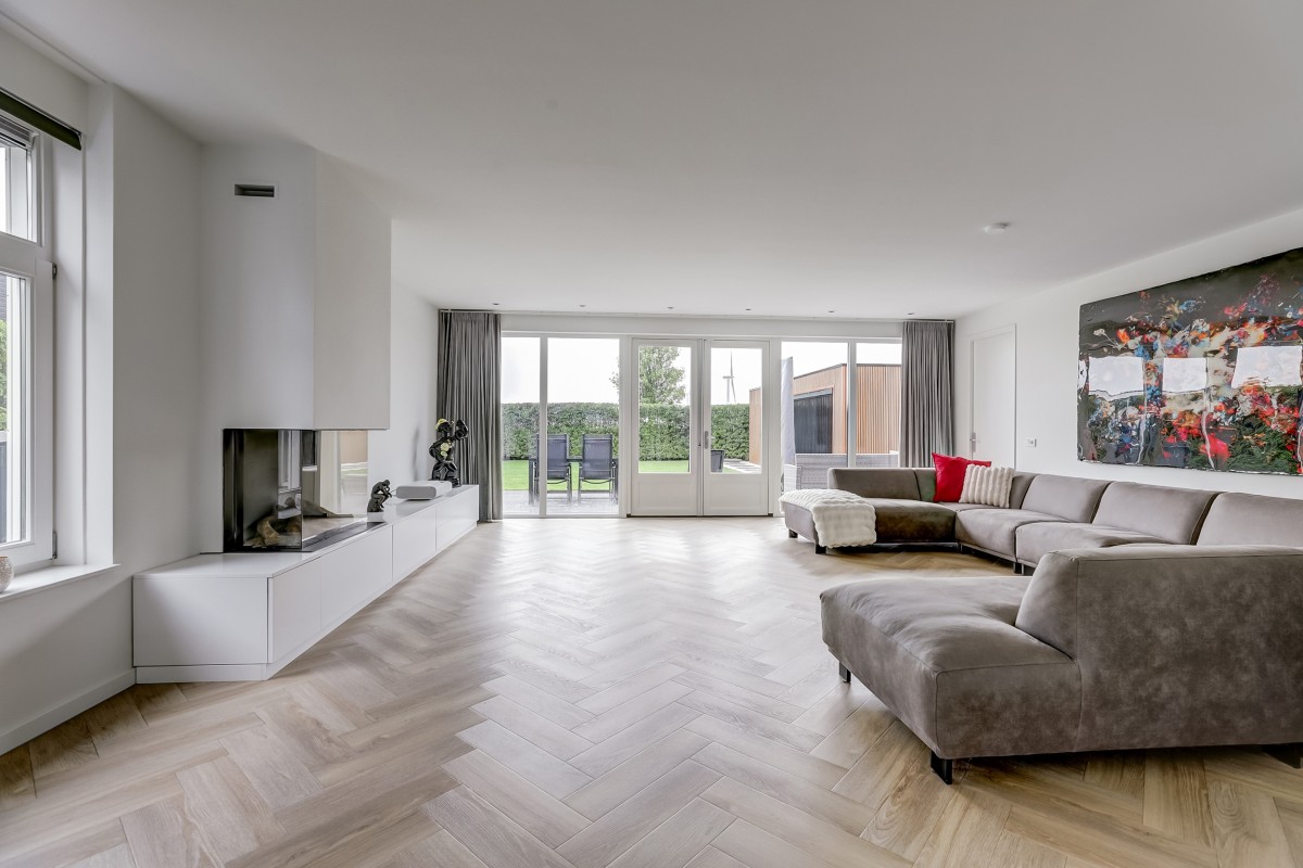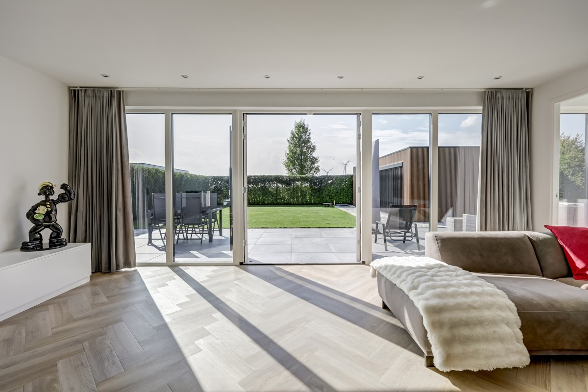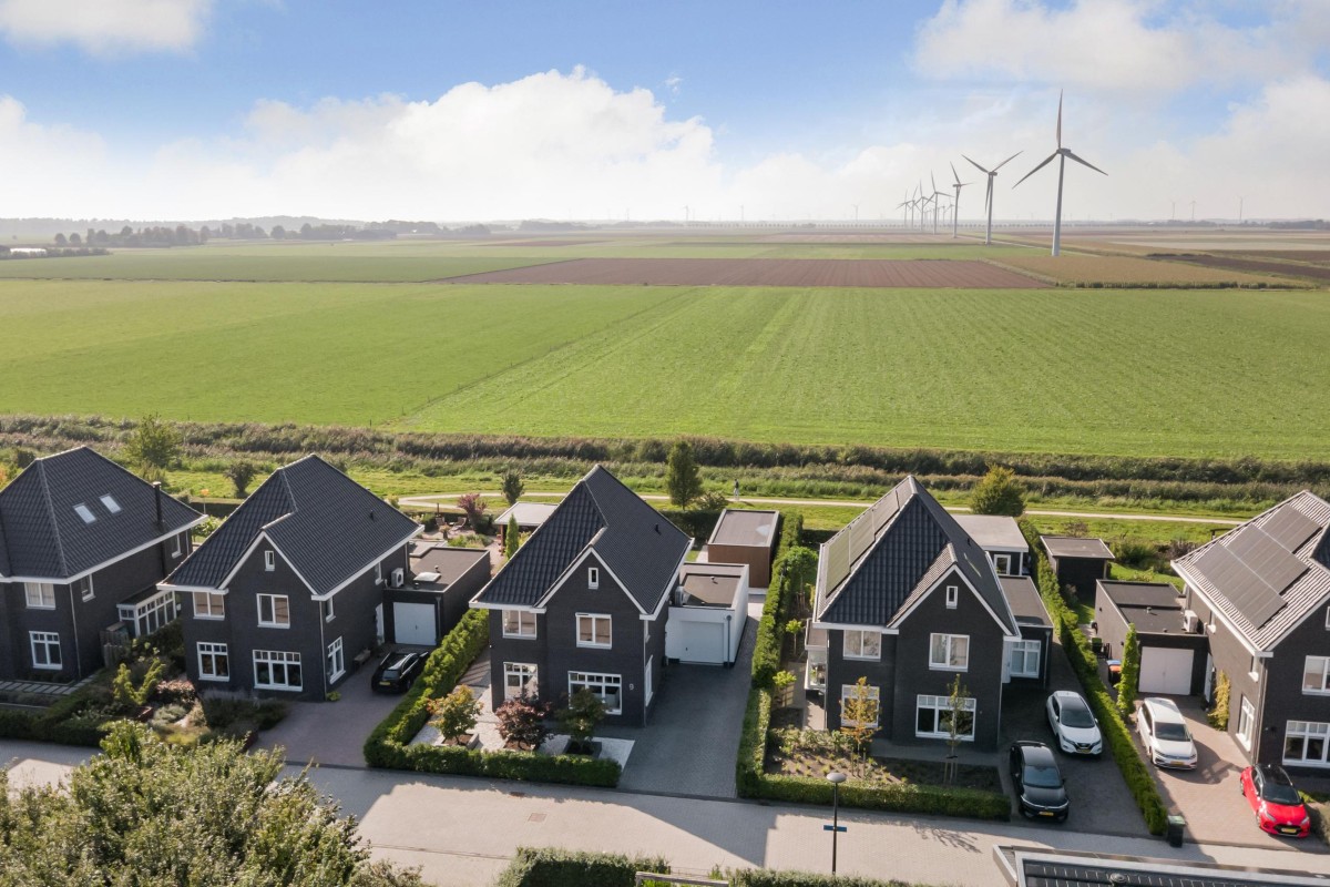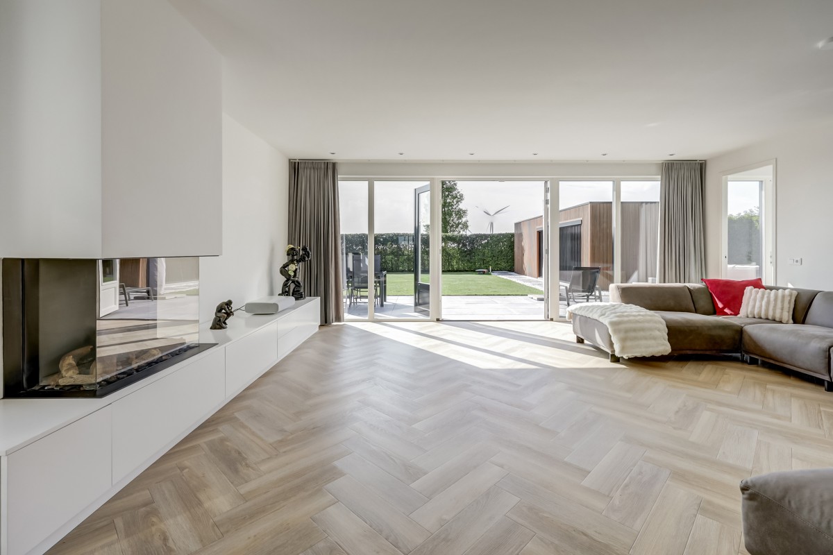 Begane grond: entree, ruime hal met uitgebreide meterkast en garderobe, toiletruimte met hangcloset en fonteintje, design glasdeur naar de woonkamer. De woonkamer is aan de achterzijde van de woning gelegen en maar liefst 4 meter uitgebouwd. Mede door de aanwezigheid van een erker aan de zijkant van de woning, een ingebouwde gashaard en openslaande tuindeuren is de living licht en modern. Aan de voorzijde van de woning wordt de woonkeuken middels design glasdeuren gescheiden van de woonkamer. De keuken is over de gehele breedte van de woning gerealiseerd en voorzien van een riante eethoek. De ingebouwde keuken bestaat uit een kastenwand met apparatuur en een kookeiland van een groot werkblad en eveneens veel kastruimte. Uiteraard is de keuken voorzien van een ingebouwde koelkast, vrieskast, wijnklimaatkast, vaatwasser, inductiekookplaat met afzuiging, oven en magnetron. De keukenvloer is afgewerkt met grote tegels van 100 x 100 cm. De begane grondvloer beschikt over een gelijmde PVC vloer in houtlook met vloerverwarming. Aan de achterzijde van de woning geeft een binnendoor toegang tot de bijkeuken en aangebouwde stenen garage met betonvloer en sectionaaldeur naar de brede oprit. Vanuit de bijkeuken geeft een extra tuindeur toegang tot de tuin. De achtertuin is op het westen gesitueerd en voorzien van een groot zonneterras tegen de achtergevel, een gazon en een zeer riante vrijstaande berging met overkapping welke in hoogwaardig kunststof materiaal is uitgevoerd. De ligging van het perceel biedt een fenomenaal uitzicht over het water en de landerijen. De vloeren van de begane grond zijn voorzien van een lichte houten vloer met vloerverwarming vanuit de warmtepomp.