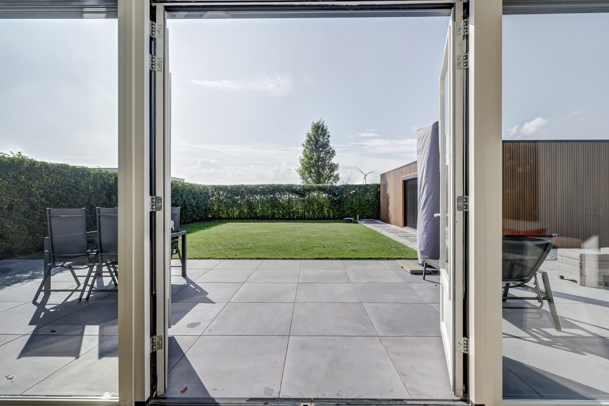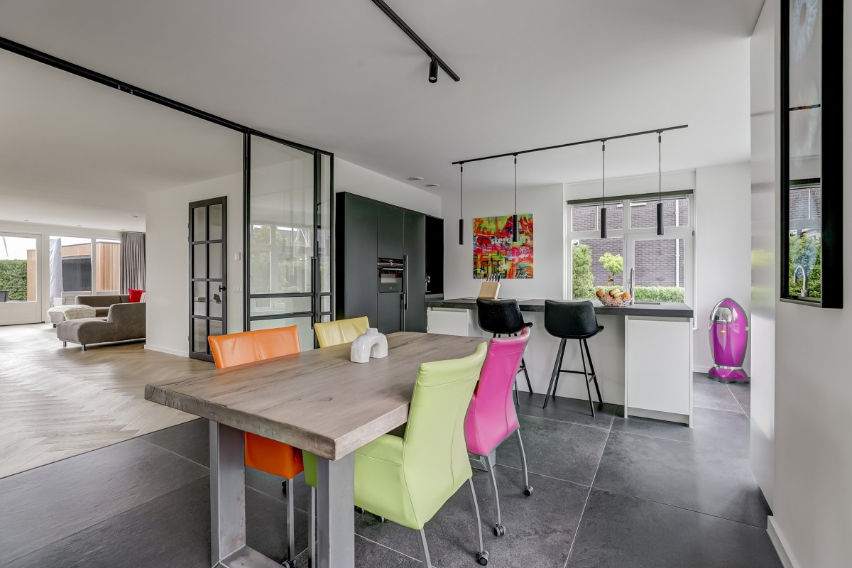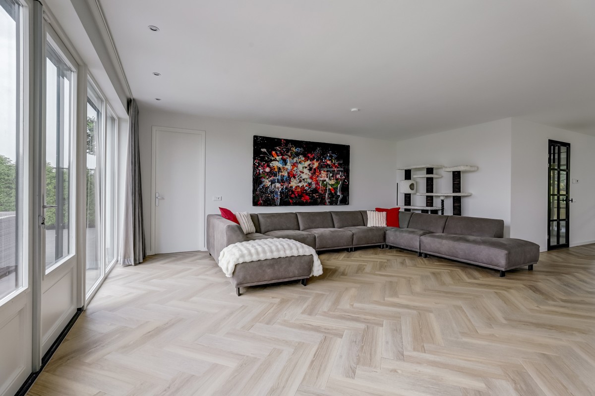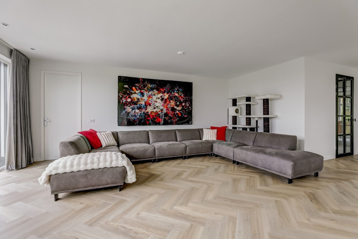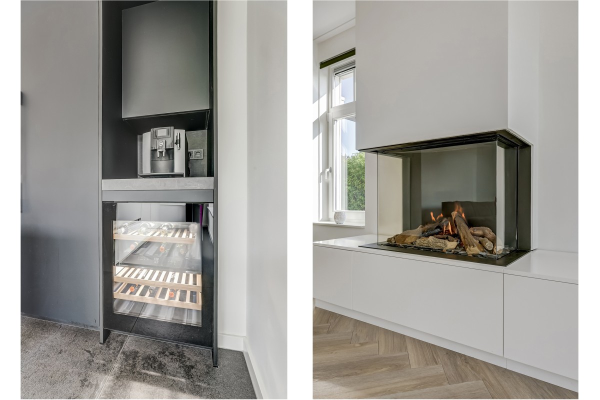 Begane grond: entree, ruime hal met uitgebreide meterkast en garderobe, toiletruimte met hangcloset en fonteintje, design glasdeur naar de woonkamer. De woonkamer is aan de achterzijde van de woning gelegen en maar liefst 4 meter uitgebouwd. Mede door de aanwezigheid van een erker aan de zijkant van de woning, een ingebouwde gashaard en openslaande tuindeuren is de living licht en modern. Aan de voorzijde van de woning wordt de woonkeuken middels design glasdeuren gescheiden van de woonkamer. De keuken is over de gehele breedte van de woning gerealiseerd en voorzien van een riante eethoek. De ingebouwde keuken bestaat uit een kastenwand met apparatuur en een kookeiland van een groot werkblad en eveneens veel kastruimte. Uiteraard is de keuken voorzien van een ingebouwde koelkast, vrieskast, wijnklimaatkast, vaatwasser, inductiekookplaat met afzuiging, oven en magnetron. De keukenvloer is afgewerkt met grote tegels van 100 x 100 cm. De begane grondvloer beschikt over een gelijmde PVC vloer in houtlook met vloerverwarming. Aan de achterzijde van de woning geeft een binnendoor toegang tot de bijkeuken en aangebouwde stenen garage met betonvloer en sectionaaldeur naar de brede oprit. Vanuit de bijkeuken geeft een extra tuindeur toegang tot de tuin. De achtertuin is op het westen gesitueerd en voorzien van een groot zonneterras tegen de achtergevel, een gazon en een zeer riante vrijstaande berging met overkapping welke in hoogwaardig kunststof materiaal is uitgevoerd. De ligging van het perceel biedt een fenomenaal uitzicht over het water en de landerijen. De vloeren van de begane grond zijn voorzien van een lichte houten vloer met vloerverwarming vanuit de warmtepomp.