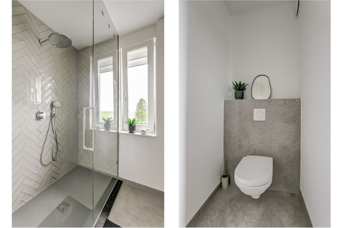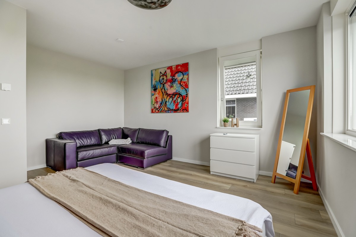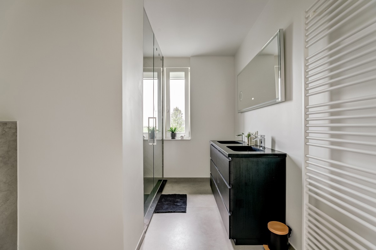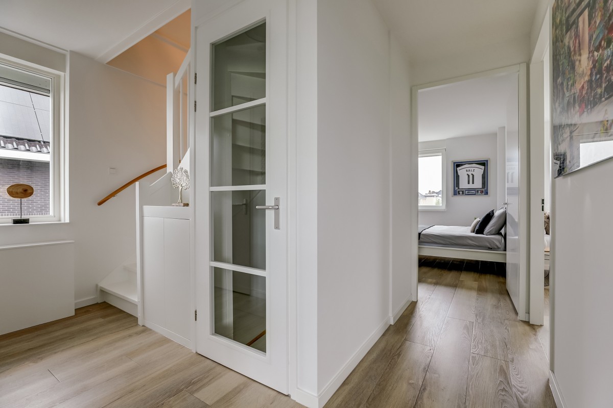 Eerste verdieping: vaste dichte trap naar de overloop met aansluitend drie slaapkamers en de luxe badkamer voorzien van een grote inloopdouche, meubel met dubbele wastafel, vloerverwarming, 2e hangcloset en een designradiator. De slaapkamers zijn riant van maatvoering en bieden alle drie door de vele grote ramen veel licht. Het trappenhuis is professioneel afgesloten en tevens voorzien van een kast. Ook deze verdieping is geheel voorzien van vloerverwarming.