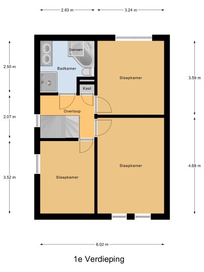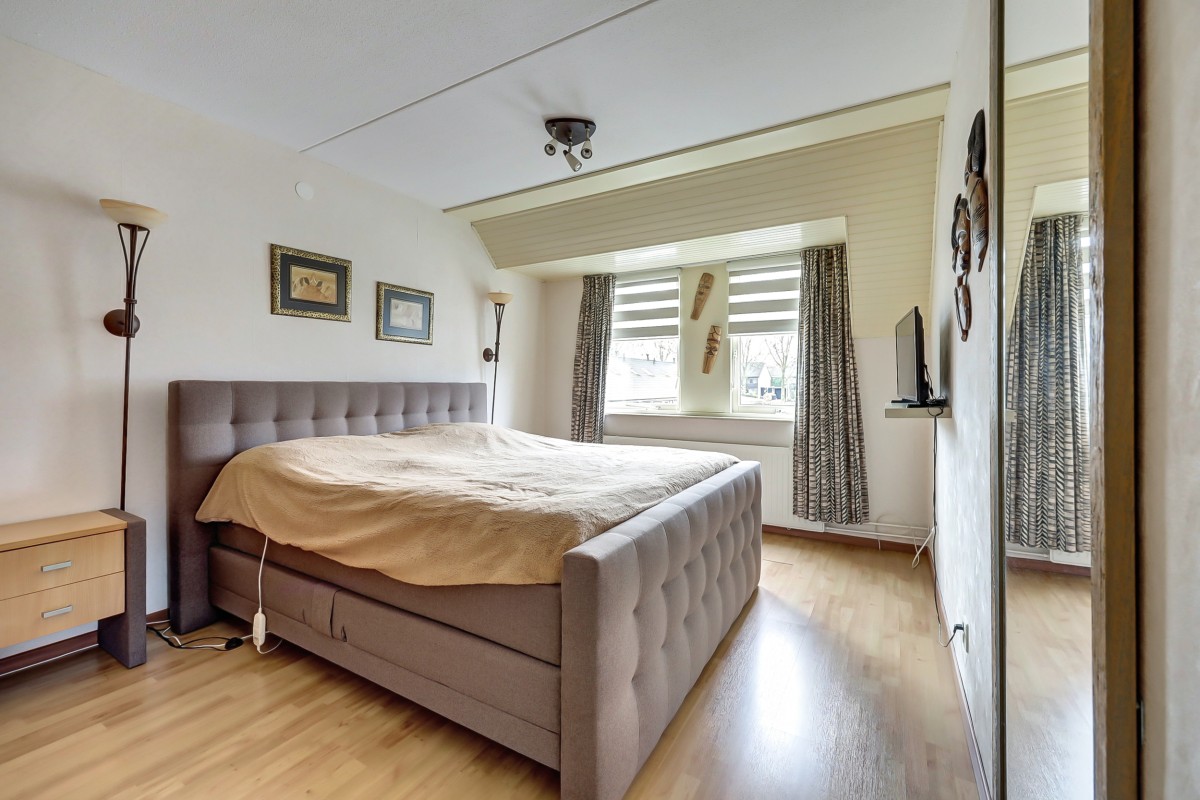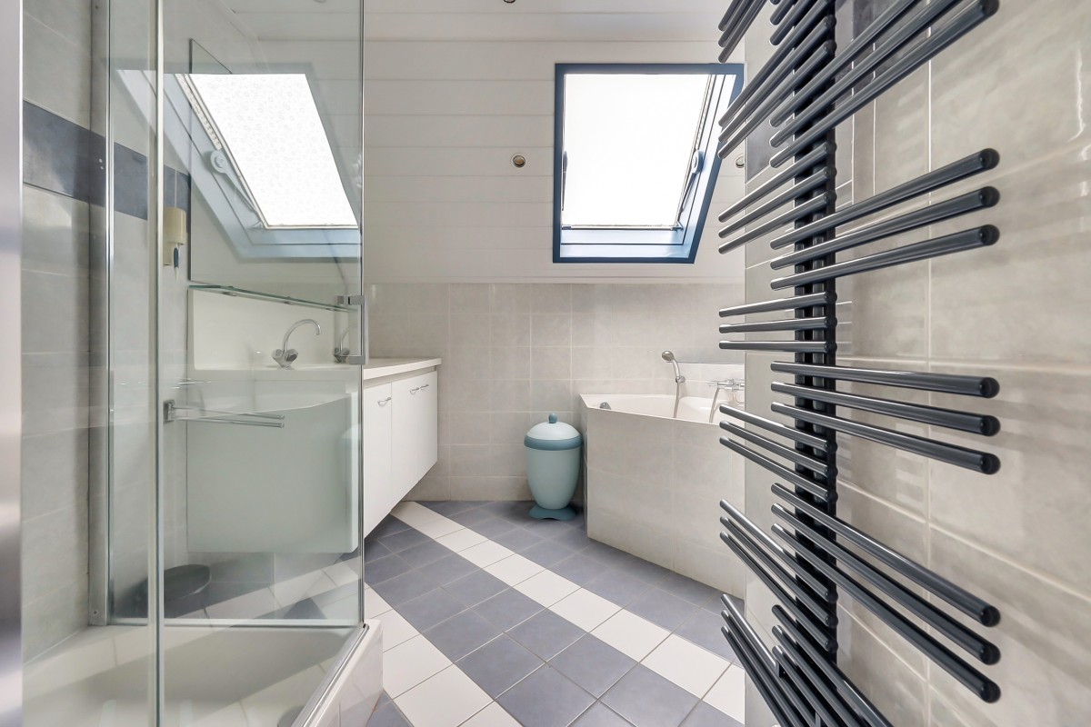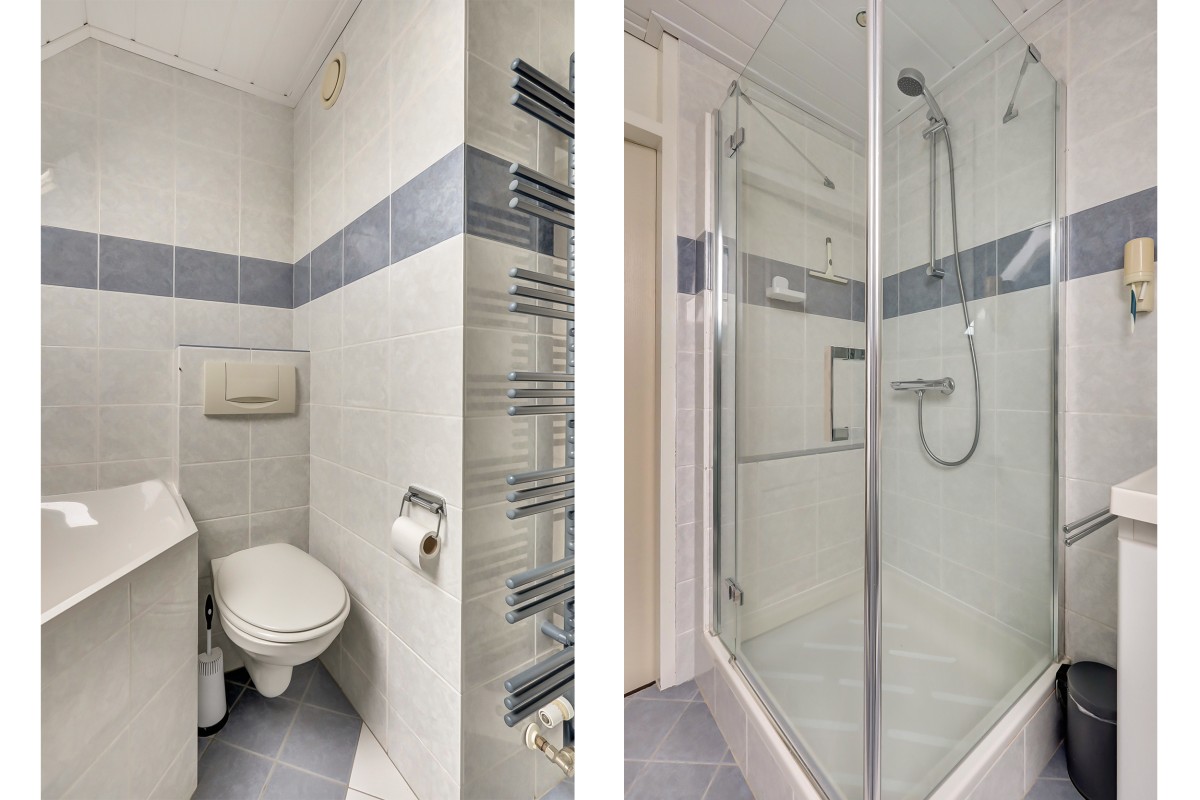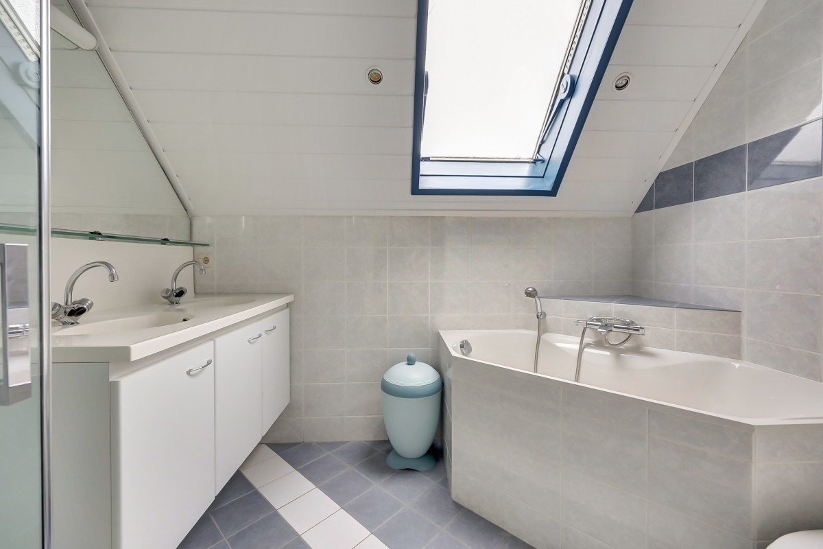 Overloop met bergkast, drie ruime slaapkamers voorzien van laminaatvloer. De volledig betegelde badkamer heeft een douche, hoekbad, hangend toilet, designradiator en dubbel wastafelmeubel.