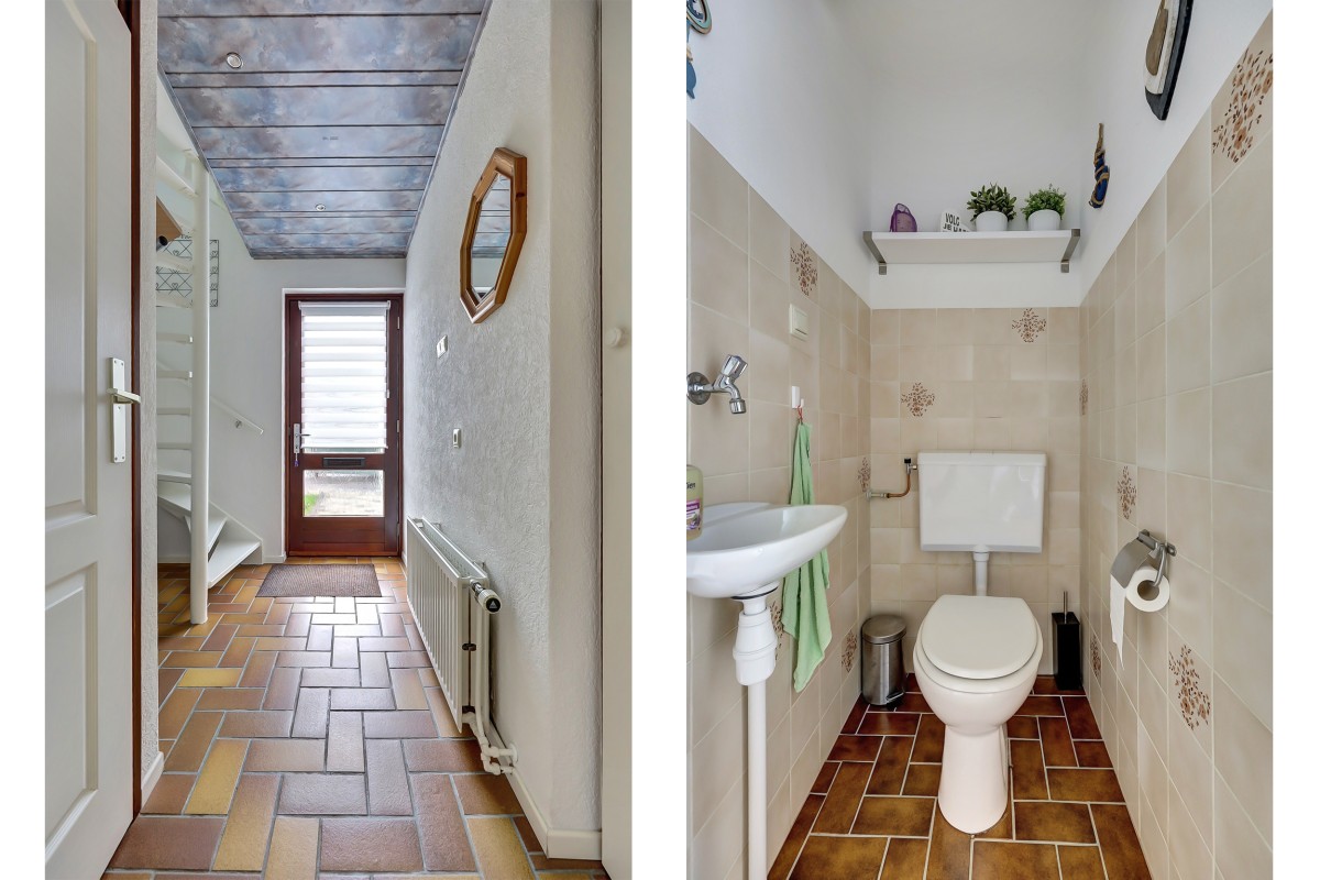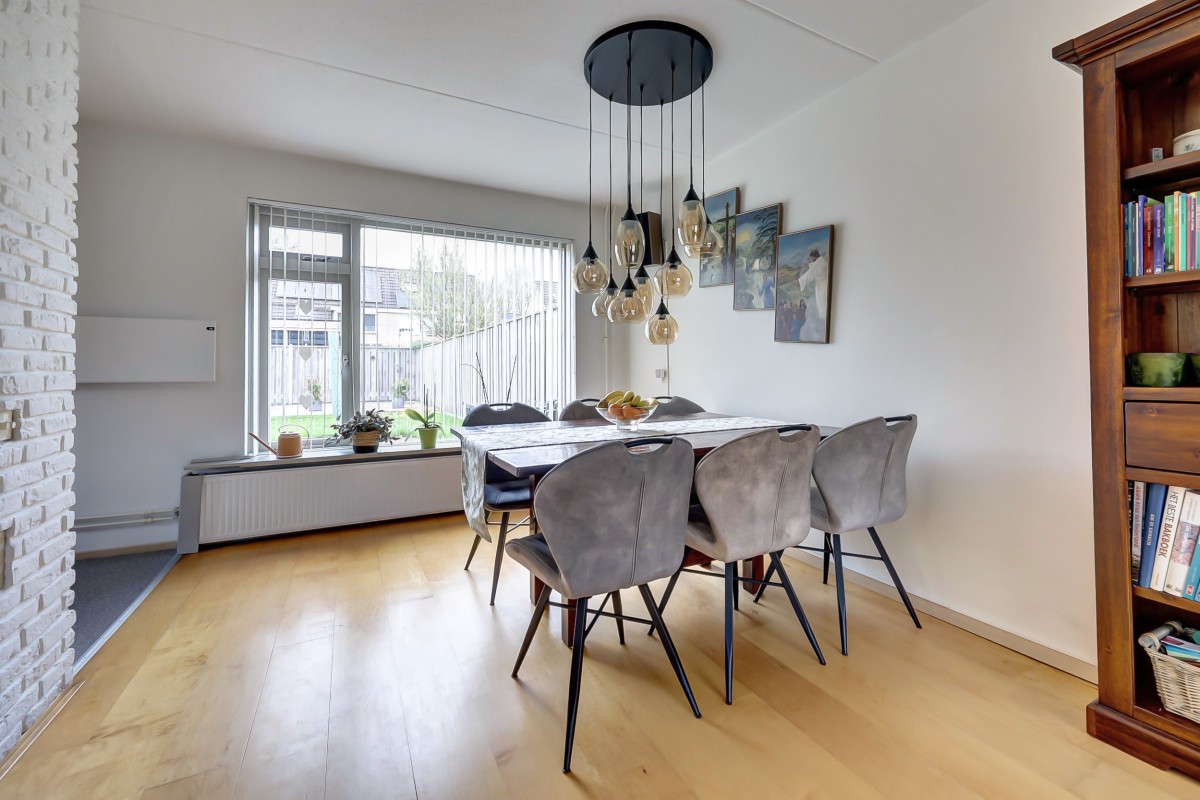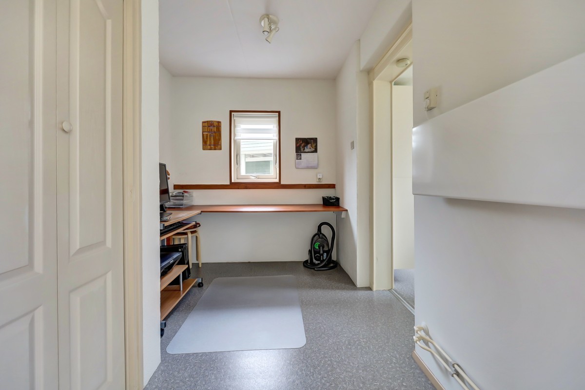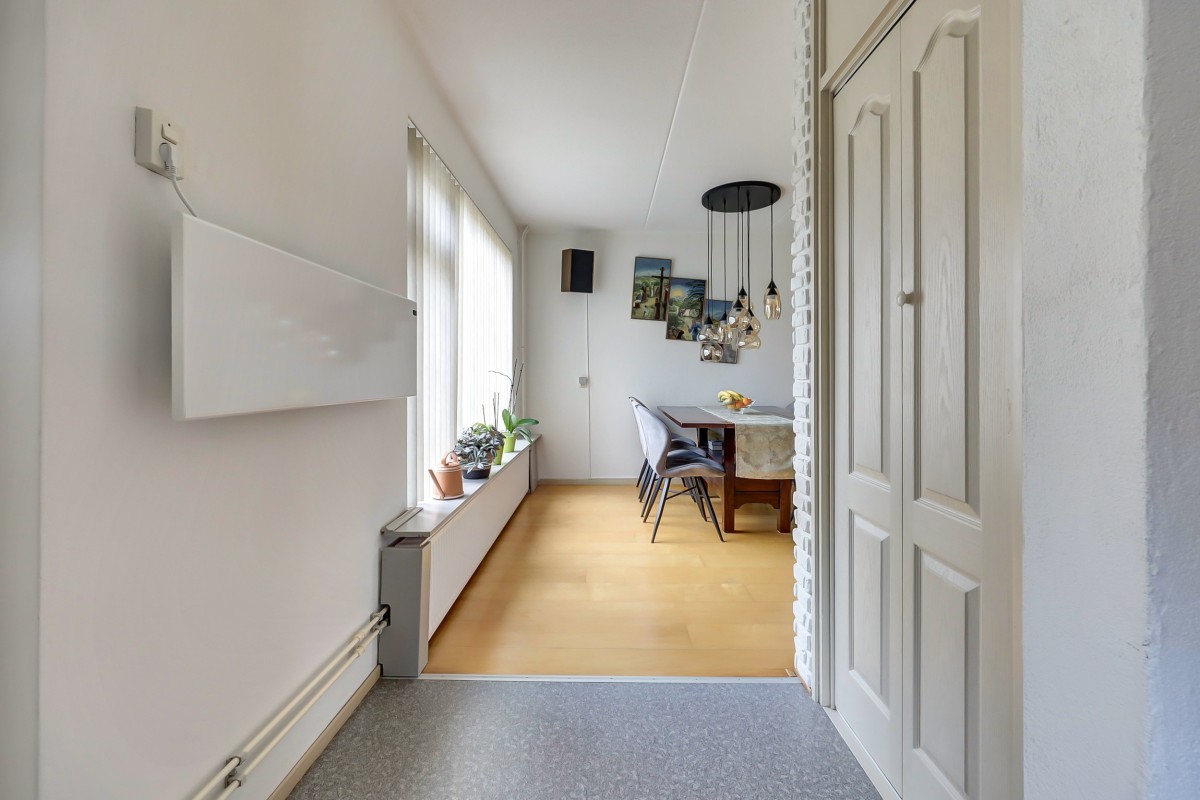 Entree, hal met meterkast inclusief waterontharder en een toiletruimte met fonteintje. De straatgerichte woonkamer en tuingerichte eethoek zijn ruim van opzet. De voormalige keukenruimte is momenteel in gebruik als praktische thuiswerkplek.