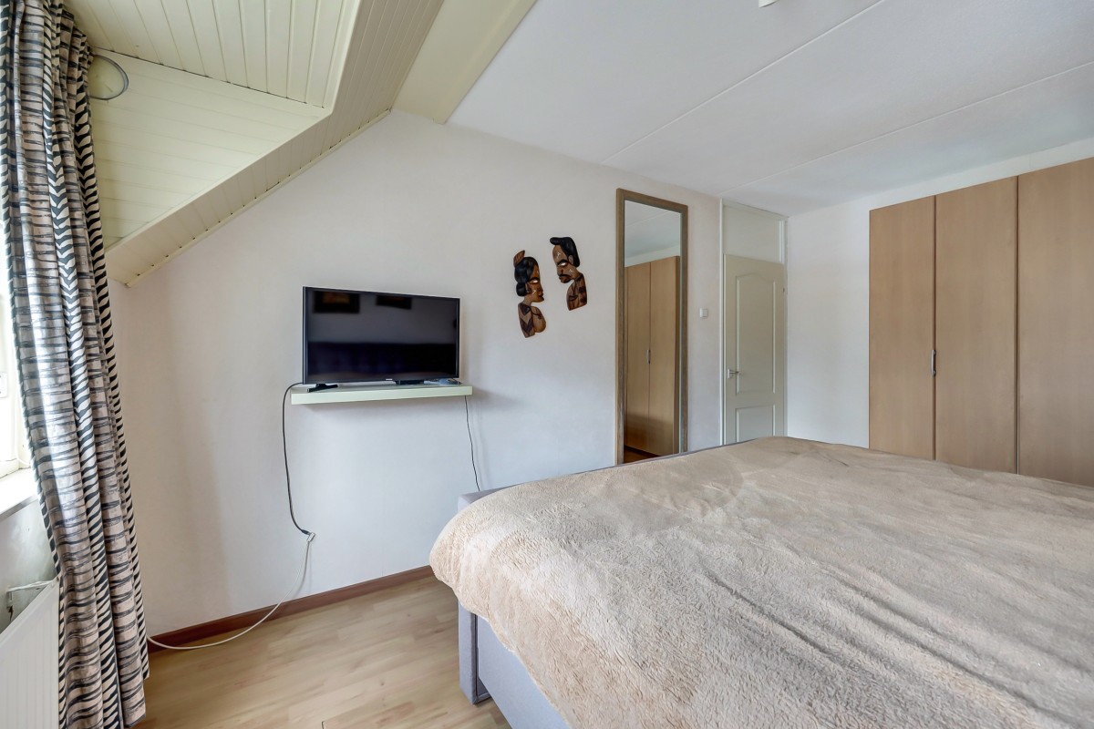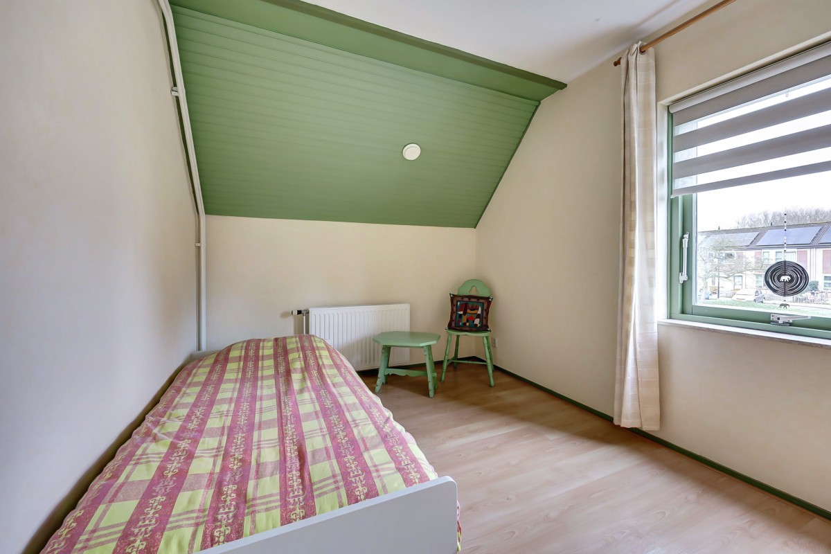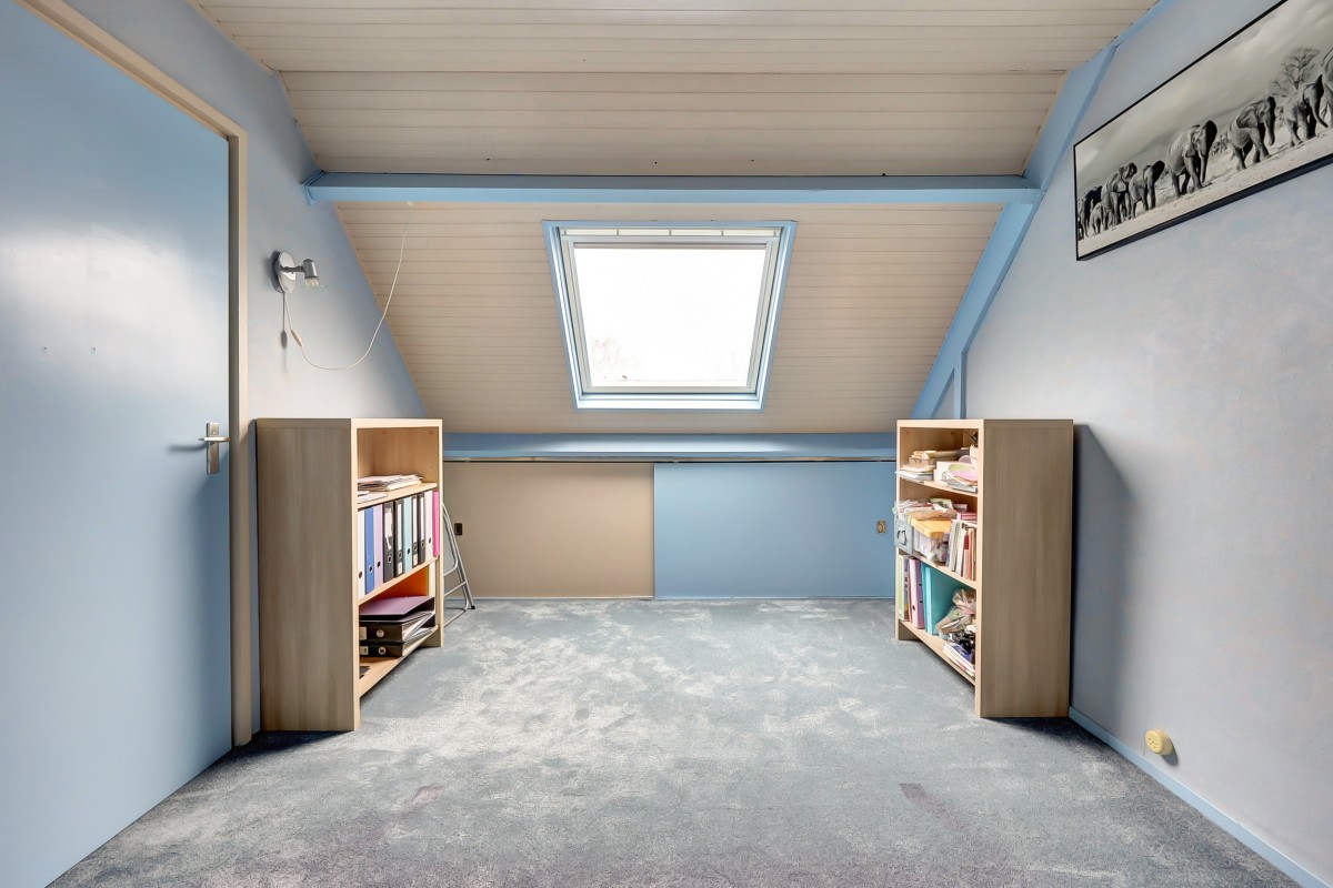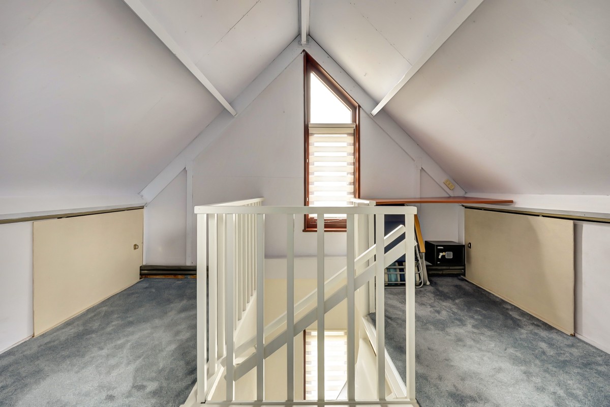 Via vaste trap bereikbaar. Overloop met cv-ketel en omvormers van de 23 zonnepanelen. Vierde slaapkamer met dakraam en kleine bergzolder.