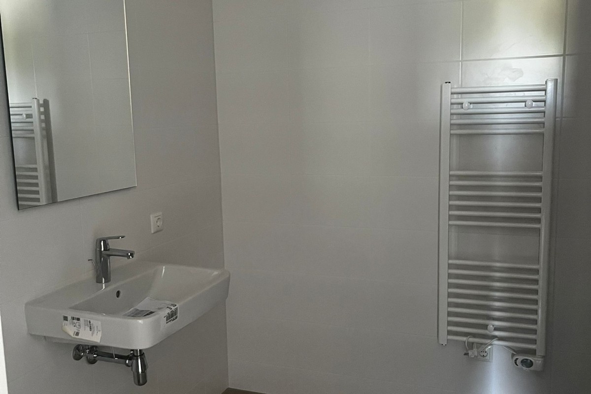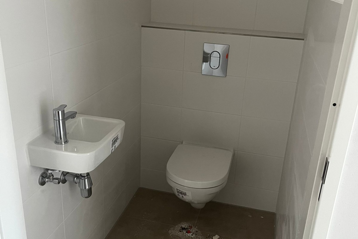 Het appartement heeft een ruime en lichte indeling. De entree geeft toegang tot de meterkast, de volledig betegelde badkamer met vloerverwarming, elektrische radiator, hangend toilet, inloopdouche met drainafvoer en wastafel. Moderne 60x60 cm vloertegels in een warme beige kleur geven de ruimte een stijlvolle uitstraling. Daarnaast is er een separate toiletruimte met hangend toilet en fonteintje. De technische ruimte is voorzien van een WTW-installatie, warmtepomp en aansluiting voor de wasmachine.