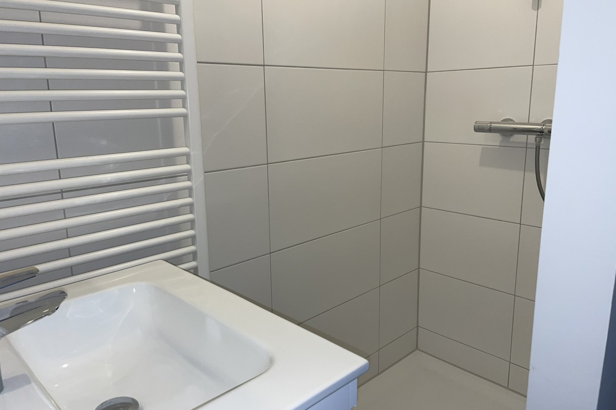 Lees verderSeparaat toilet op de gang en doorgang naar de royale slaapkamer met een inloopbadkamer welke is voorzien van een badkamer meubel en inloop douche. Vanuit de slaapkamer middels twee openslaande deuren is het dakterras bereikbaar. De woning is voorzien van een pvc vloer.