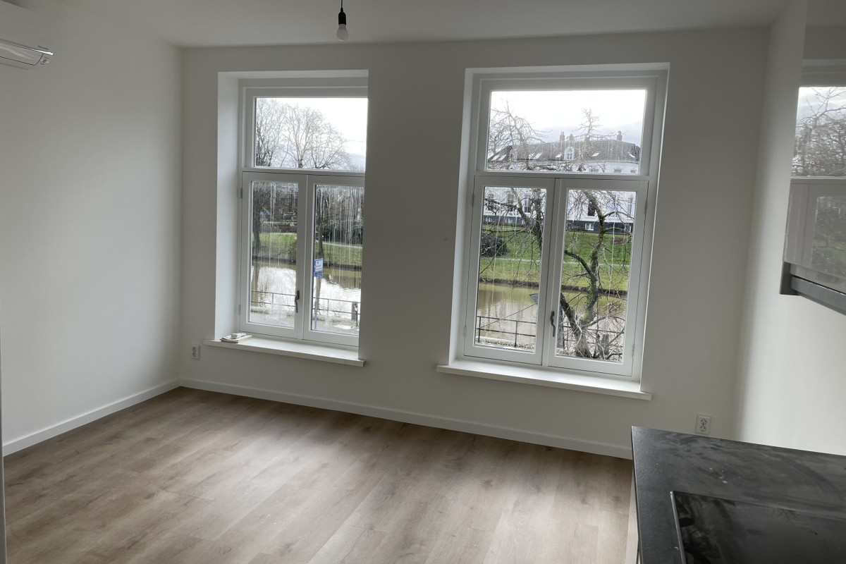 Entree; videofoon en opgang naar de appartementen. Het appartement is gelegen op de 1e verdieping. Woonkamer aan de voorzijde met twee grote raampartijen met prachtig uitzicht op de gracht. Keuken voorzien van vaatwasser, inductiekookplaat en afzuigsysteem.
