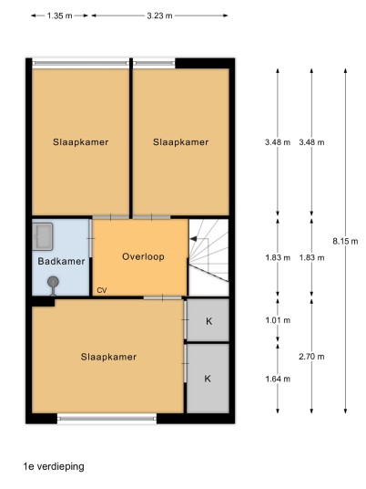 Via the staircase in the hall, you reach the first floor. The landing provides access to all rooms and houses the central heating system (Intergas, installed in 2024). At the front, you will find the largest bedroom with ample storage space. Next to it is the bathroom, equipped with a shower and washbasin. At the rear, there are two additional well-sized bedrooms.