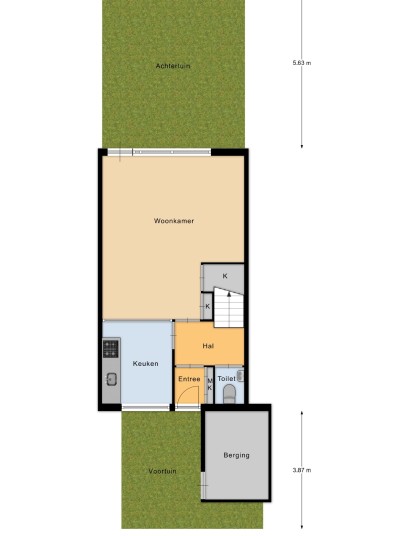 Through your private front garden, you have access to the storage unit and reach the front door of the house. Upon entering, you arrive in the entrance hall, which provides access to the meter cupboard and the central hall. From here, you can access the staircase to the first floor, a separate toilet, the kitchen, and the living room.
