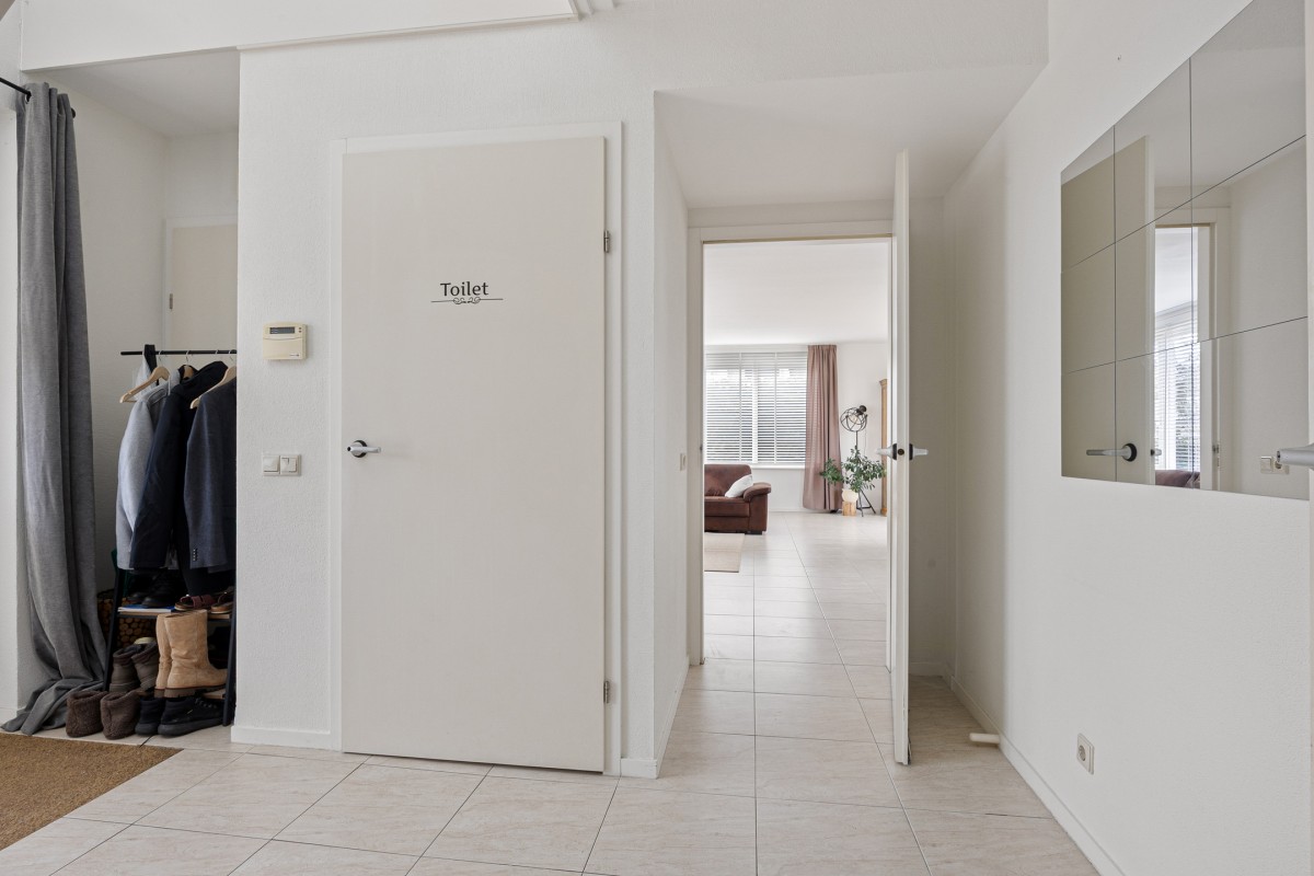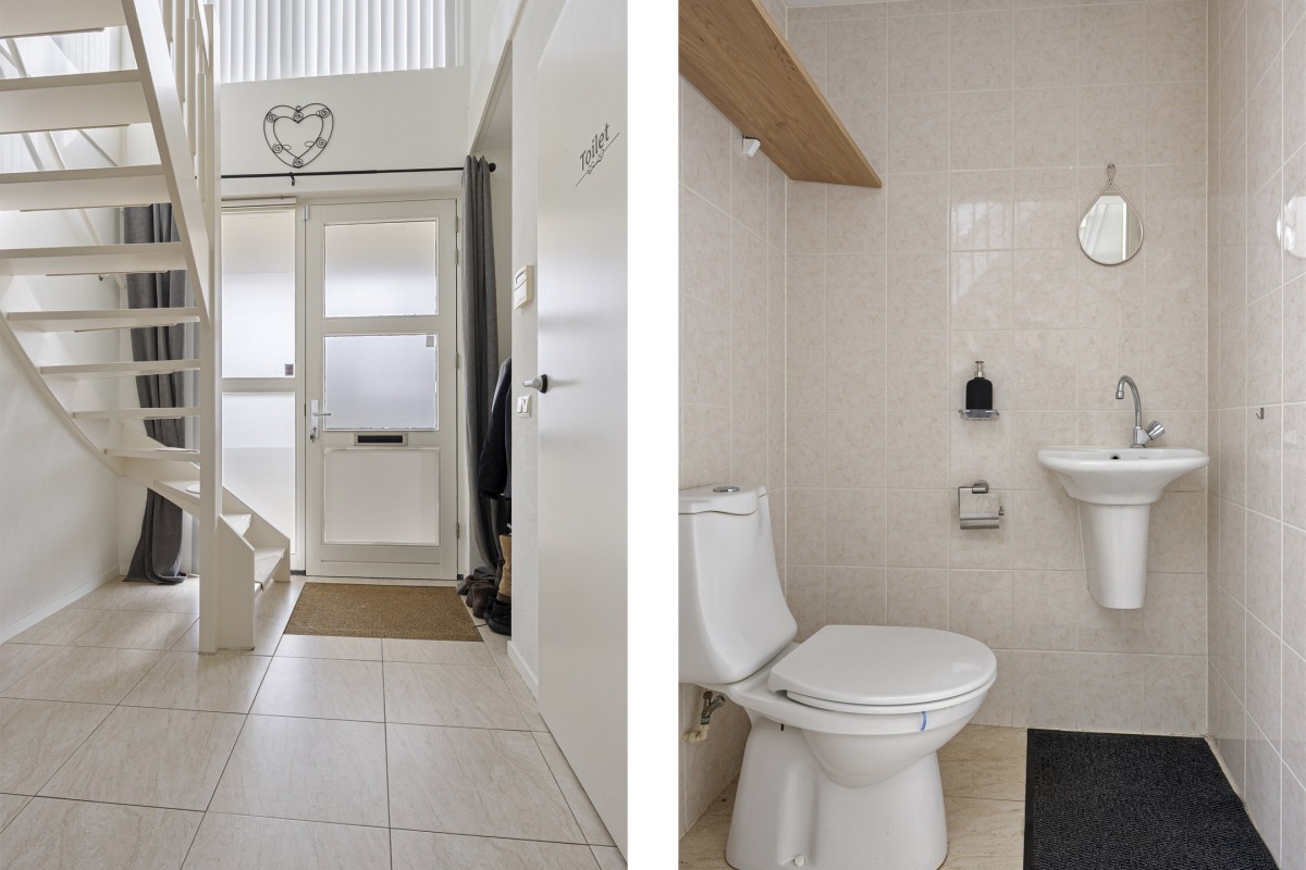 Entree, lichte hal met vide, meterkast met glasvezelaansluiting, toilet (tot aan het plafond betegeld) met een fonteintje, trap naar de verdieping, deur naar de garage en deur naar de woonkamer.