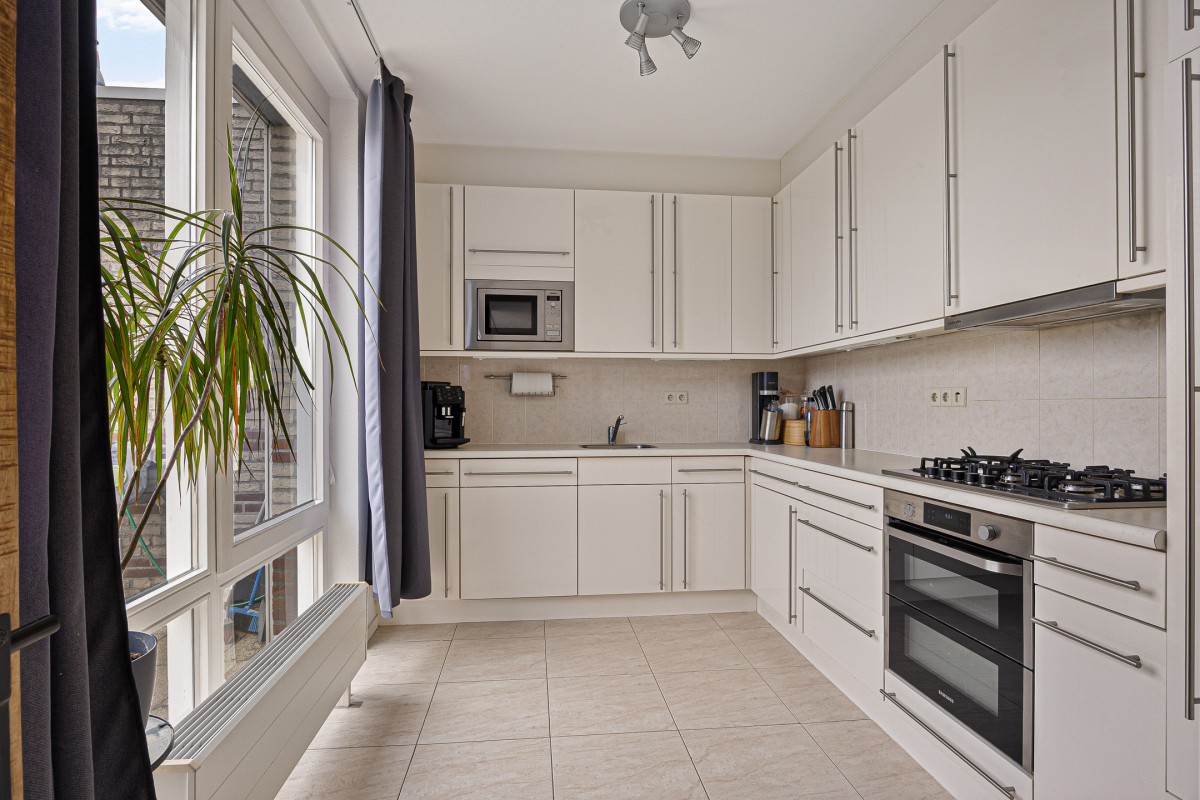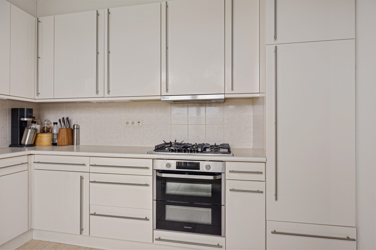 De keuken in lichte kleurstelling is aan de achterzijde van de woning gesitueerd en is uitgerust met 2 ovens (met o.a. een grill functie), vaatwasser, koelkast, 5-pits gaskookplaat