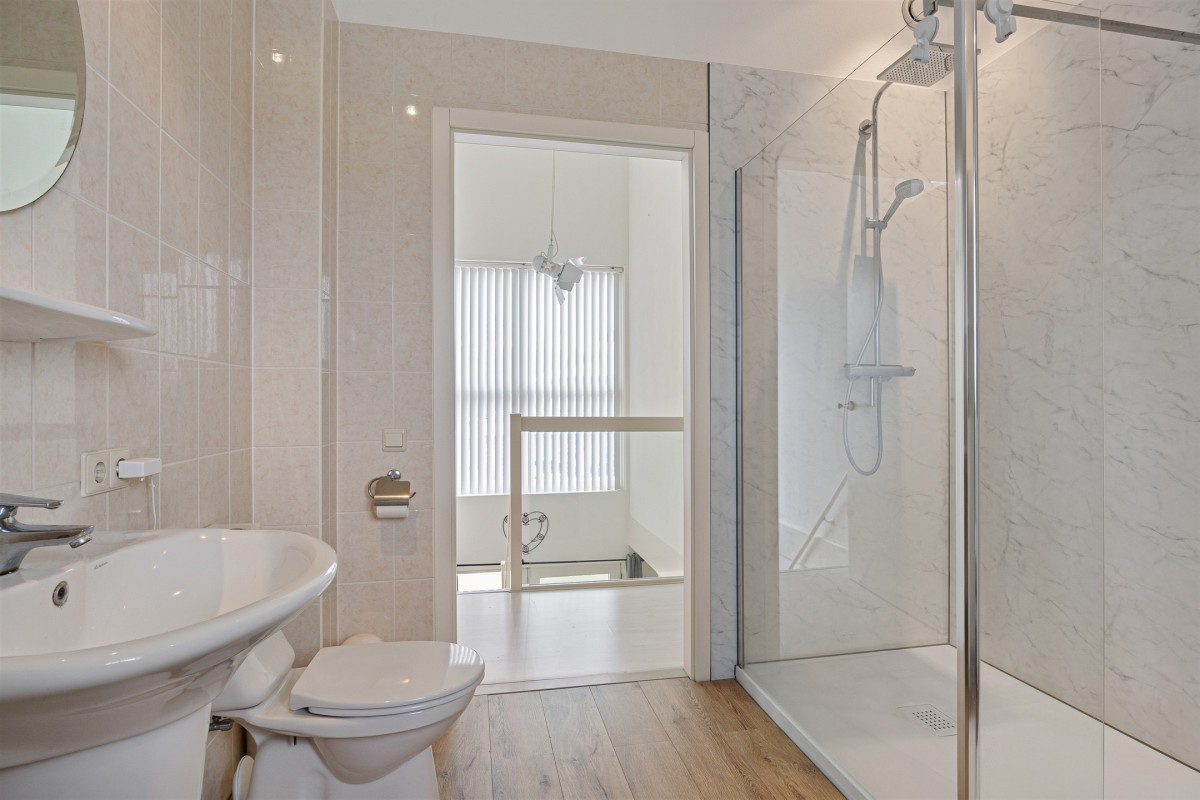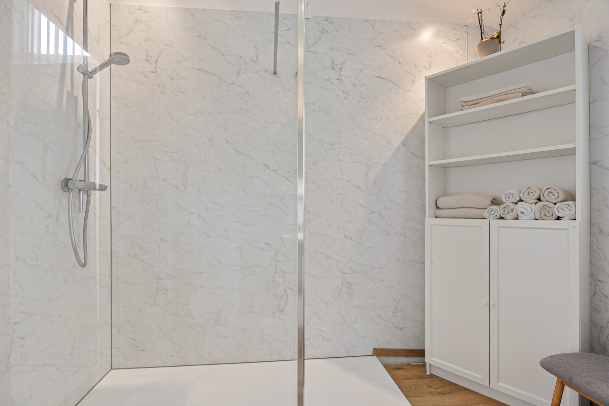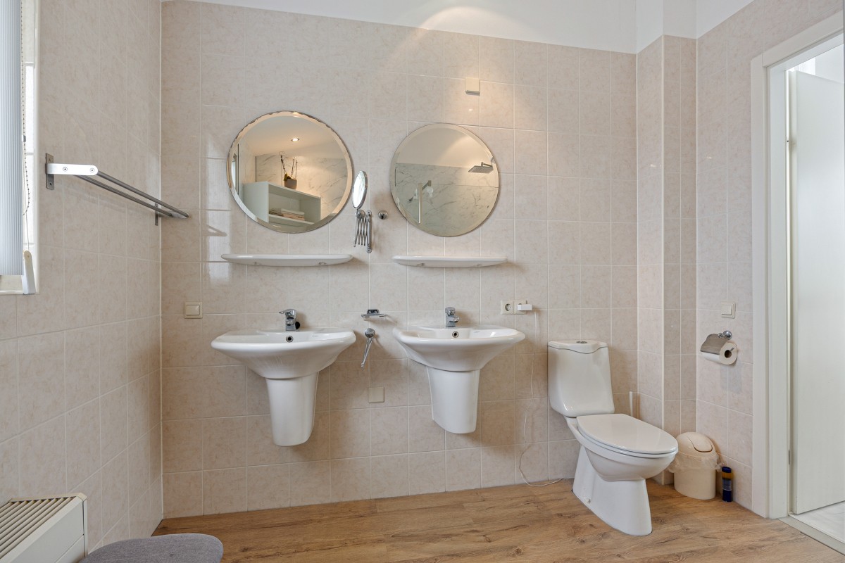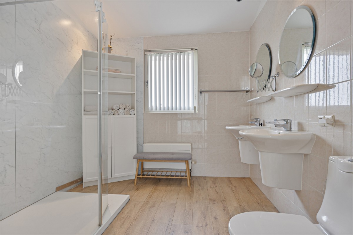 De badkamer is uitgerust met een inloopdouche, twee wastafels, een toilet en sfeervolle spots in het plafond verwerkt.