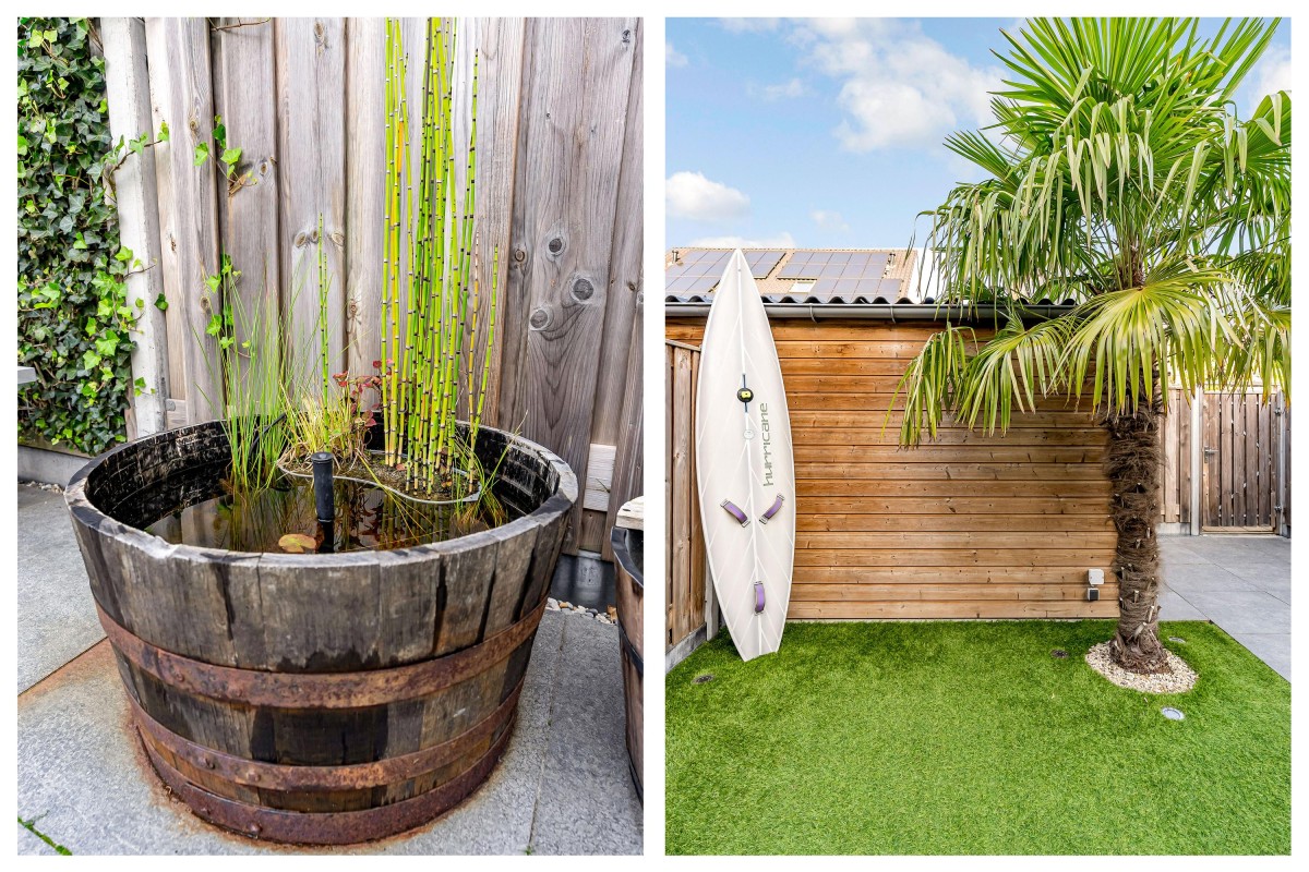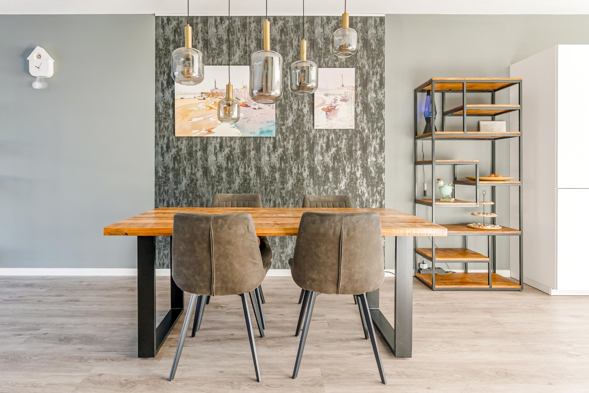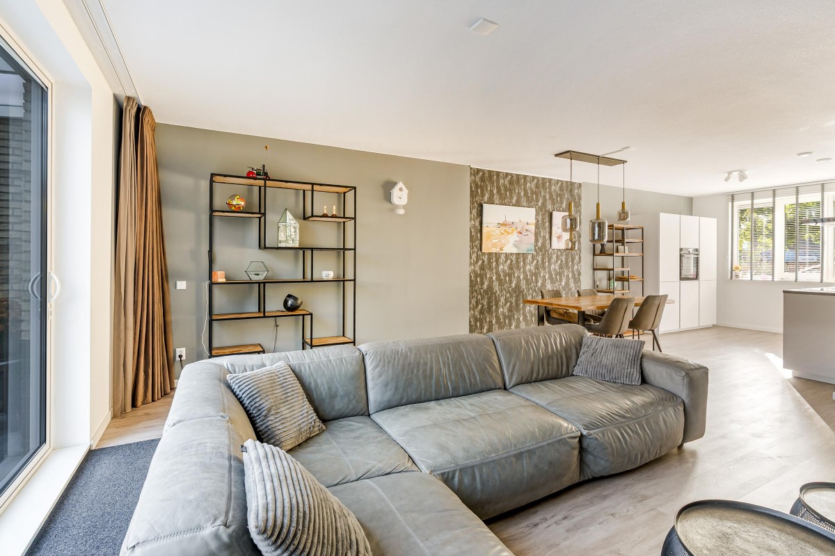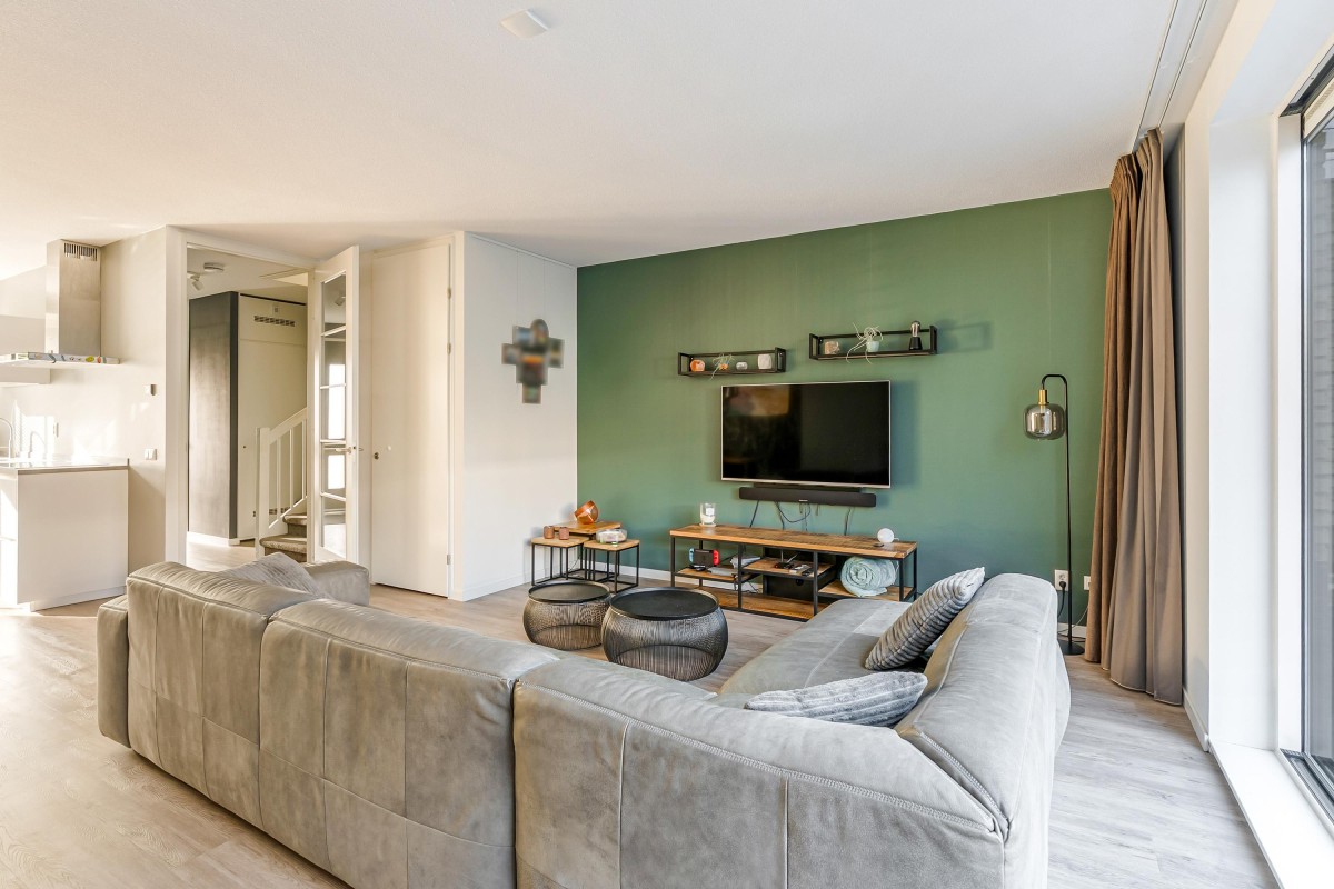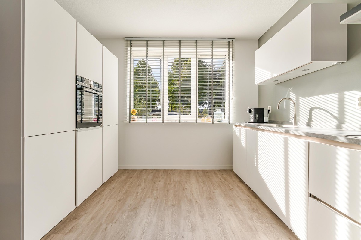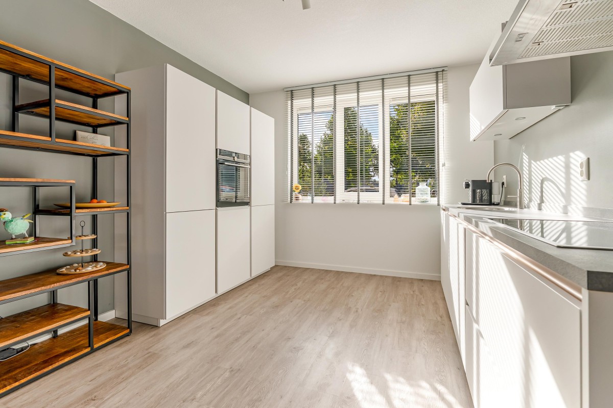 The street-facing kitchen is finished in a light color scheme and offers ample work and storage space. It is also equipped with various built-in appliances, including an induction cooktop, extractor hood, oven, fridge/freezer, dishwasher, and a Quooker.