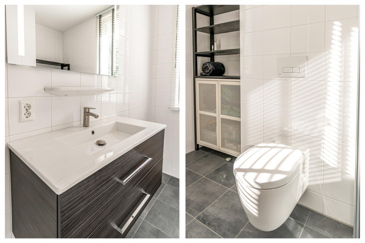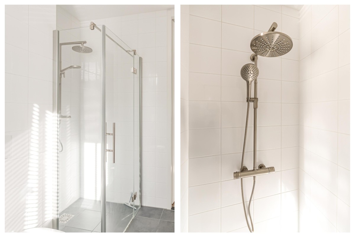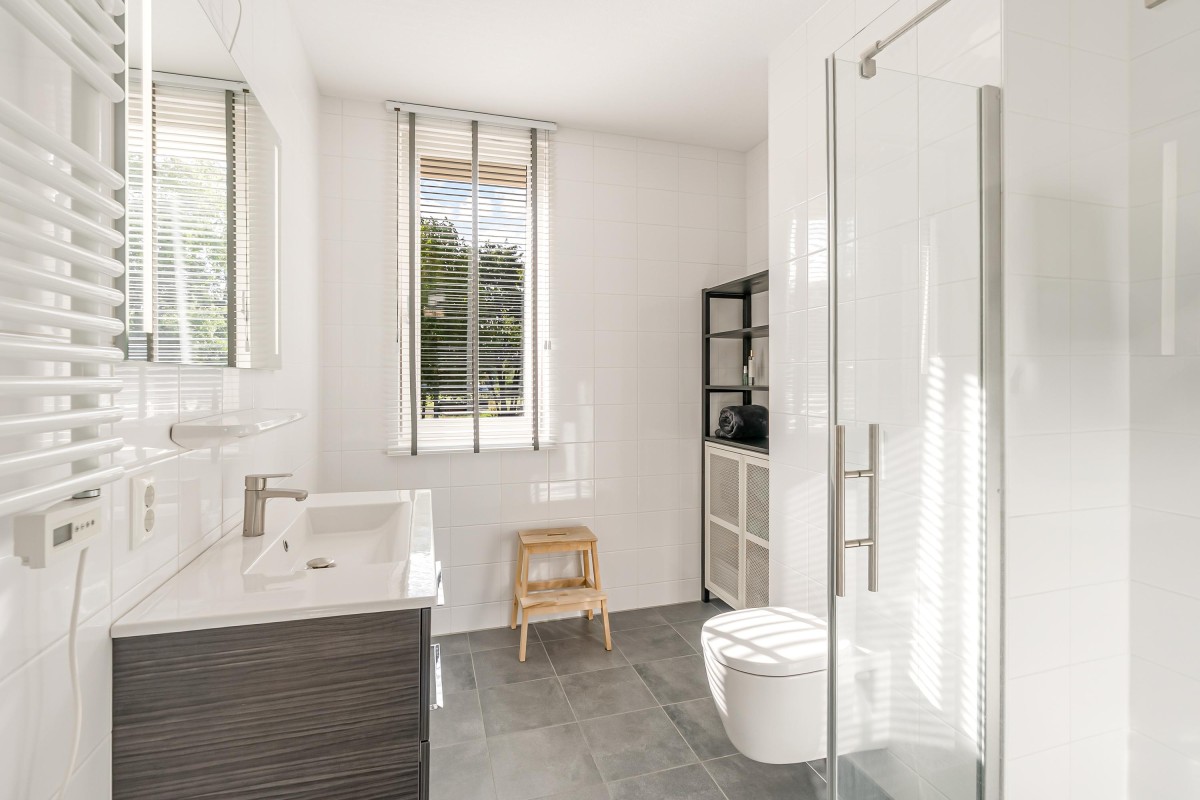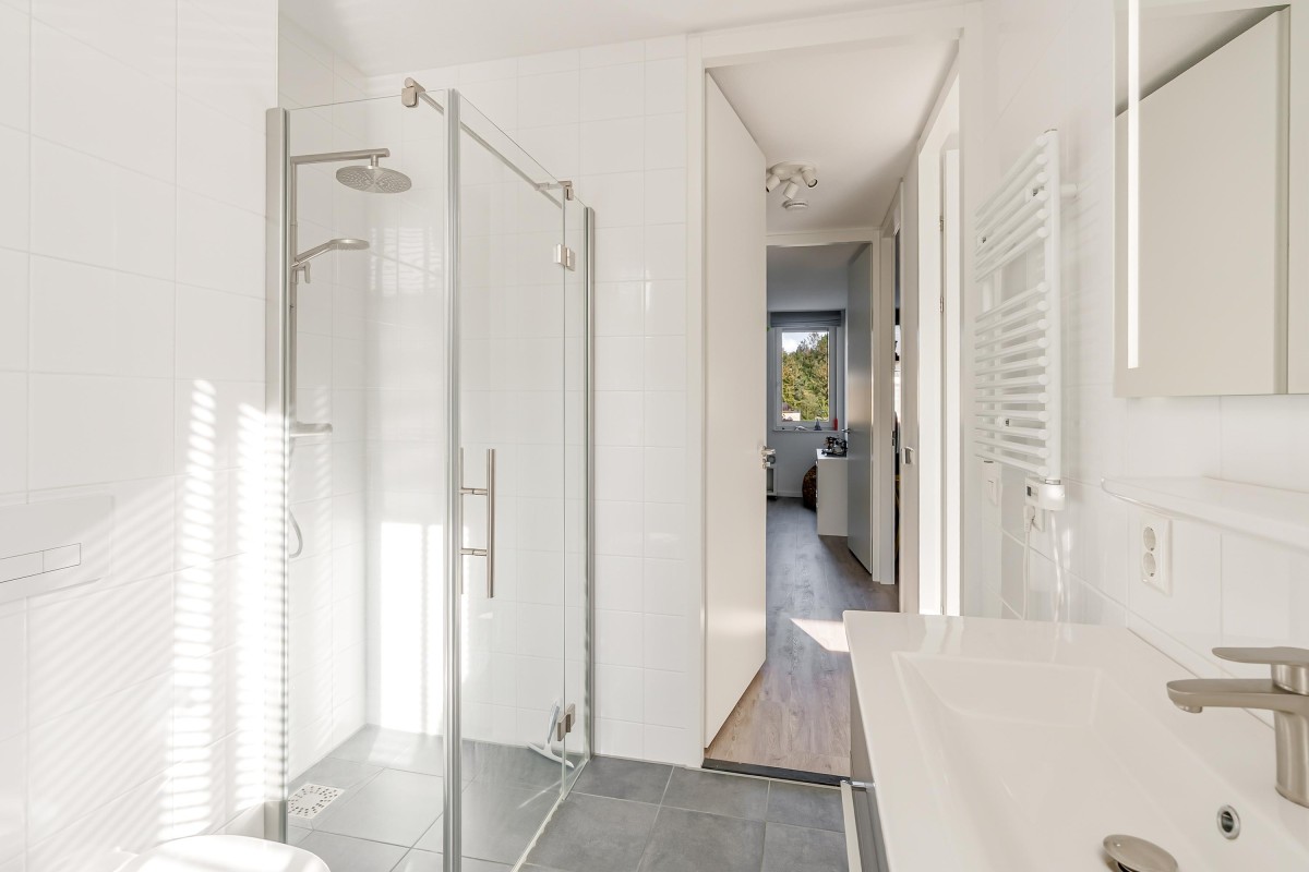 Landing with access to three bedrooms and the bathroom. At the rear of the house are two bedrooms, one of which is more spacious. A well-designed third bedroom and bathroom are located at the front. The bathroom is finished in light colors and equipped with a toilet, vanity unit, walk-in shower, and designer radiator. Underfloor heating is also available on the first floor.