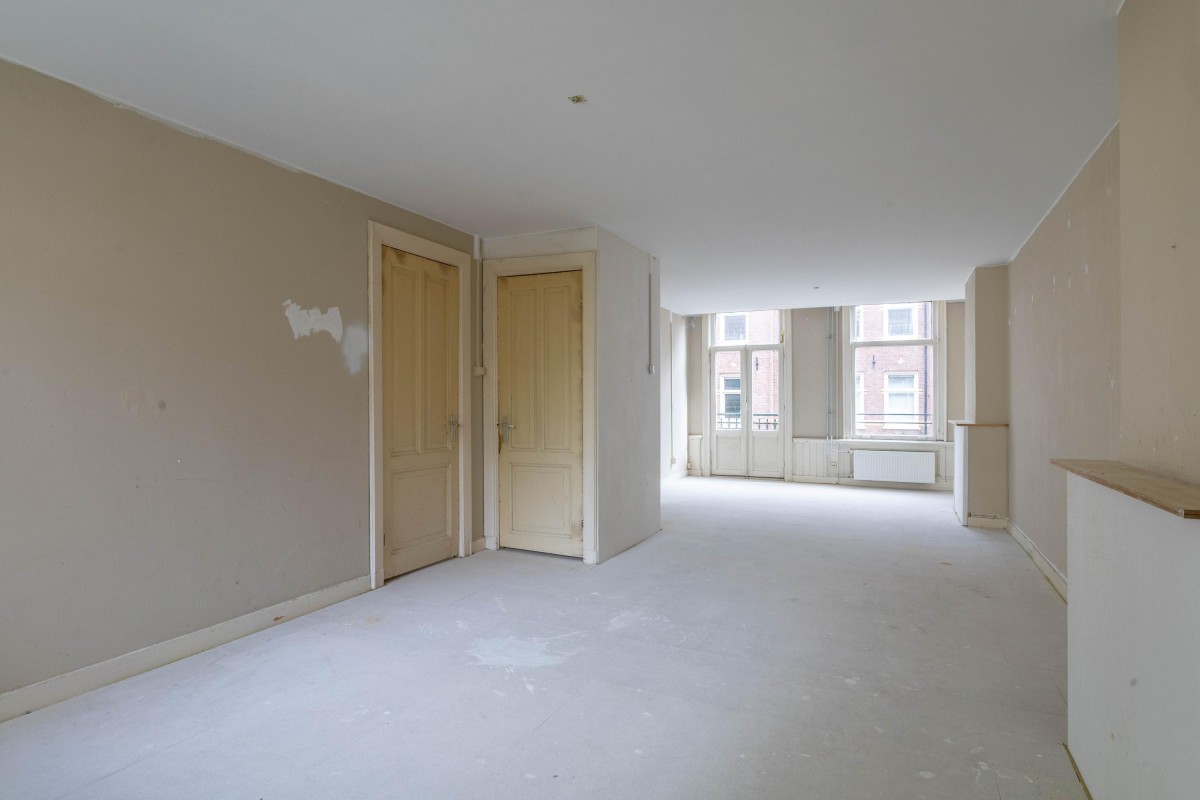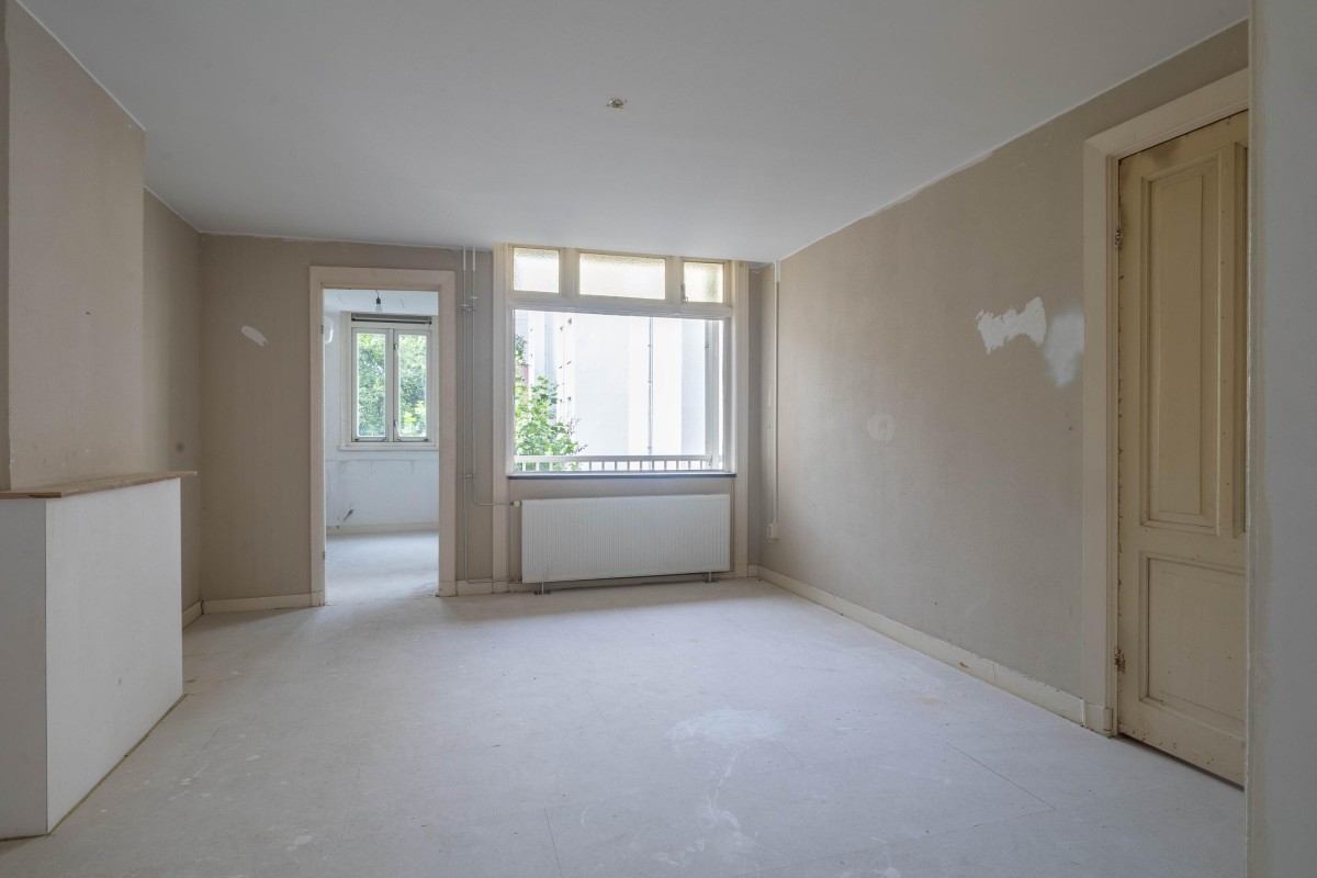 Lees verderAt the rear of the apartment is the bedroom, with a window facing the balcony. You will also have access to the generous living room of approximately 38 m². Thanks to windows on both sides and a French balcony at the front, this space is particularly bright and pleasant to live in.