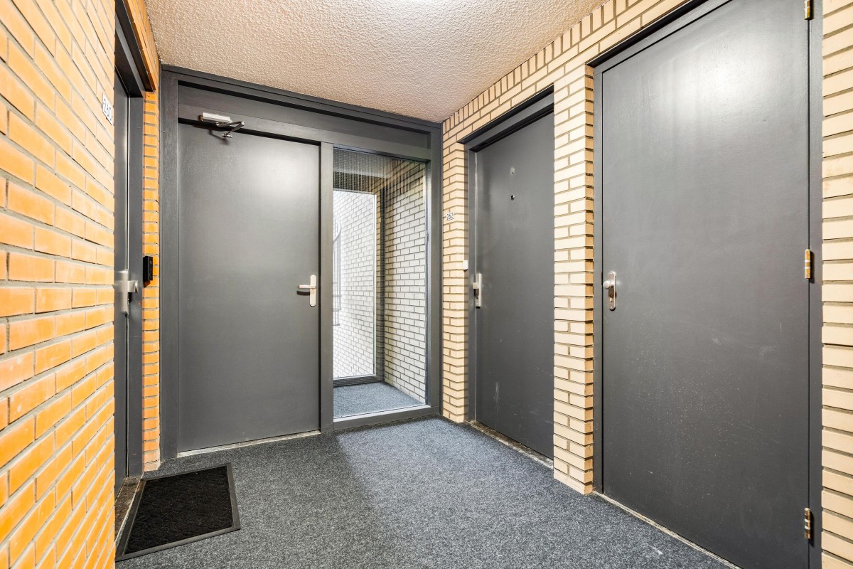 Access to the building is via the secured central entrance with doorbell panel, providing entry to the storage units and access to the stairwell or elevator to the upper floors.