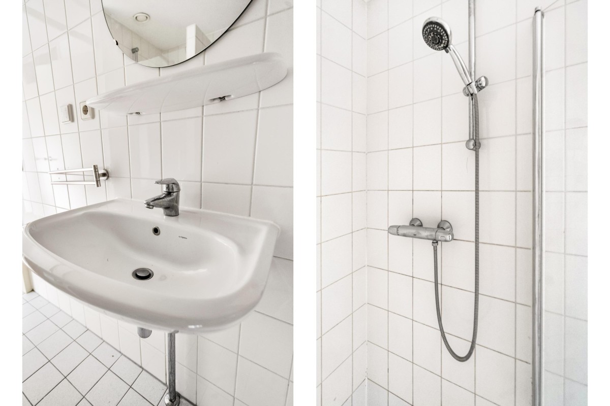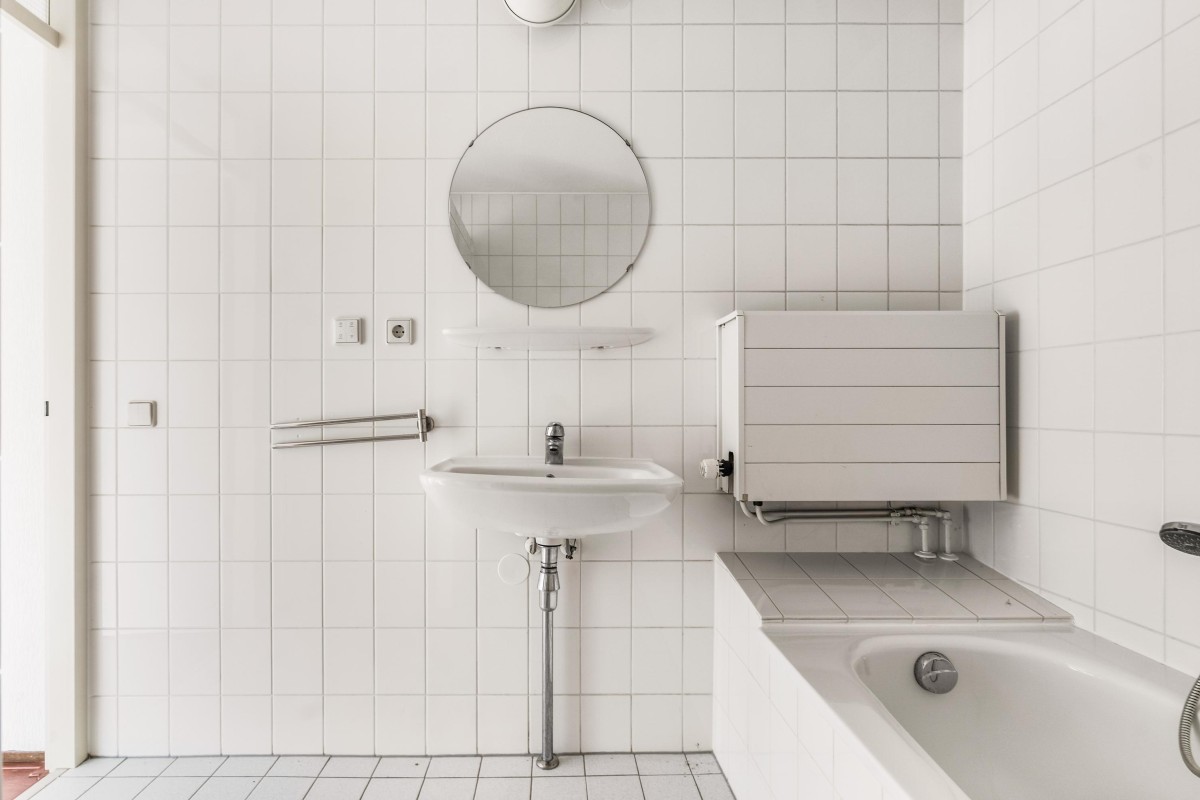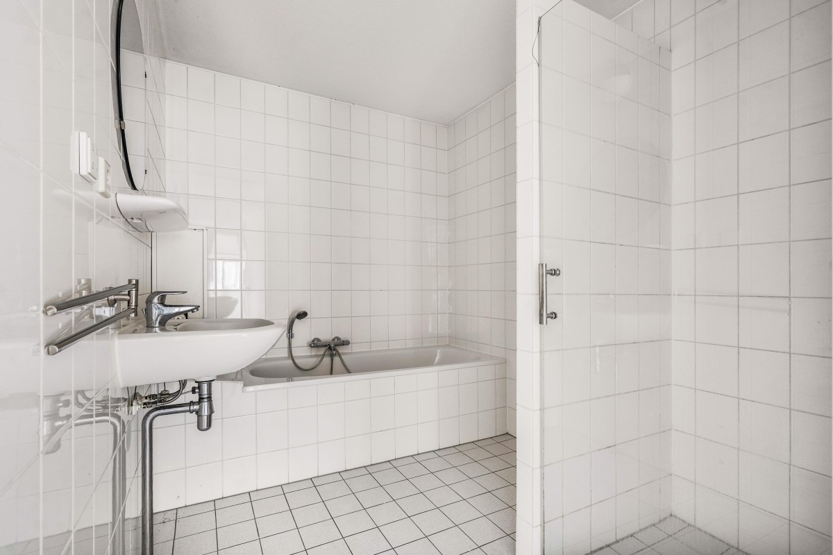 The simple bathroom features a bathtub, shower cabin, and washbasin. With a size of 5.4 m², it offers sufficient space to create a practical walk-in shower and, for example, a vanity unit with drawers.
