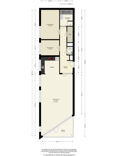 The two bedrooms measure 14.2 m² and 7.3 m² and are located on the cooler northeast side of the building.