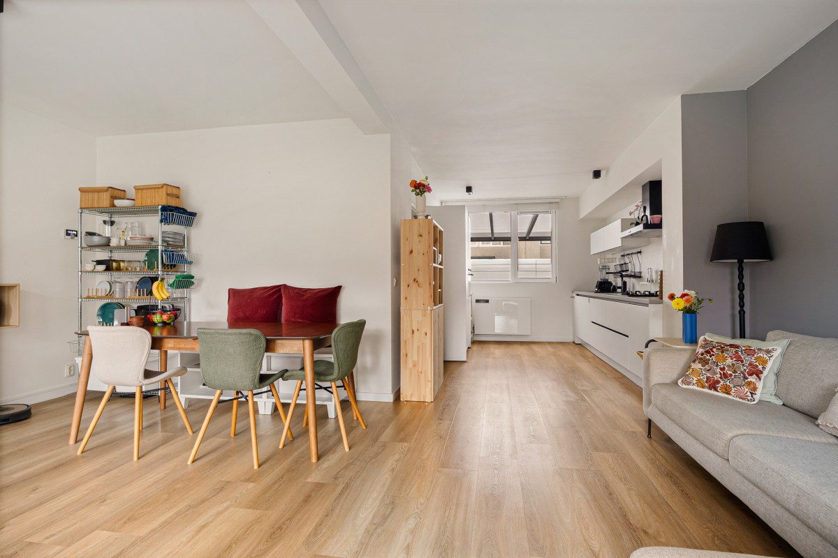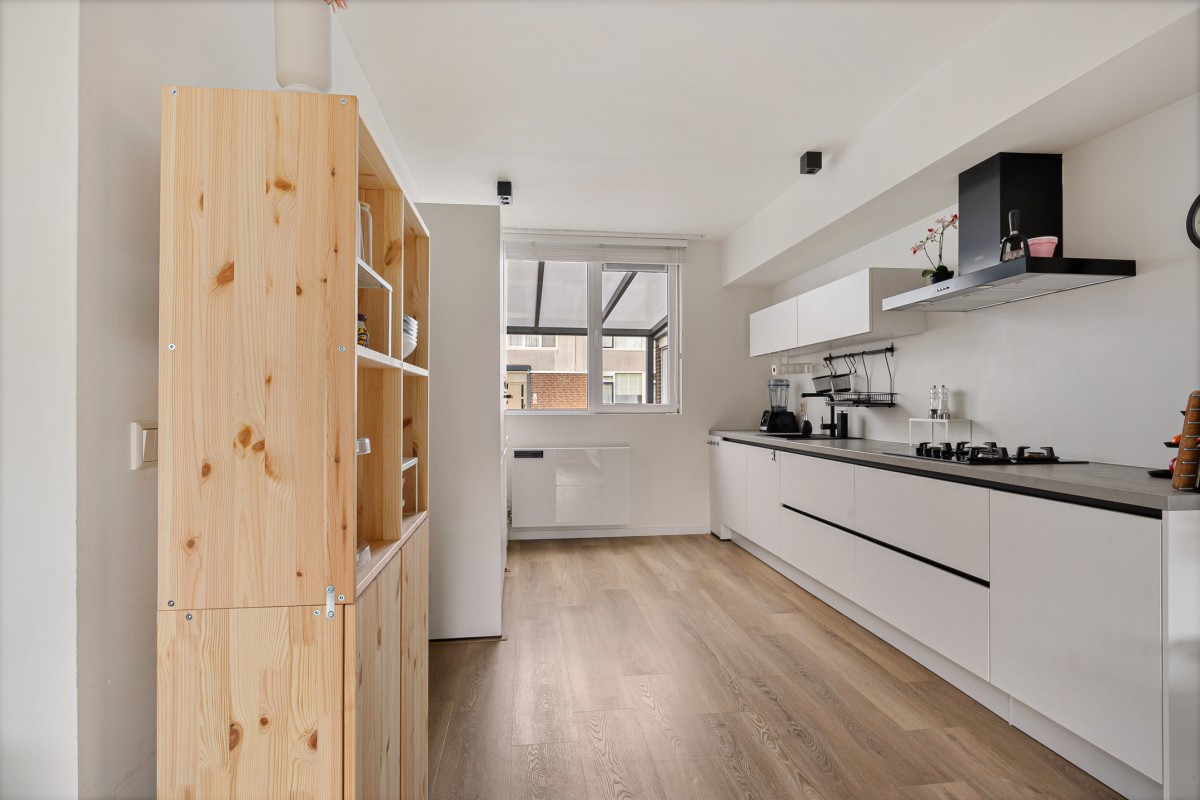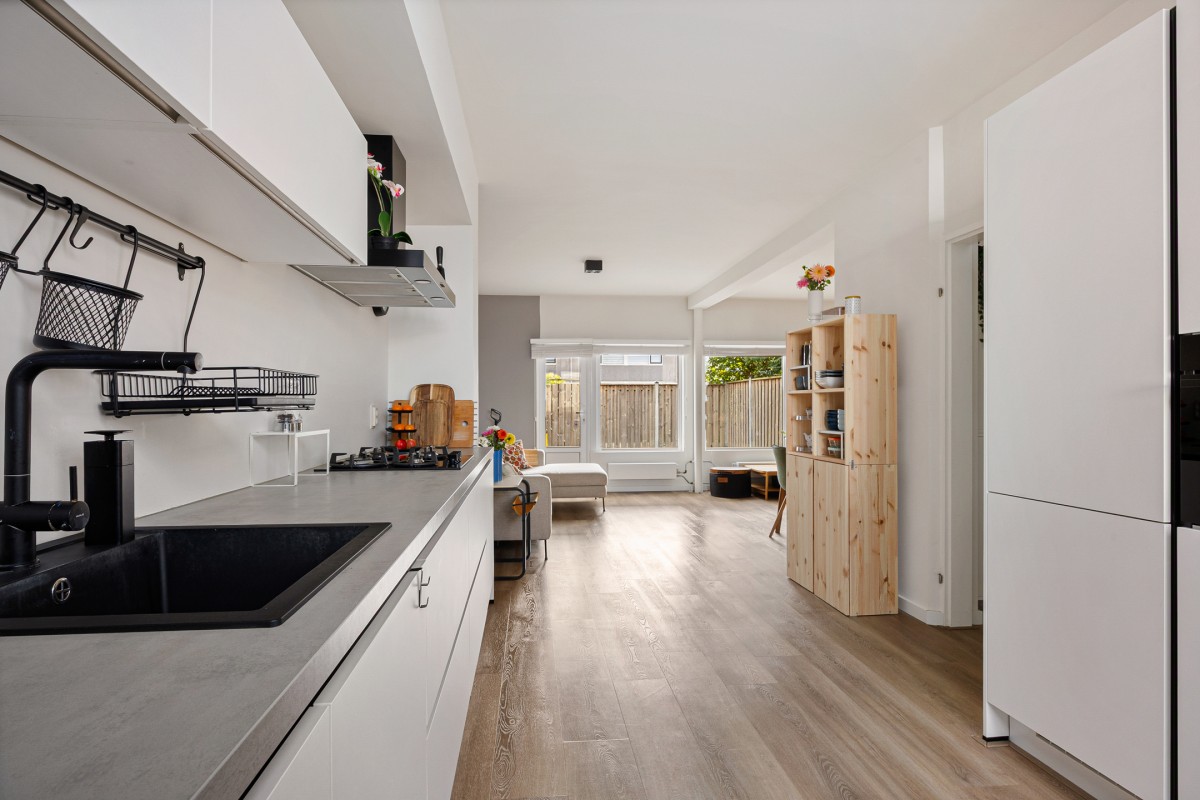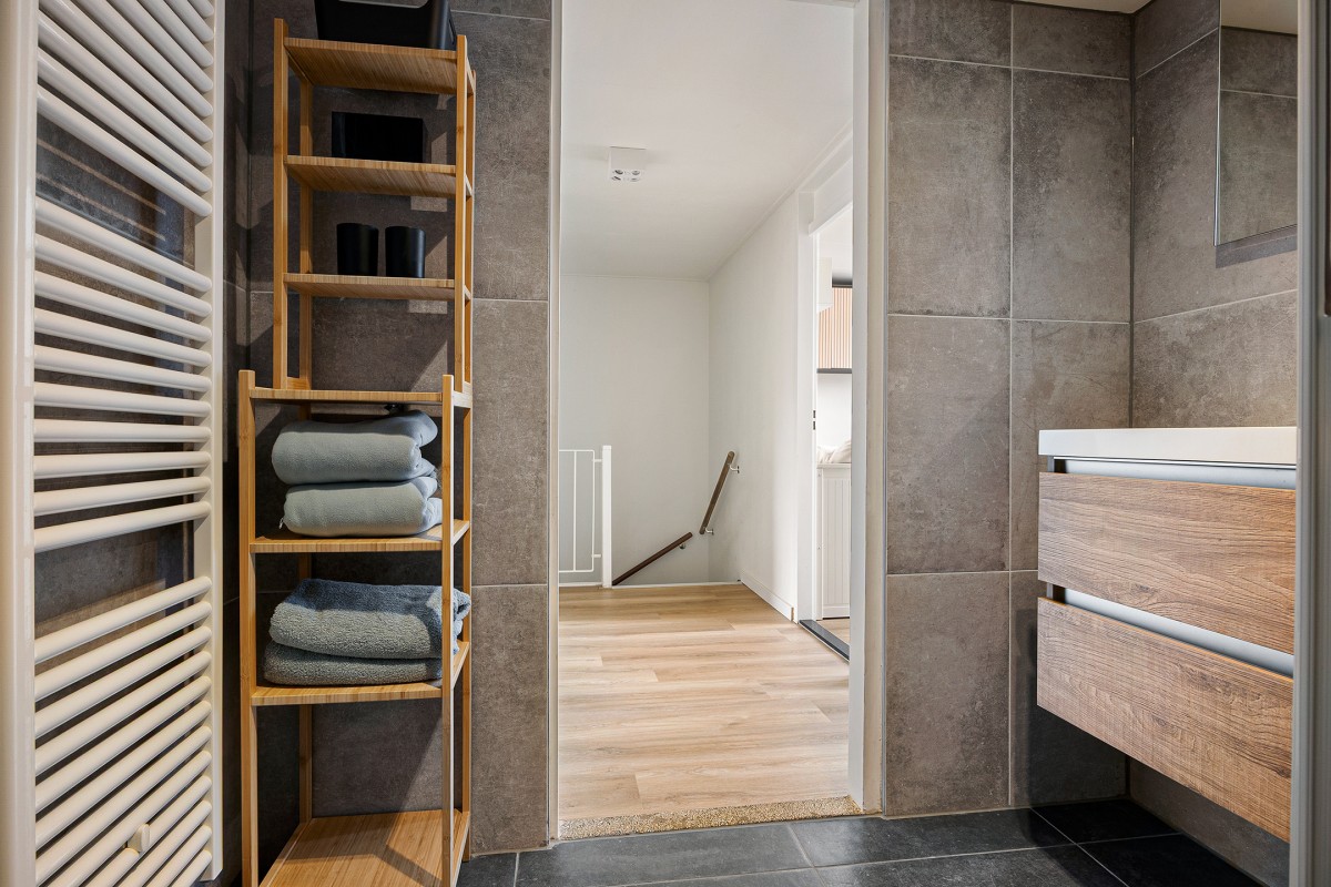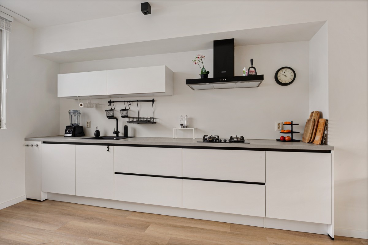 The modern, open kitchen is located at the front of the house and is equipped with a 4-burner gas stove, an extractor hood, and a dishwasher. On a separate wall, you will find the built-in refrigerator with freezer compartment and a combination oven. The large countertop provides ample space to prepare meals, and thanks to the many drawers and cupboards, there is plenty of storage space.