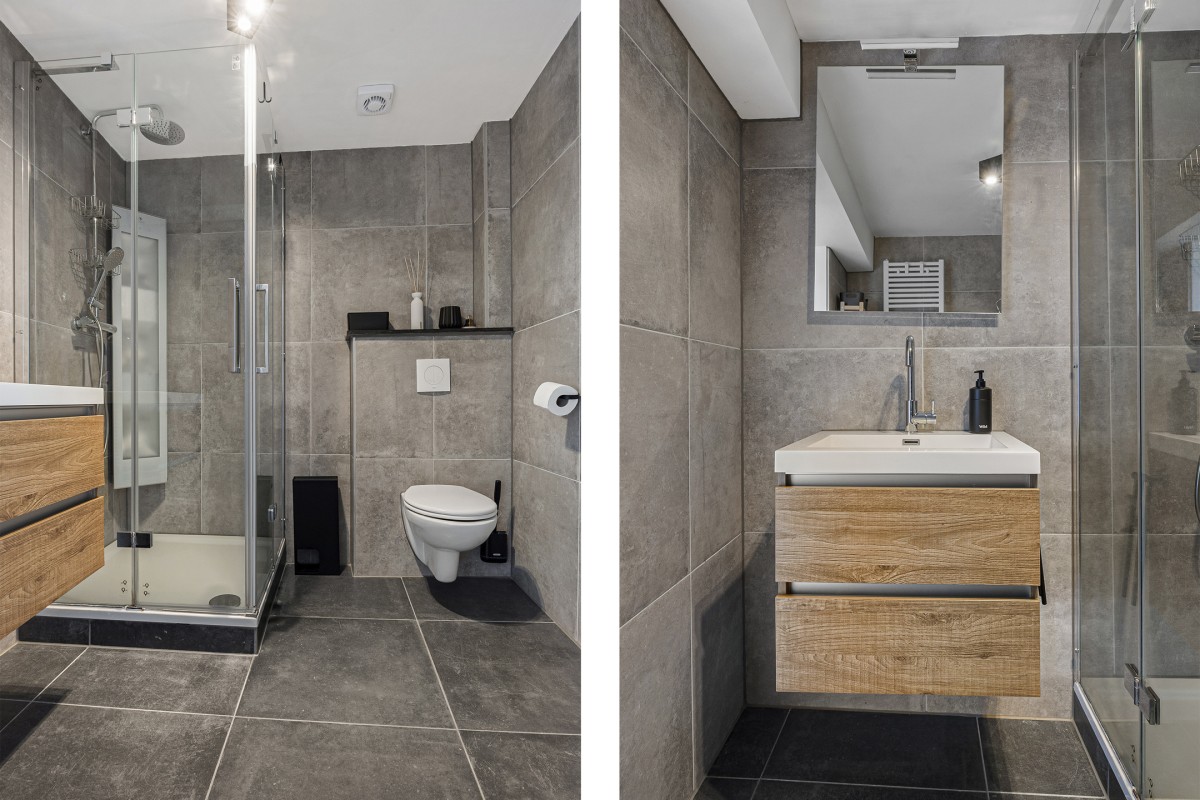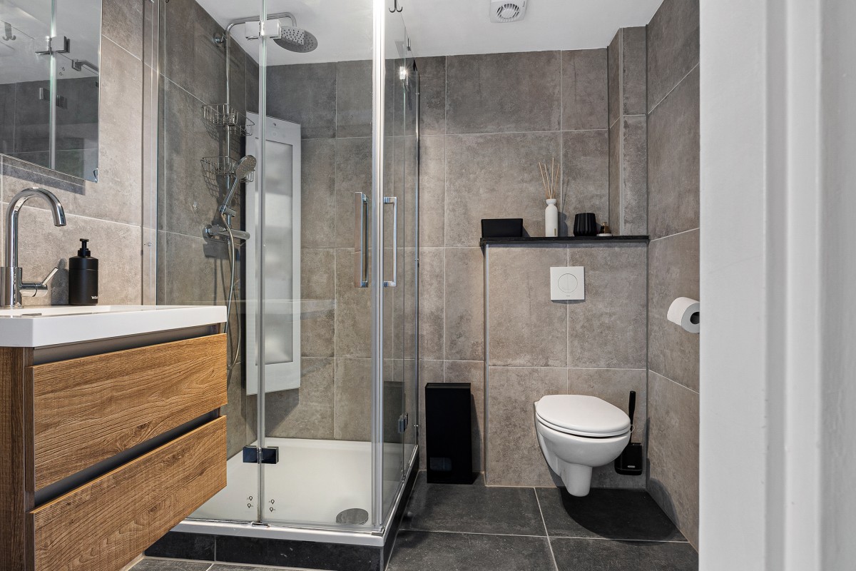 The modern bathroom (2019) includes a large shower cabin with a luxurious sunshower, a second toilet, and a washbasin with a vanity unit.