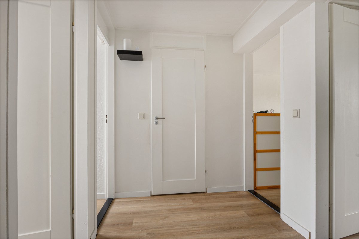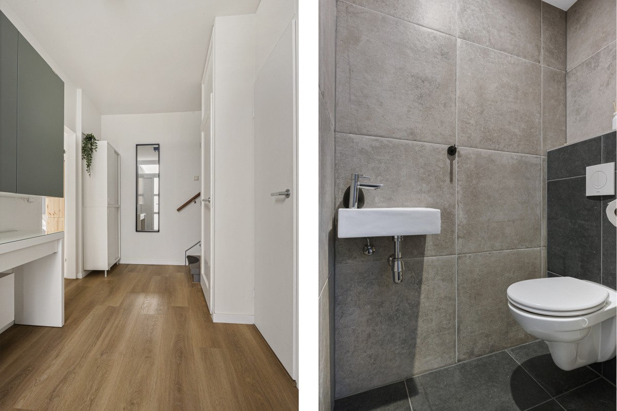 Lees verderA spacious hall with a toilet room featuring a wall-hung toilet and sink, stairs to the upper floor, utility cupboard, door to the storage room, and passage to the living room.