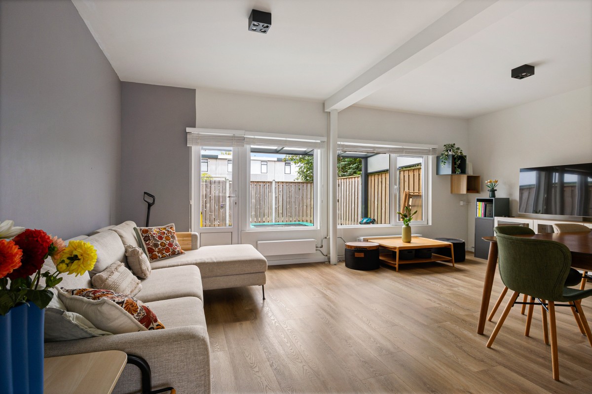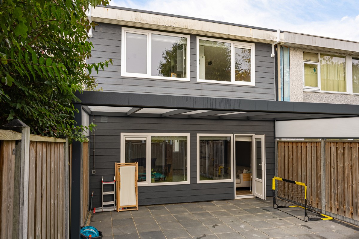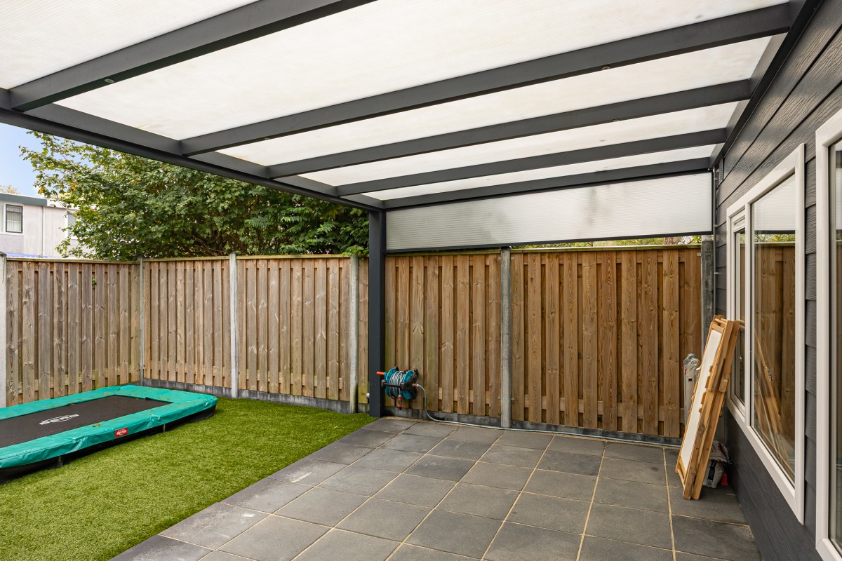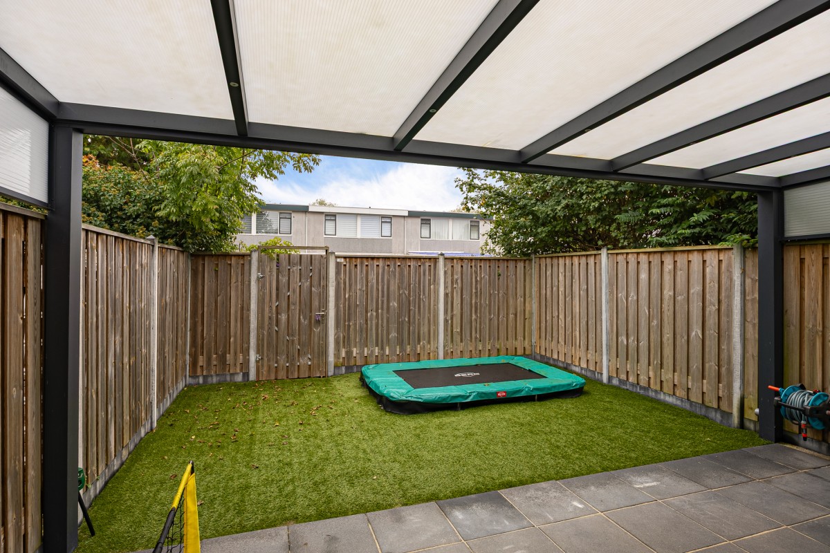 Through the French doors, you have access to the backyard. Under the covered terrace, you will always find a sheltered and pleasant spot to enjoy a warm summer day. The garden is east-facing and features low-maintenance artificial grass and fences around the perimeter. There is also a rear entrance.