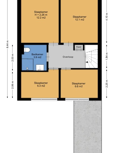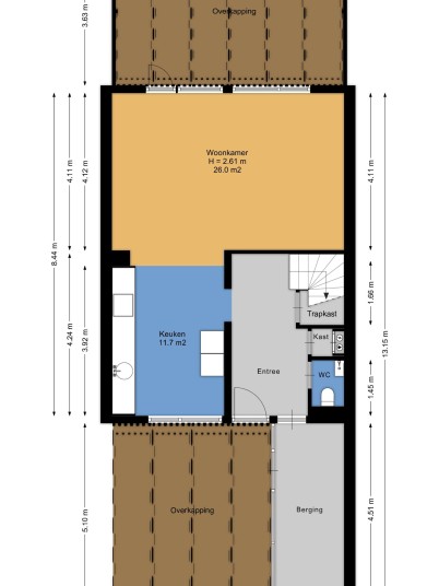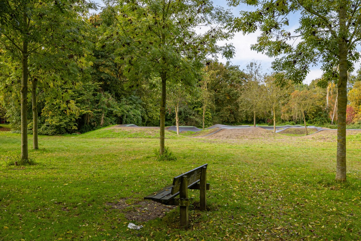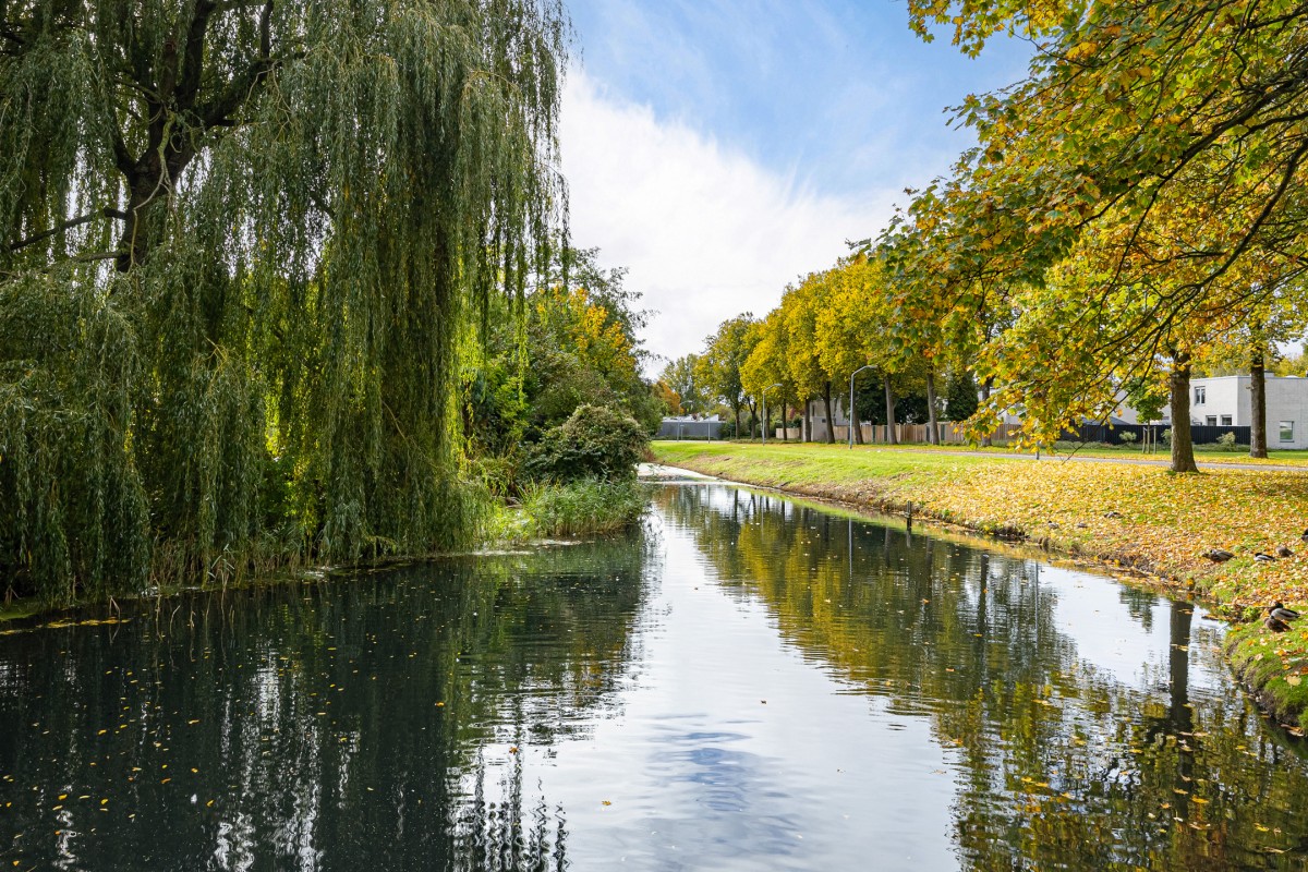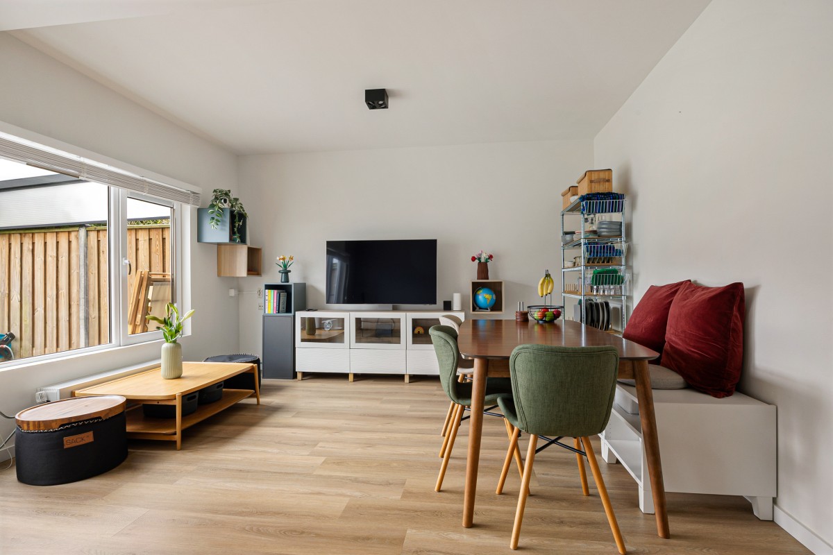 Through the French doors, you have access to the backyard. Under the covered terrace, you will always find a sheltered and pleasant spot to enjoy a warm summer day. The garden is east-facing and features low-maintenance artificial grass and fences around the perimeter. There is also a rear entrance.