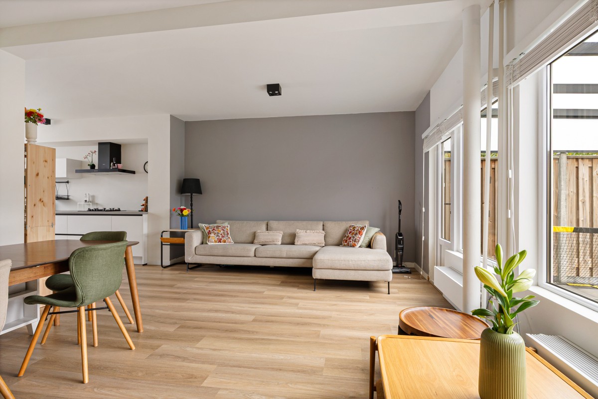 At the rear of the house is the living area. Thanks to the large windows, this space benefits from a pleasant amount of natural light. There is more than enough room for a comfortable seating area with a large sofa and a dining table, where you can easily dine or relax with family and friends.