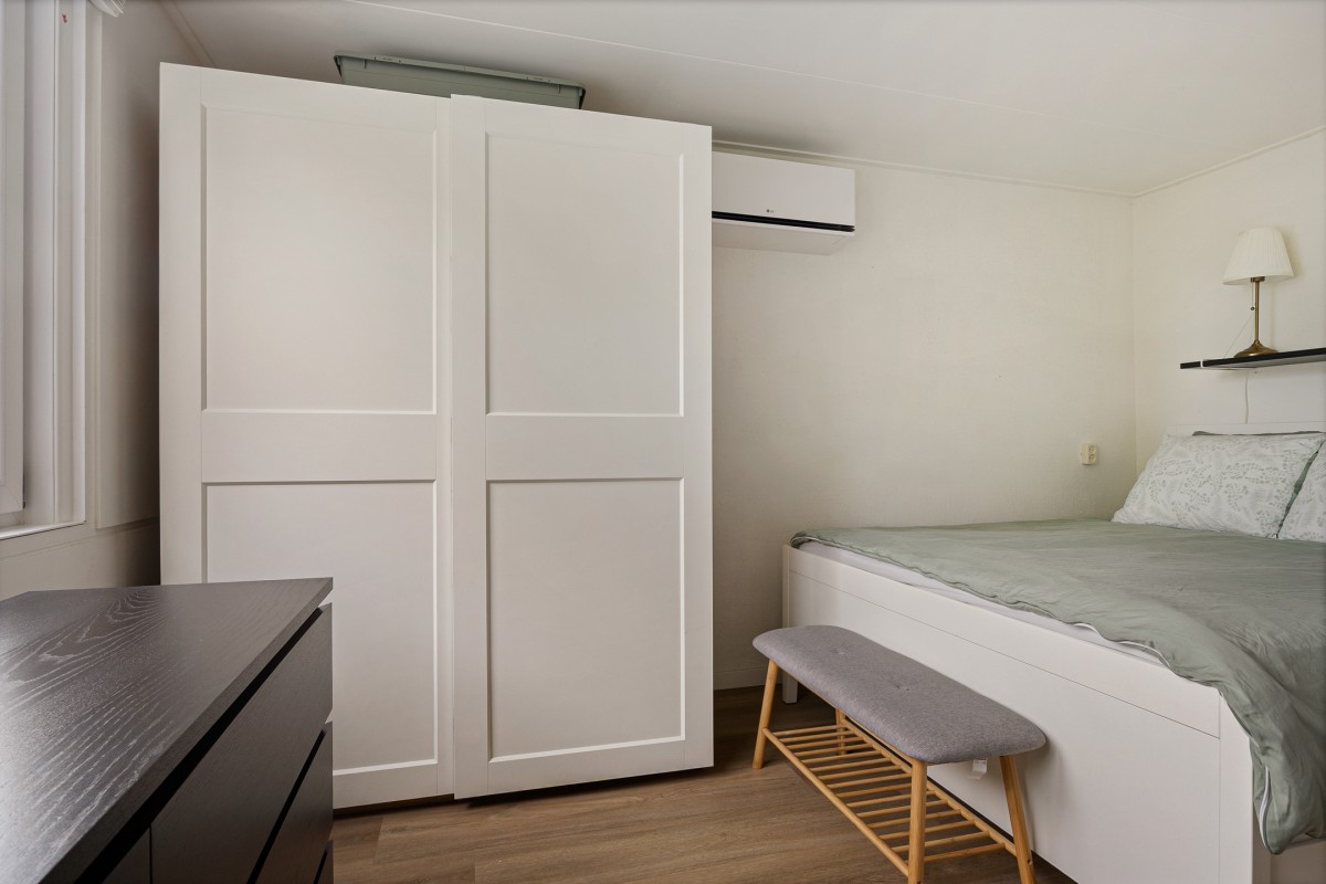 At the front of the house, there is a practical storage room, which also houses the washing machine and dryer setup. Additionally, there is plenty of space to store bicycles, tools, or extra supplies.