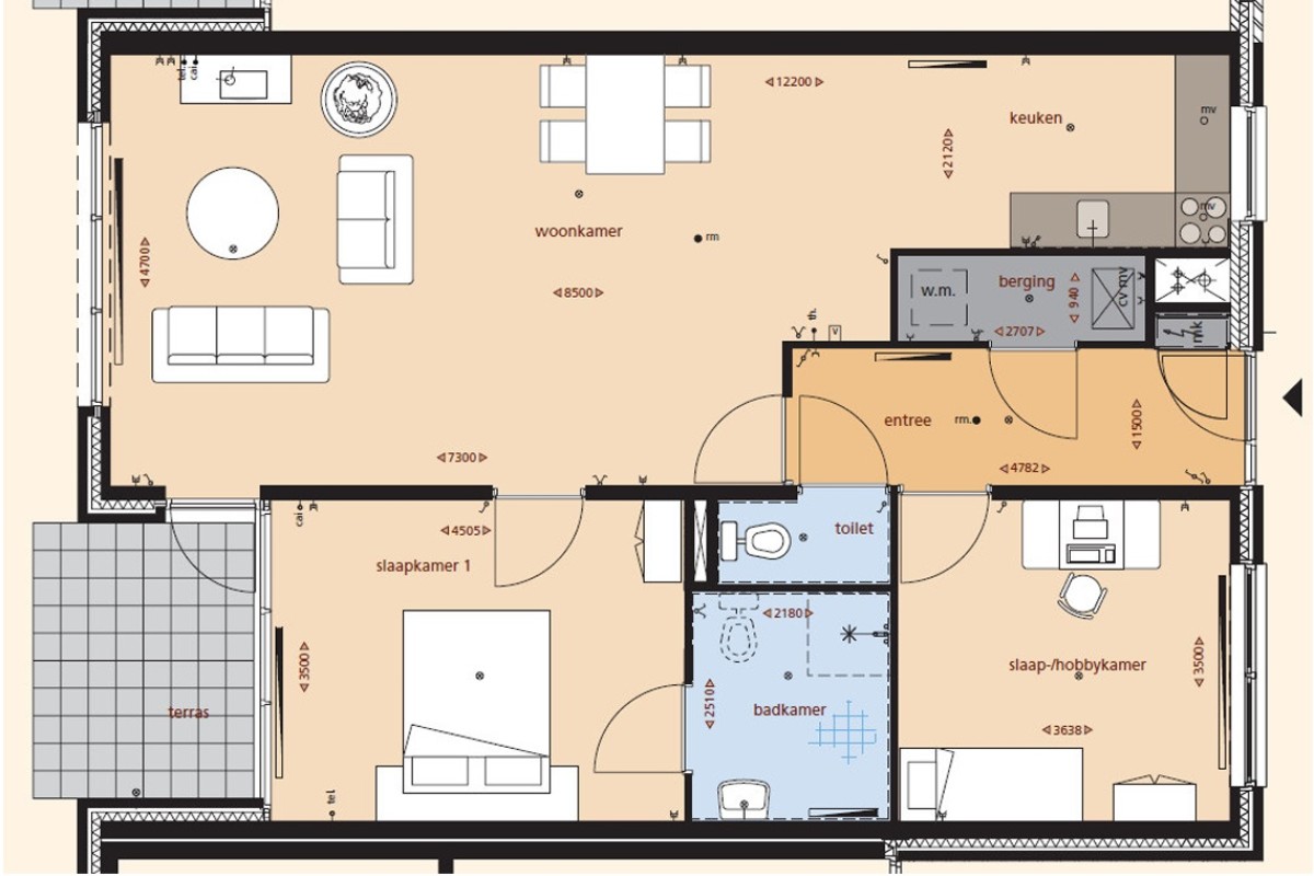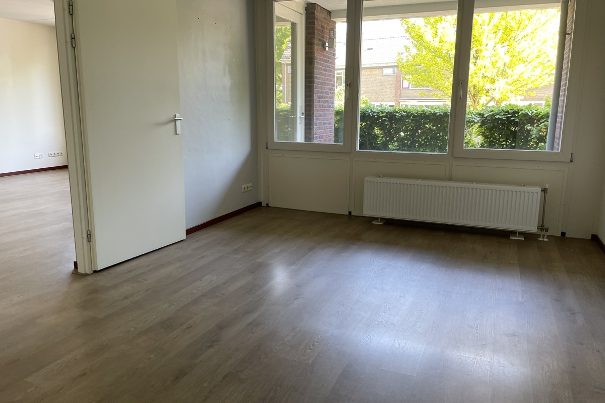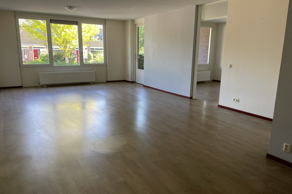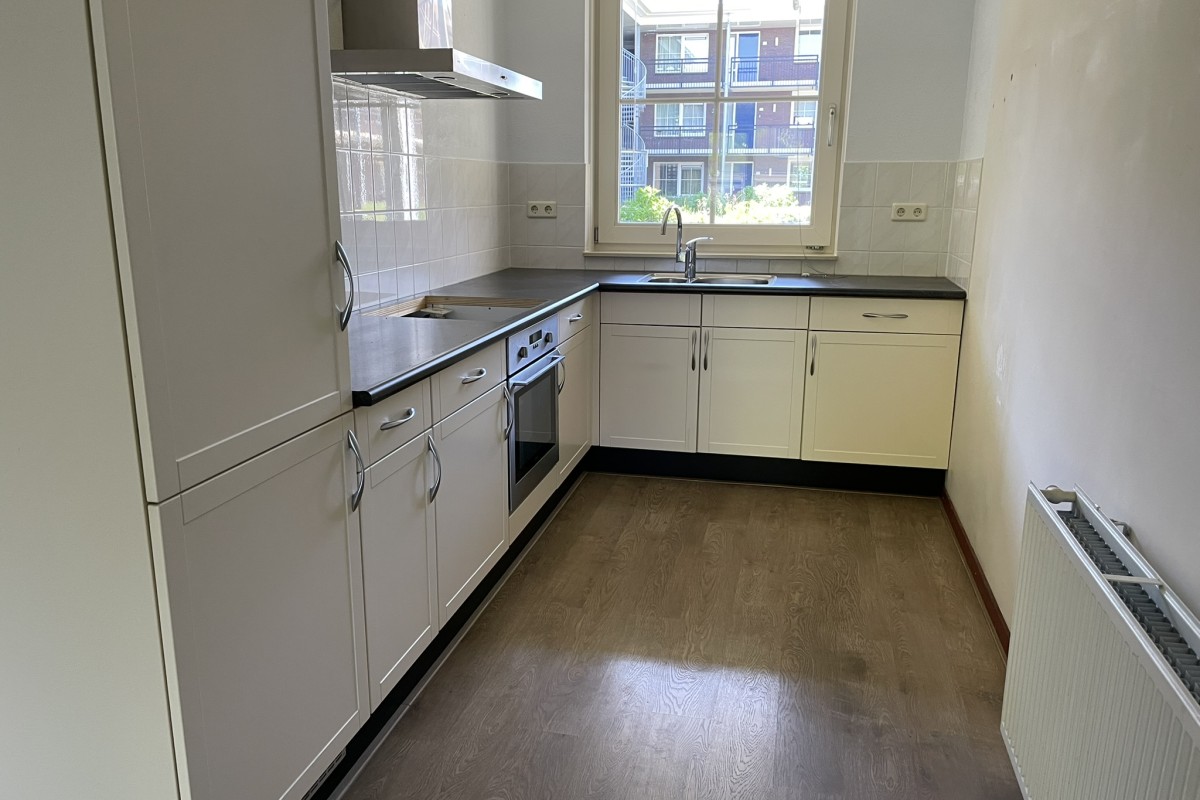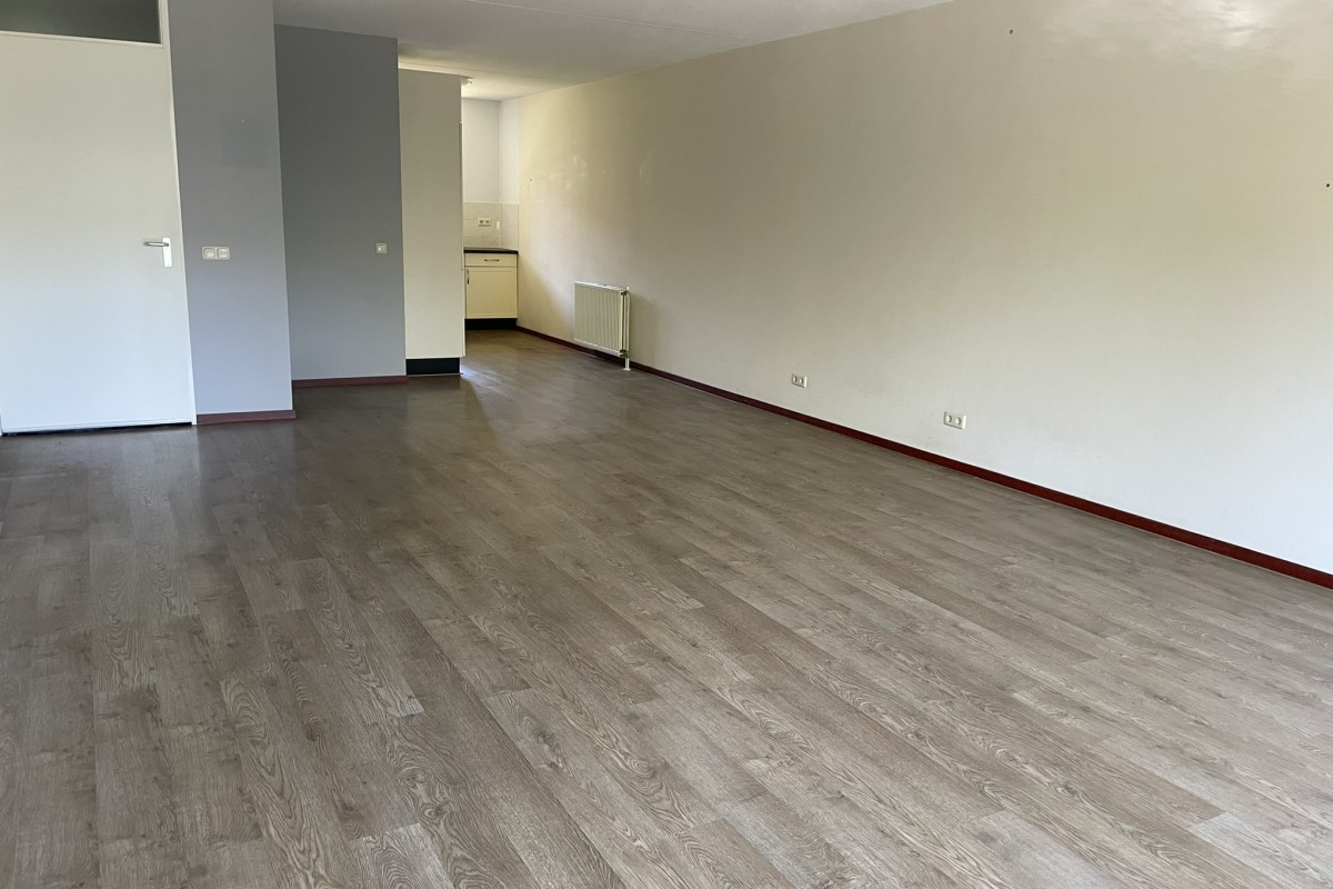 Entree, ruime hal met meterkast, berg-/was-/stookruimte en toilet. Royale woonkamer met toegang tot terras ( gelegen op het noordoosten ). Keuken in lichte kleurstelling voorzien van inbouwapparatuur.
