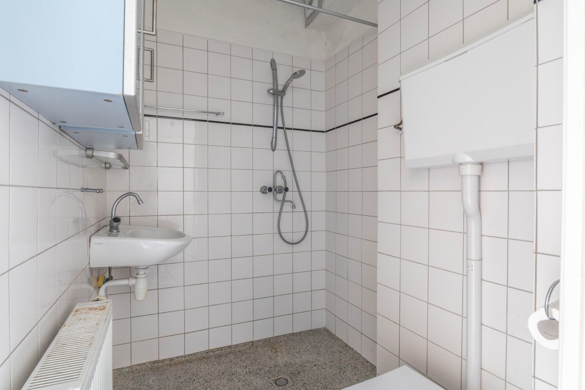 The bathroom is compact but efficiently laid out with a shower, sink, and toilet. The separate kitchen is functional and offers ample storage space, the central heating boiler, and a washing machine connection. From the kitchen, you step onto the second balcony, located at the quiet rear side. The main bedroom, also at the rear, has access to this balcony. A convenient storage cupboard is also located here.