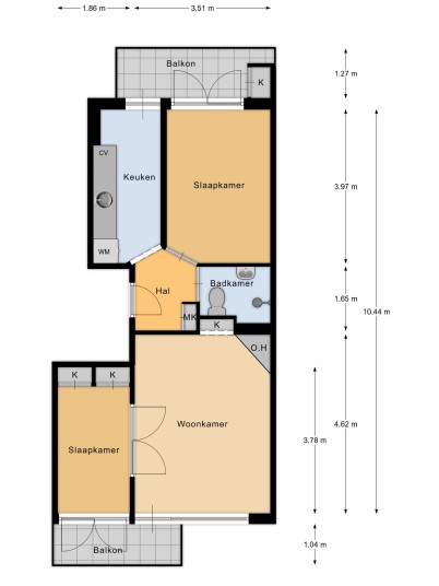 - Living area: approx. 48.4 m²; total usable area: approx. 60.8 m²; volume: approx. 183.6 m³ (according to NEN 2580 measurement report);