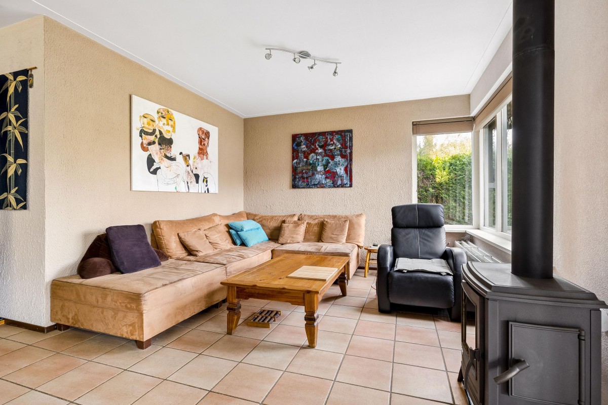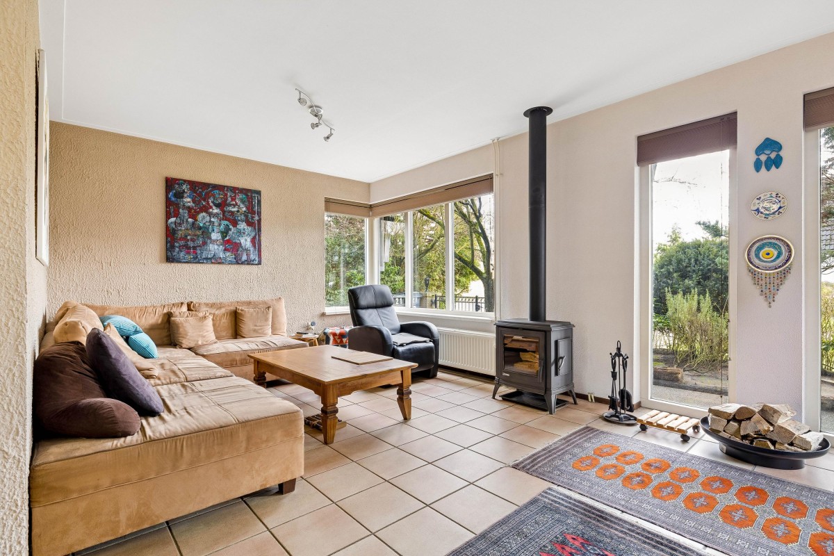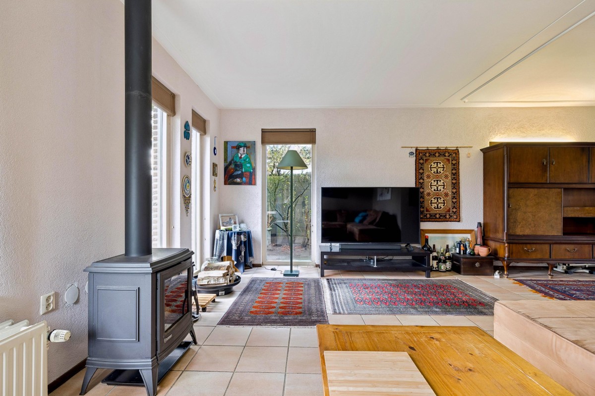The hallway of the main house provides access to the toilet, meter cupboard, staircase to the first floor, and the living room. The cozy living room is located at the front of the house and features a wood-burning stove, adding warmth and atmosphere.