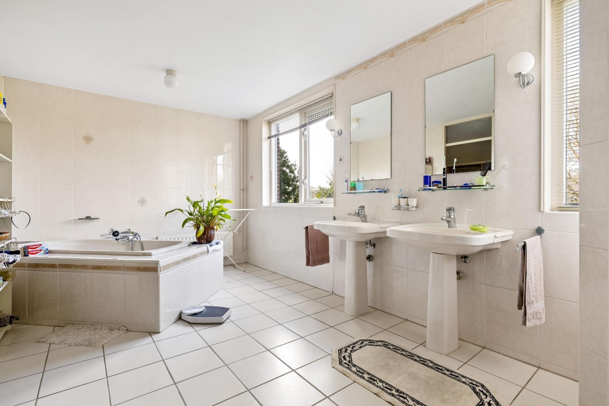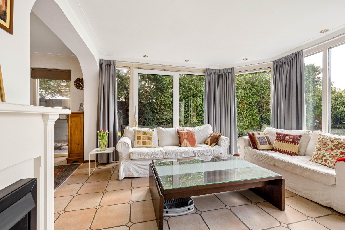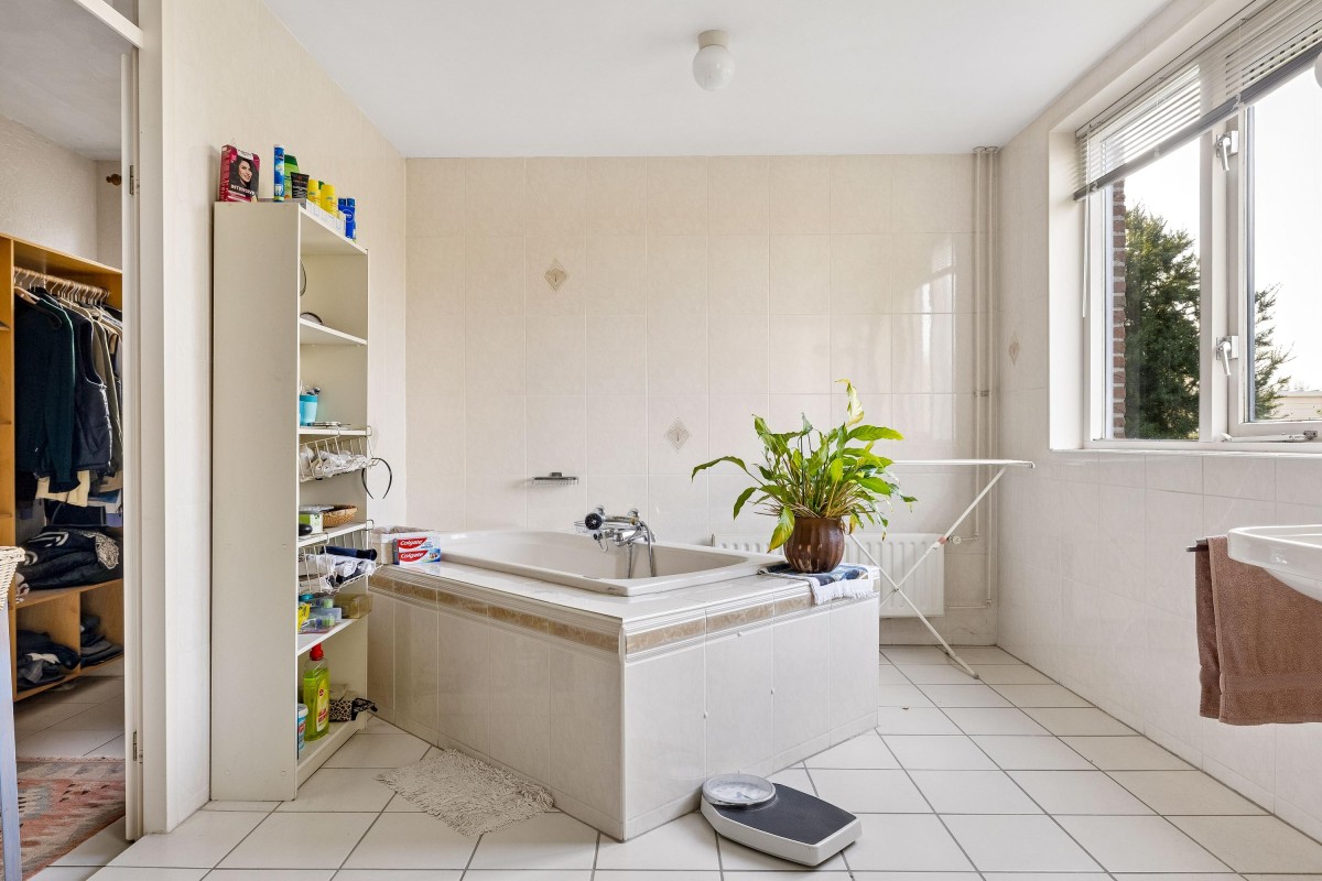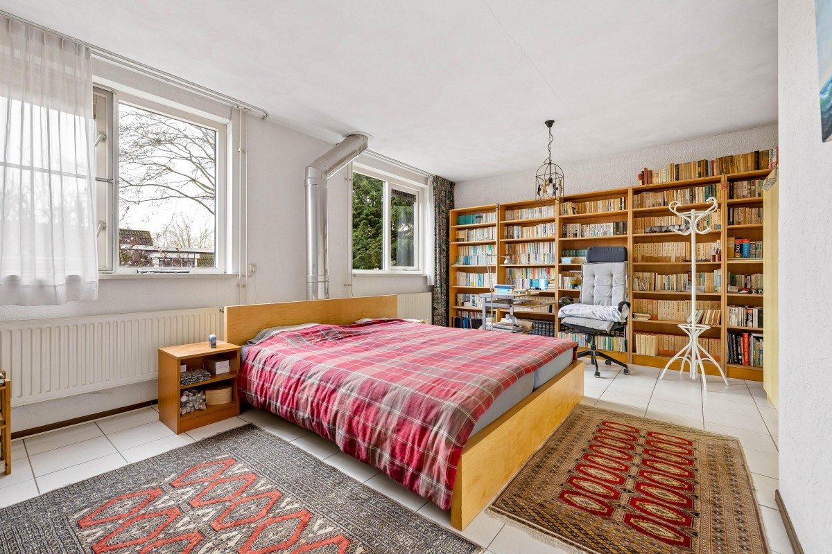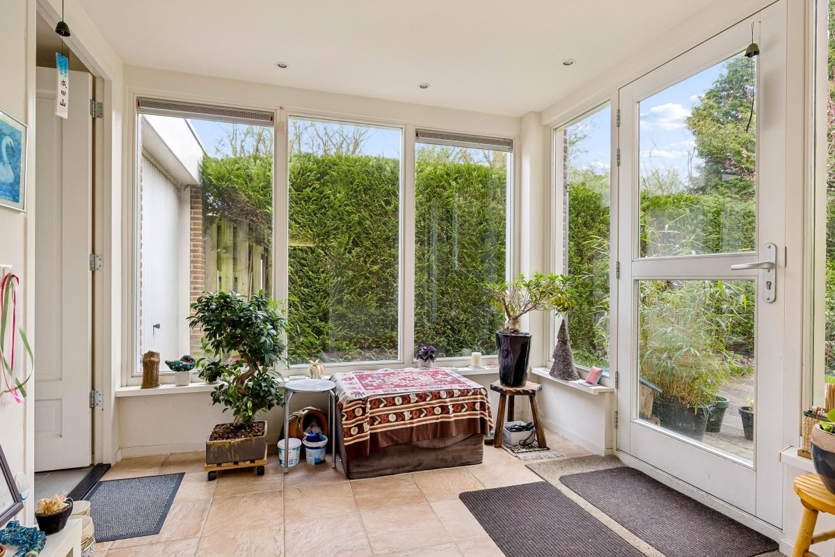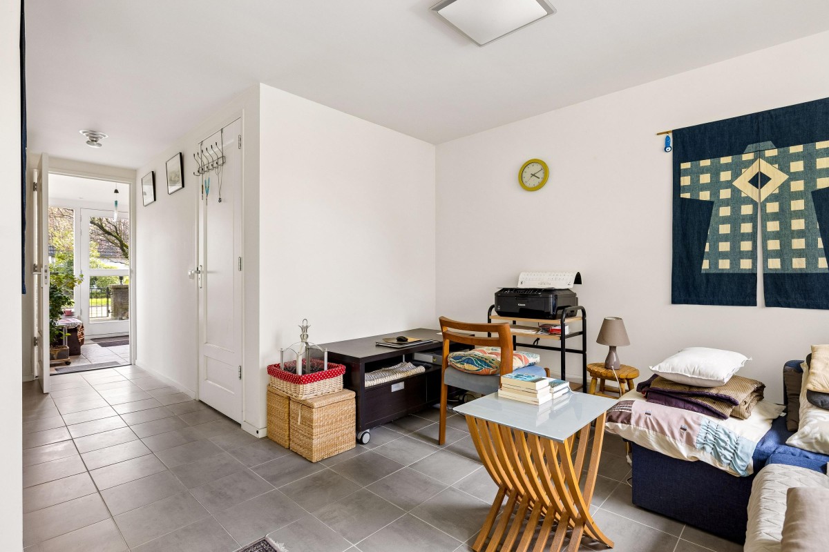 The extension created a self-contained living area with a living room, bedroom, and en-suite bathroom. This space features electric underfloor heating, HR++ glazing, plastic window frames, and sliding doors to the backyard, making it very suitable for lifetime living, people with reduced mobility, or a live-in family member.