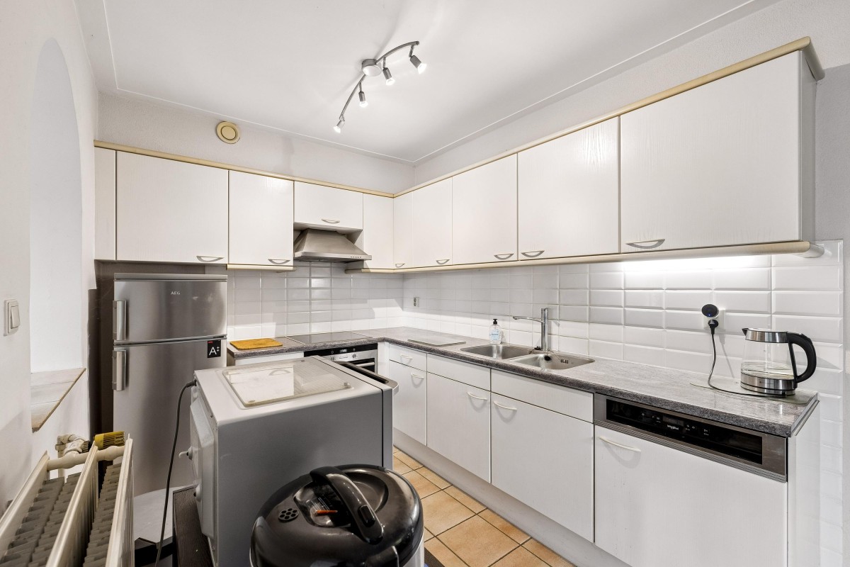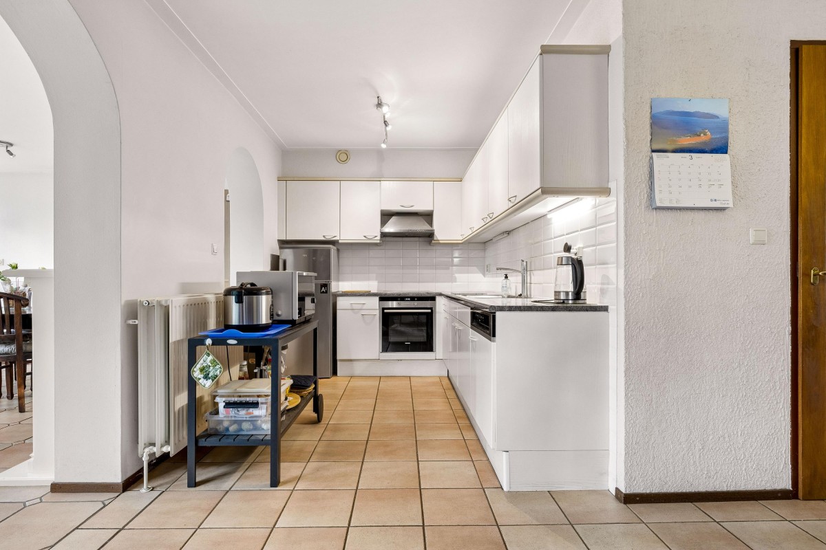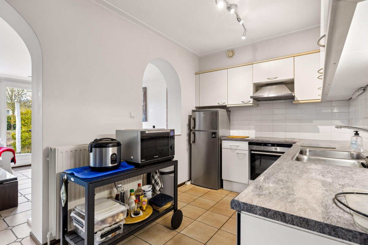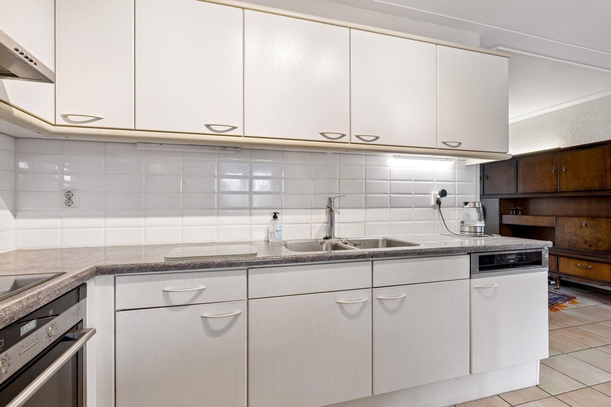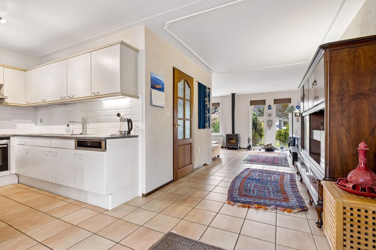 At the rear of the house is the spacious kitchen-diner, adjacent to the extension. Large windows provide a beautiful view of the green backyard and the water. The kitchen is arranged in a light-colored corner layout and equipped with built-in appliances such as a dishwasher, combi microwave, ceramic cooktop, extractor hood, and a double sink, along with ample cupboard space. Double French doors in the extension open to the backyard.