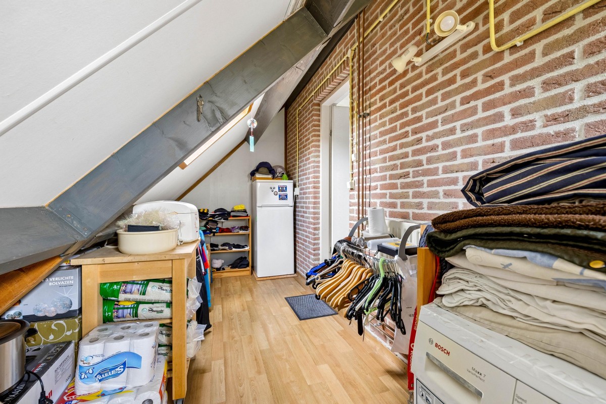 The laundry room, located under the sloping roof, offers plenty of storage space and contains the connections for a washing machine and dryer, as well as the inverter for the solar panels.