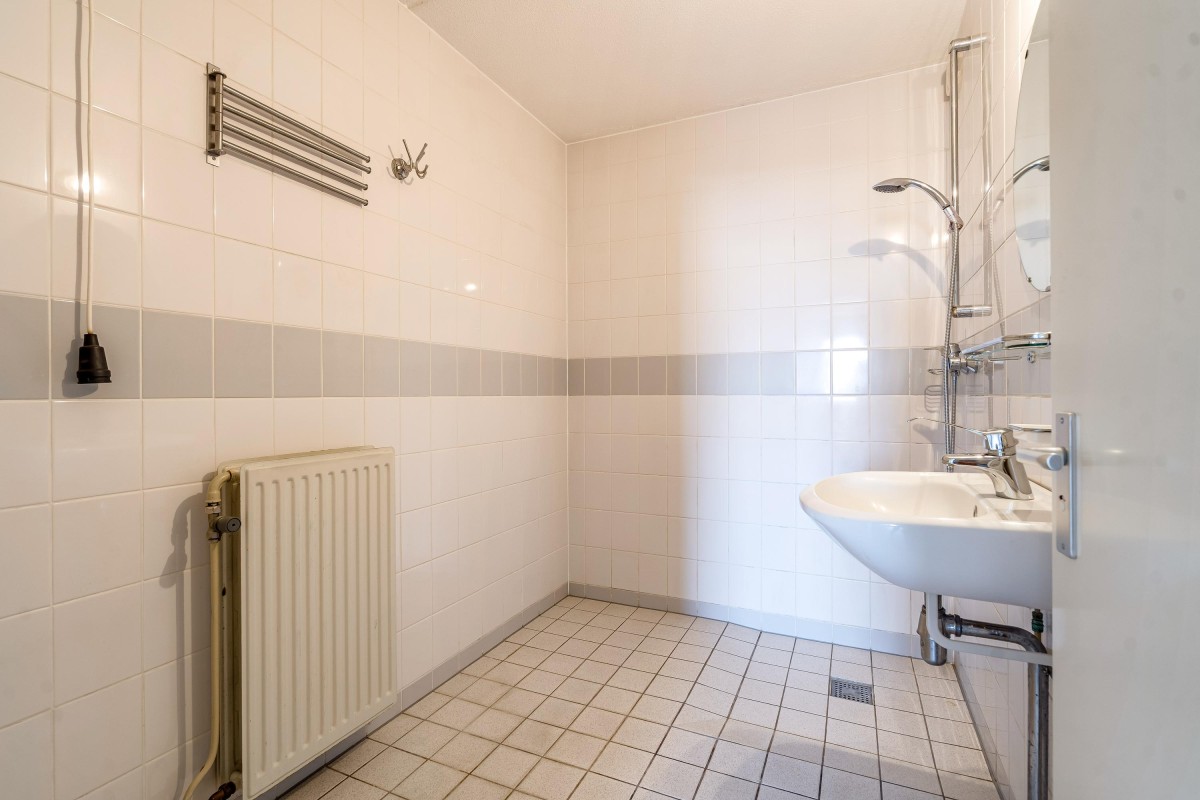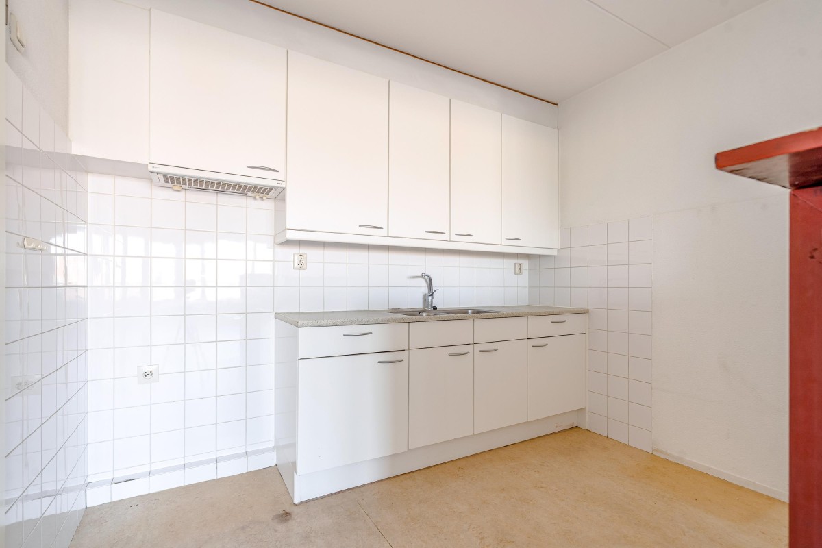 Hallway with meter cupboard, toilet, and access to the bedrooms, bathroom, and living room with a semi-open kitchen. The spacious and bright living room opens onto the northwest-facing balcony. The semi-open kitchen offers ample storage space and is equipped with a standard kitchen unit and extractor fan. Adjacent to the kitchen is a practical storage cupboard. The apartment has three bedrooms, one of which is accessible from the living room. The bathroom features a walk-in shower, sink, and washing machine connection.