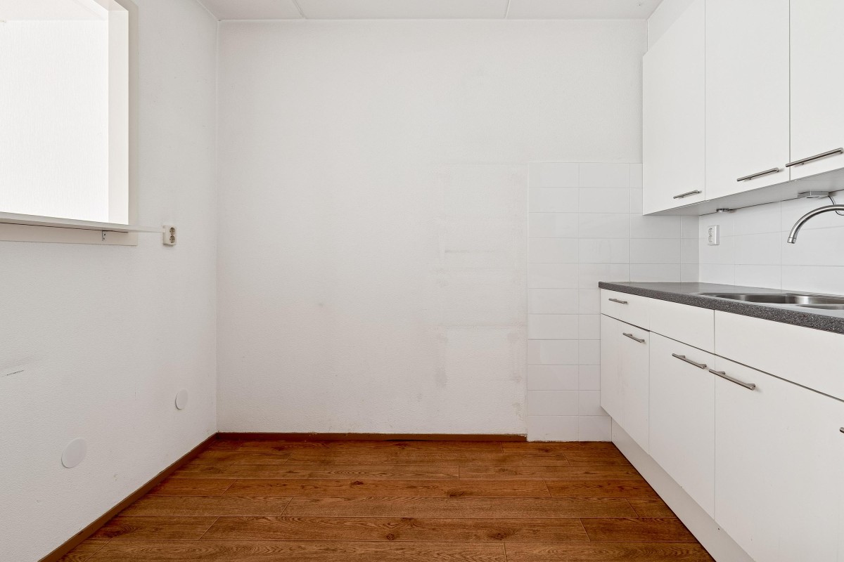 The entrance/hallway gives access to nearly all rooms. The spacious living room is flooded with natural light and provides access to the large balcony facing south. The standard kitchen features a worktop with upper cabinets and an extractor hood.