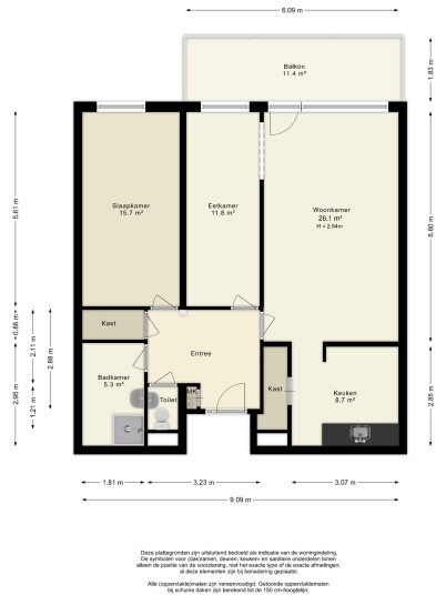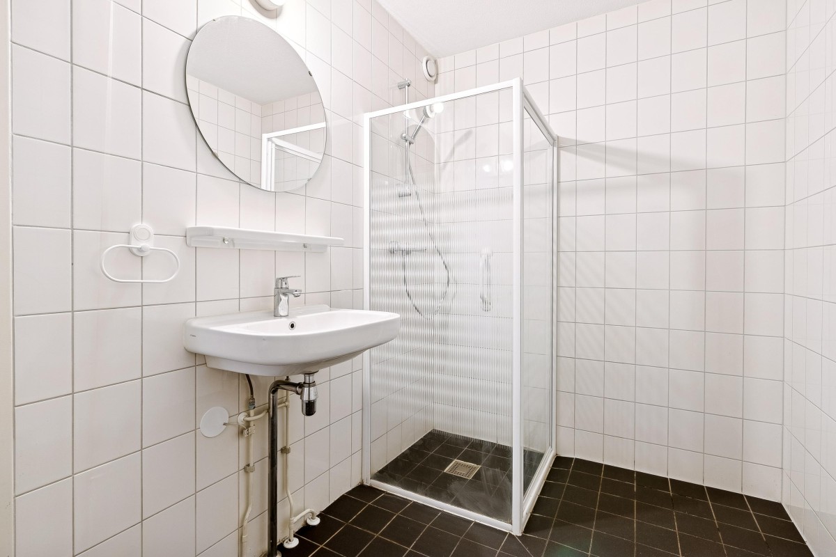 From the hallway, you also have access to a separate toilet, a storage room, the bathroom, and the master bedroom. The bathroom is equipped with a shower, washbasin, and washing machine connection. It's also very easy to add a washing machine connection in the storage room next to the bathroom with a small modification.