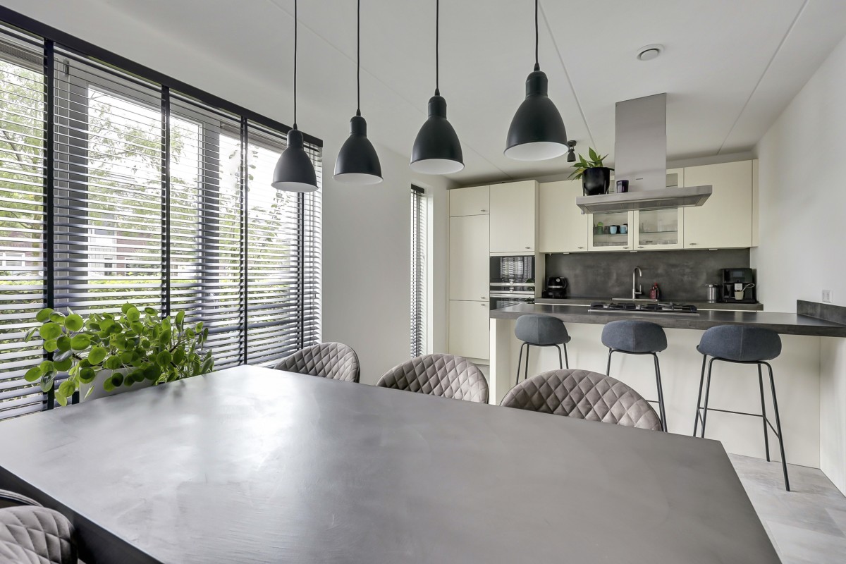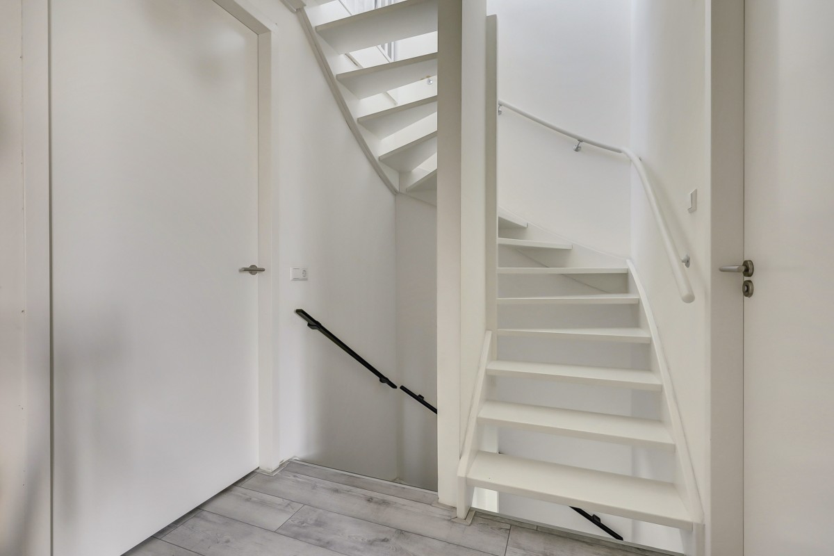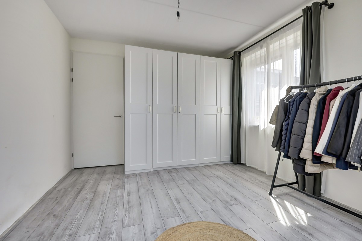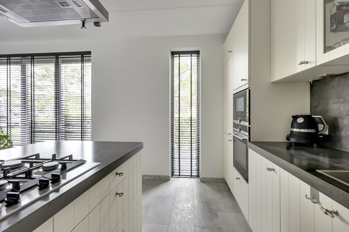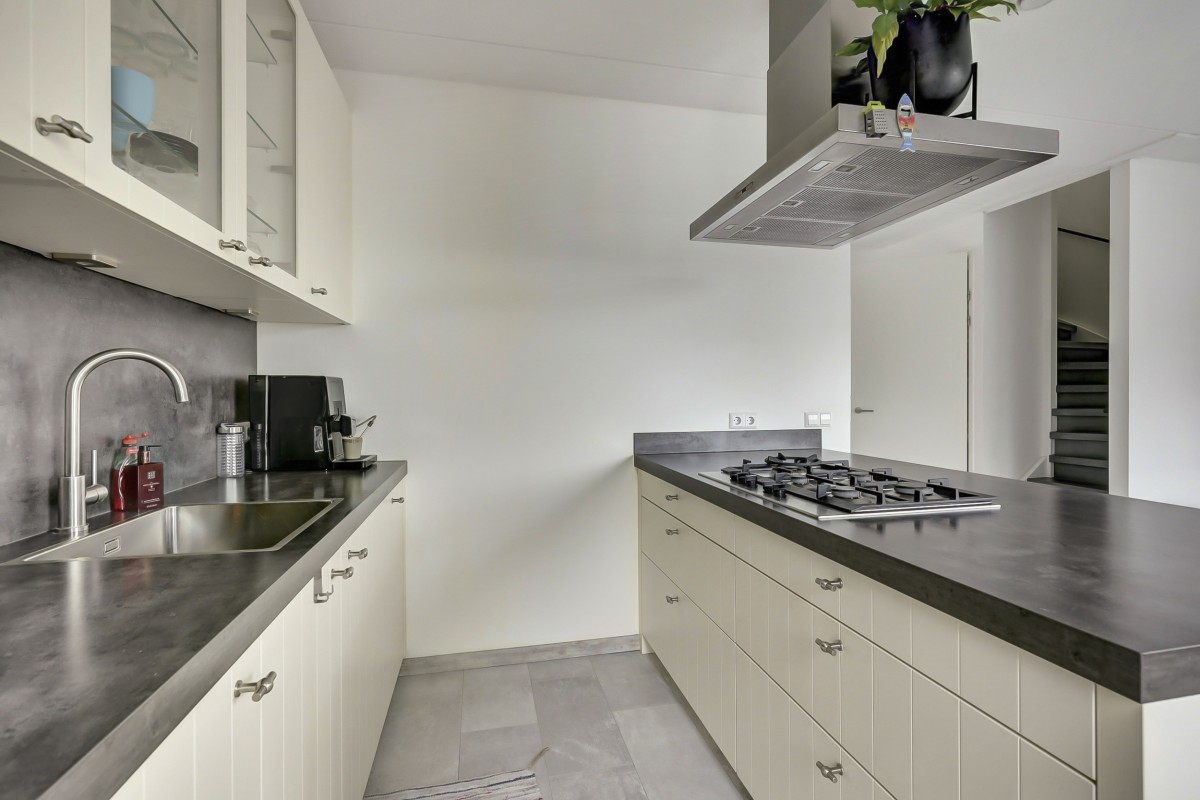 Ground floor: entrance with extensive meter cupboard, wardrobe, luxury toilet room with wall-mounted toilet and washbasin. The large garden-facing living room spans the entire width and features sliding doors and a beautiful fireplace. The large eat-in kitchen is situated at the front of the house, where the luxury built-in kitchen is equipped with a wall of cupboards and a kitchen island. The kitchen features a built-in dishwasher, 5-burner gas hob, refrigerator, freezer, microwave, and oven. Partly due to the width of the house, the dining area is very spacious and is illuminated by beautiful natural light from the street. A large staircase with storage space separates the living and dining areas. This provides the living room with more privacy at the rear. At the back of the house, a wide sliding door provides access to the garden. The garden is well-maintained and low-maintenance, and is also accessible along the side of the house. The garden faces west and features a detached wooden shed and a covered patio. The entire ground floor is equipped with underfloor heating and modern laminate flooring.