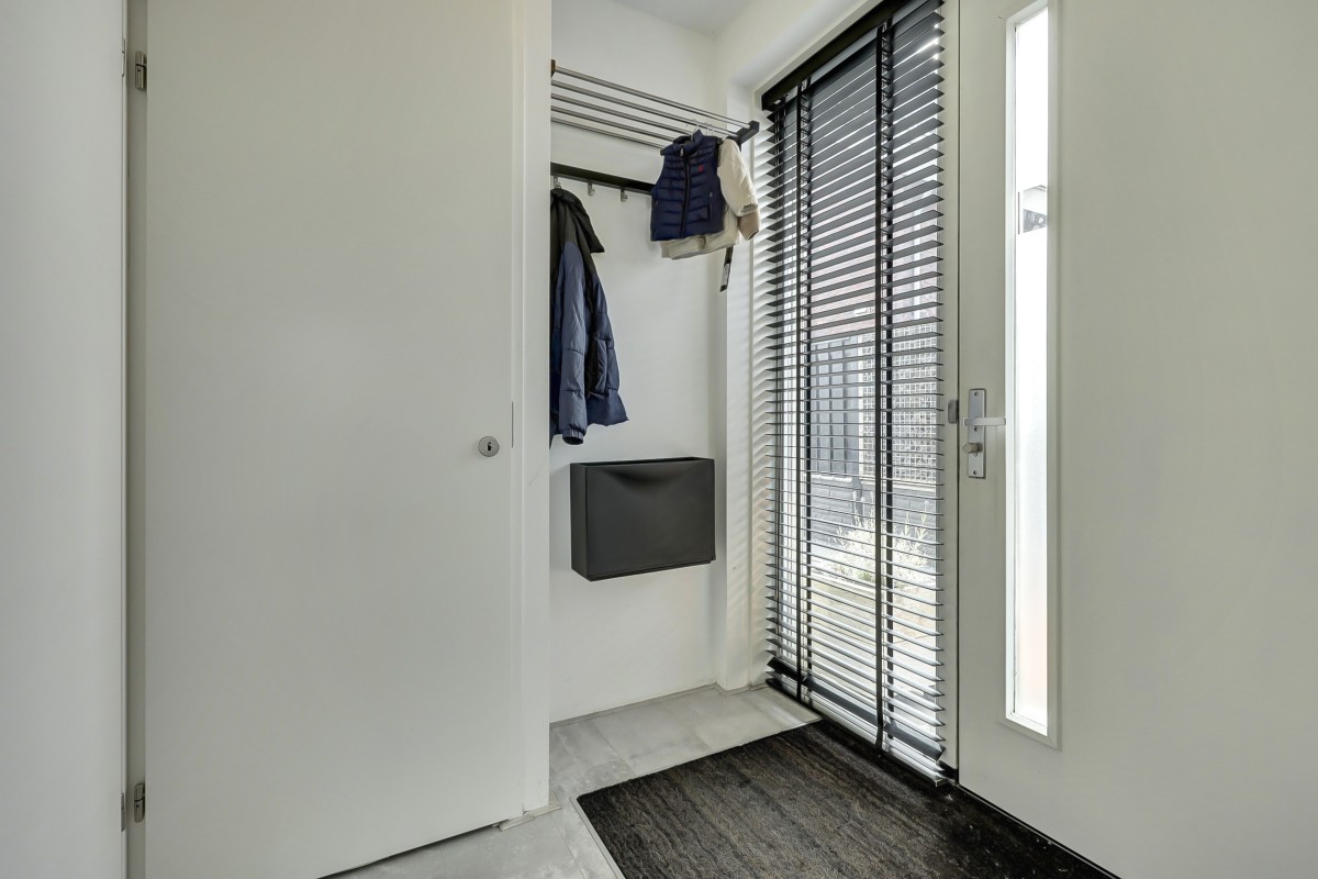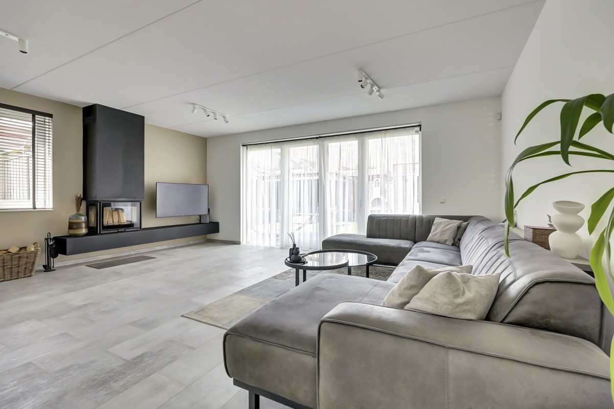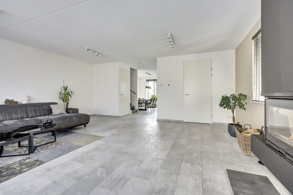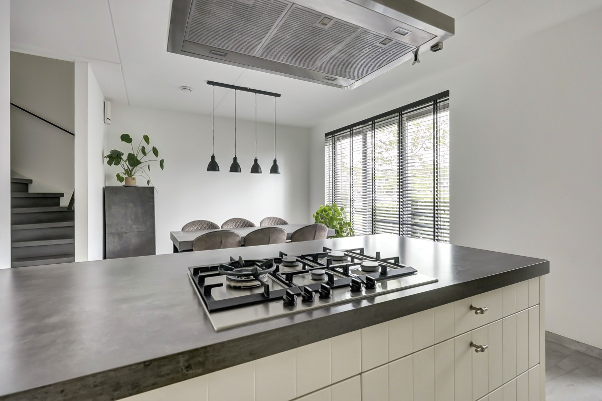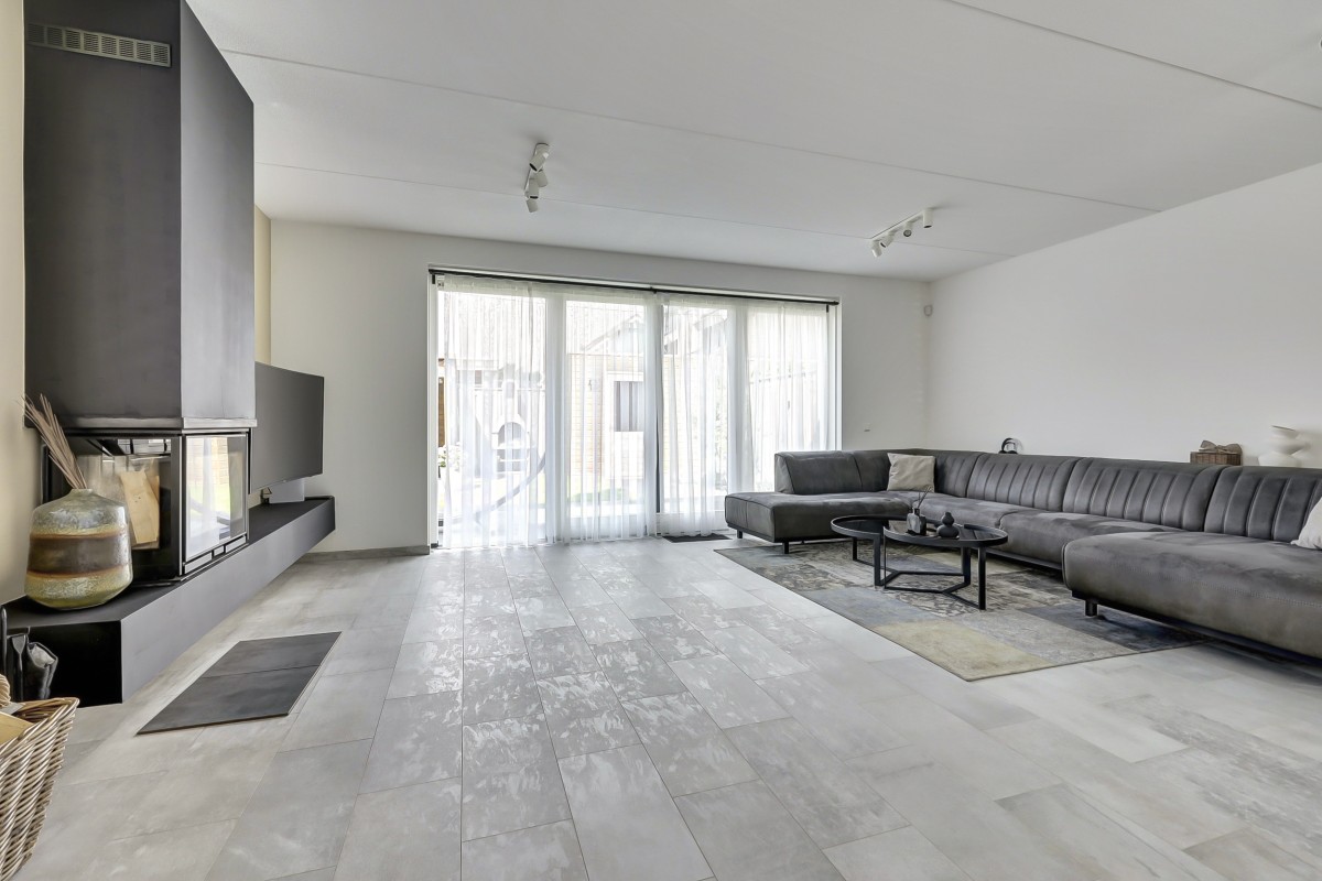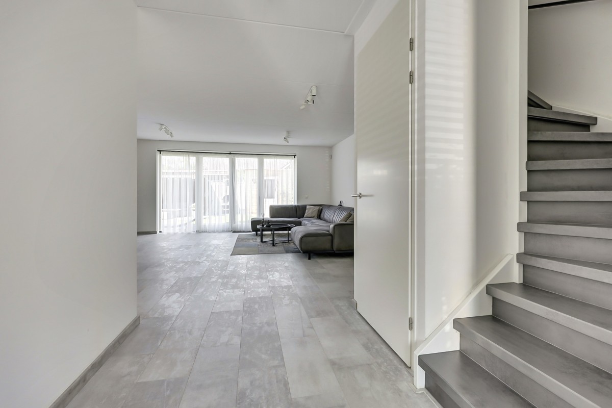 Ground floor: entrance with extensive meter cupboard, wardrobe, luxury toilet room with wall-mounted toilet and washbasin. The large garden-facing living room spans the entire width and features sliding doors and a beautiful fireplace. The large eat-in kitchen is situated at the front of the house, where the luxury built-in kitchen is equipped with a wall of cupboards and a kitchen island. The kitchen features a built-in dishwasher, 5-burner gas hob, refrigerator, freezer, microwave, and oven. Partly due to the width of the house, the dining area is very spacious and is illuminated by beautiful natural light from the street. A large staircase with storage space separates the living and dining areas. This provides the living room with more privacy at the rear. At the back of the house, a wide sliding door provides access to the garden. The garden is well-maintained and low-maintenance, and is also accessible along the side of the house. The garden faces west and features a detached wooden shed and a covered patio. The entire ground floor is equipped with underfloor heating and modern laminate flooring.