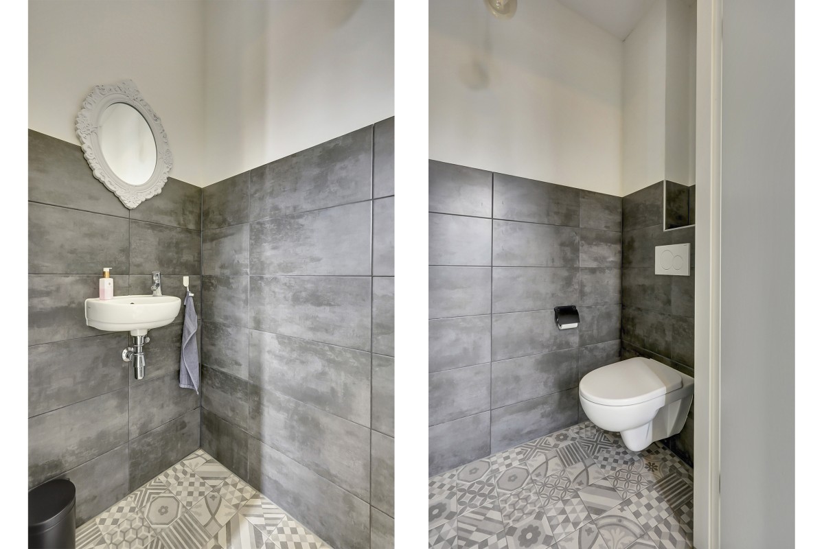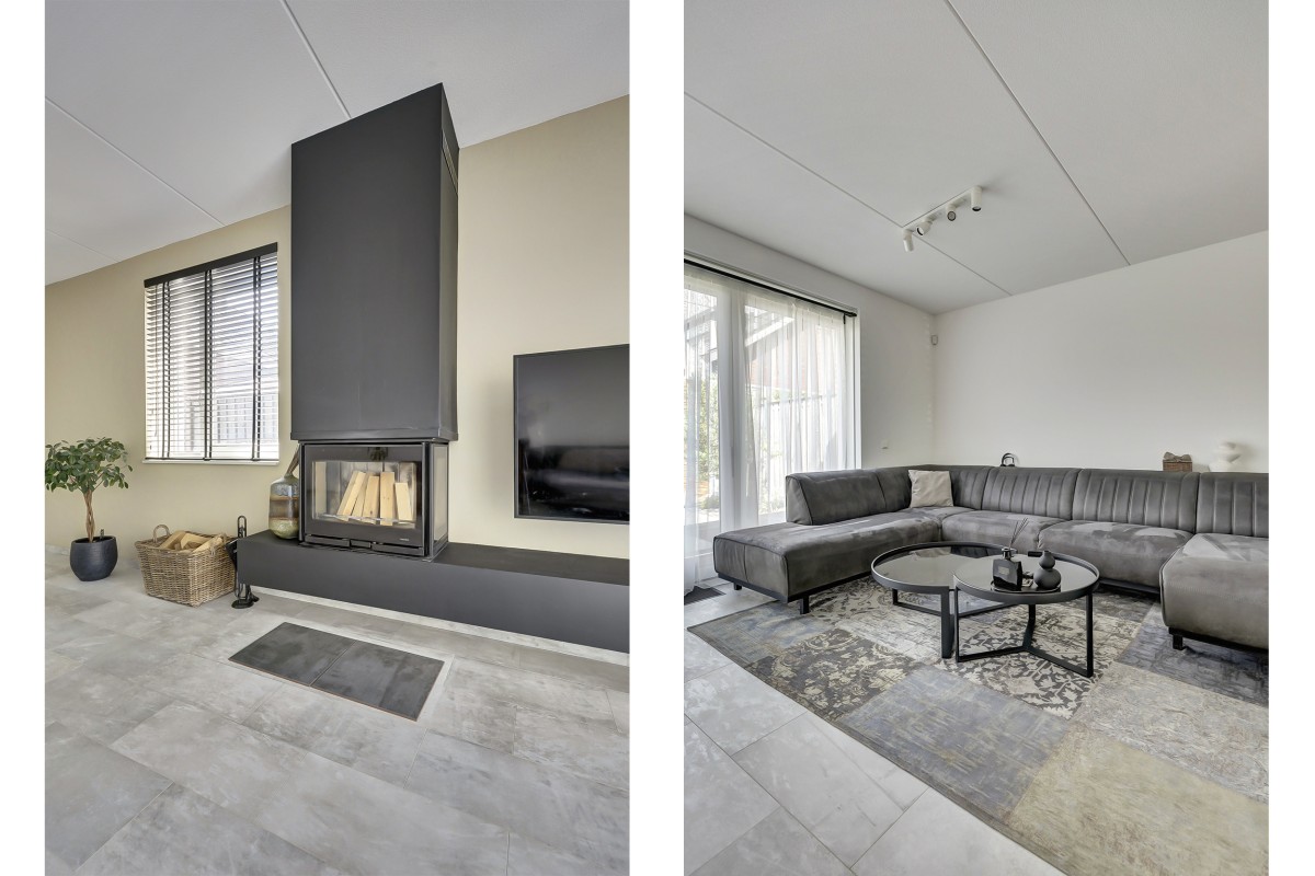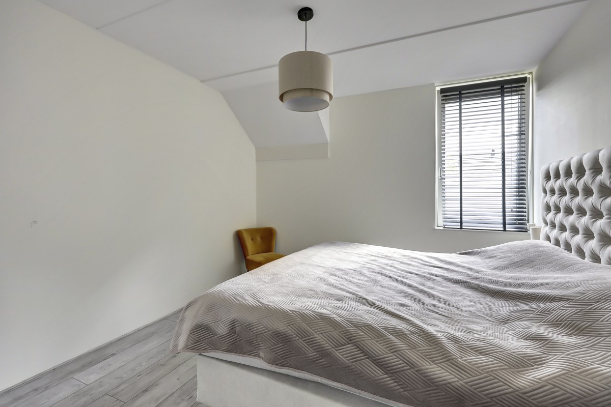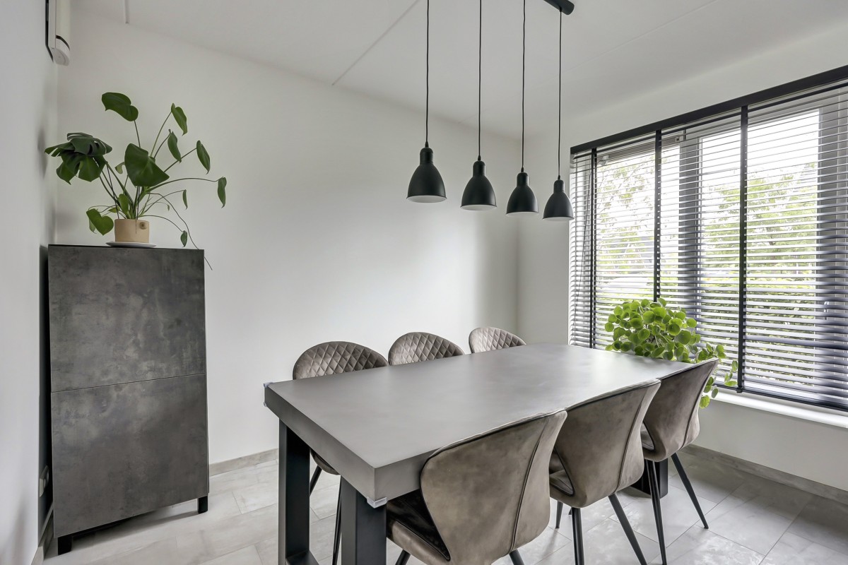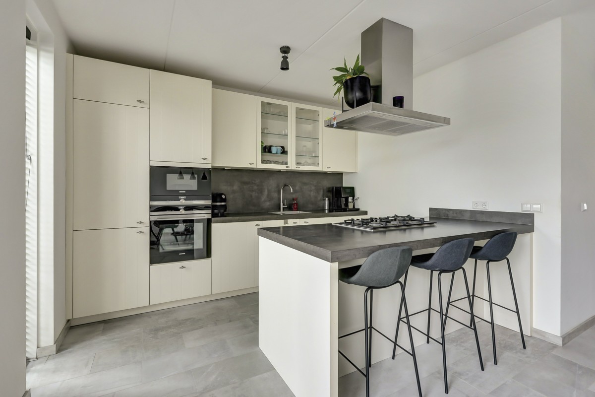 Ground floor: entrance with extensive meter cupboard, wardrobe, luxury toilet room with wall-mounted toilet and washbasin. The large garden-facing living room spans the entire width and features sliding doors and a beautiful fireplace. The large eat-in kitchen is situated at the front of the house, where the luxury built-in kitchen is equipped with a wall of cupboards and a kitchen island. The kitchen features a built-in dishwasher, 5-burner gas hob, refrigerator, freezer, microwave, and oven. Partly due to the width of the house, the dining area is very spacious and is illuminated by beautiful natural light from the street. A large staircase with storage space separates the living and dining areas. This provides the living room with more privacy at the rear. At the back of the house, a wide sliding door provides access to the garden. The garden is well-maintained and low-maintenance, and is also accessible along the side of the house. The garden faces west and features a detached wooden shed and a covered patio. The entire ground floor is equipped with underfloor heating and modern laminate flooring.
